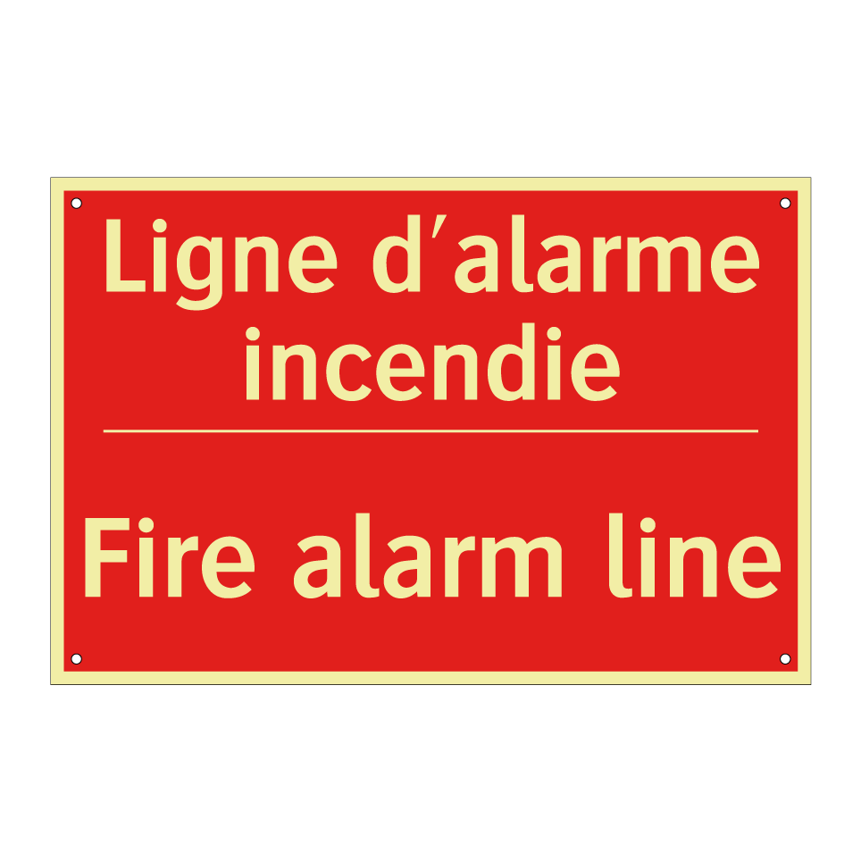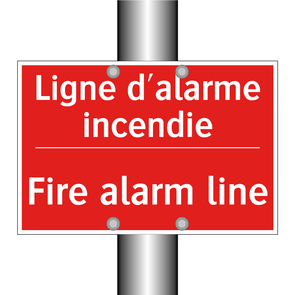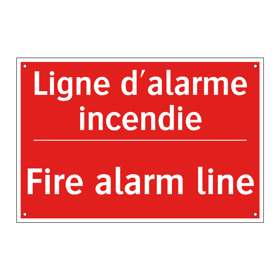 Panneau de signalisation incendie bilingue avec texte en français : "Ligne d'alarme incendie", et en anglais : "Fire alarm line"