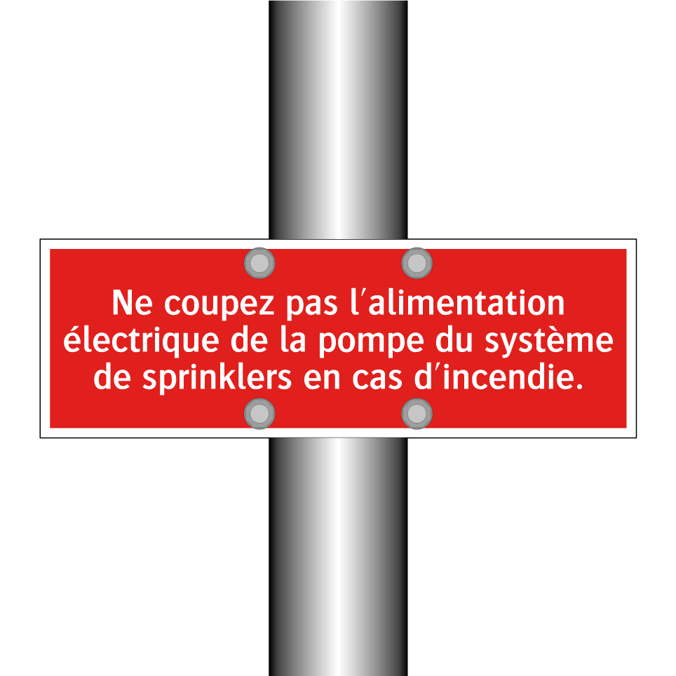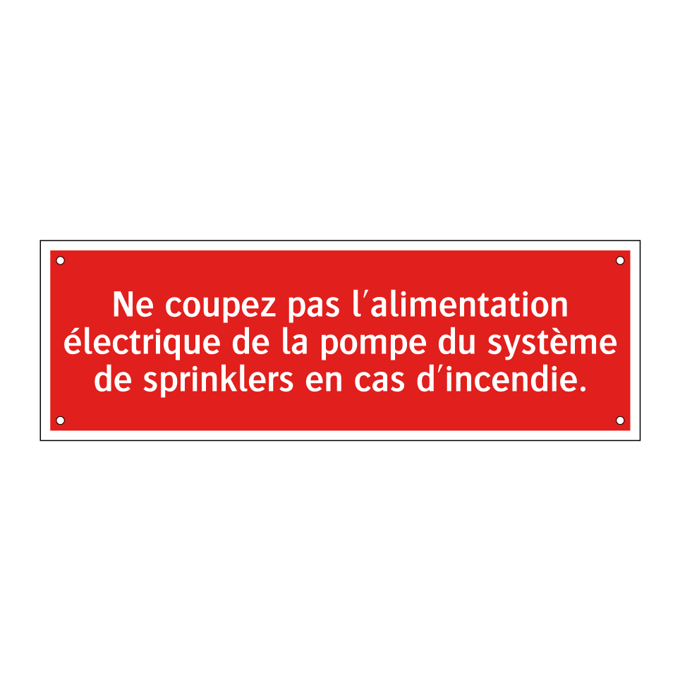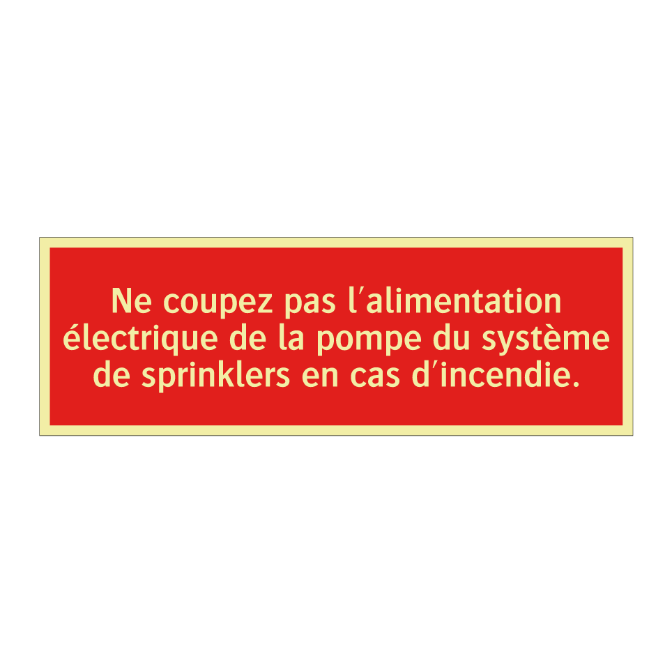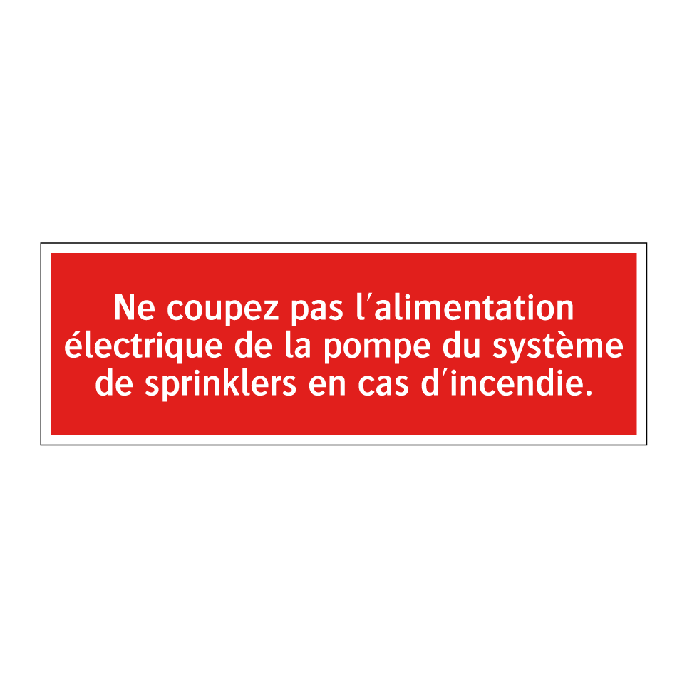 Panneau de signalisation incendie avec le texte Ne coupez pas l'alimentation électrique de la pompe du système de sprinklers en cas d'incendie.