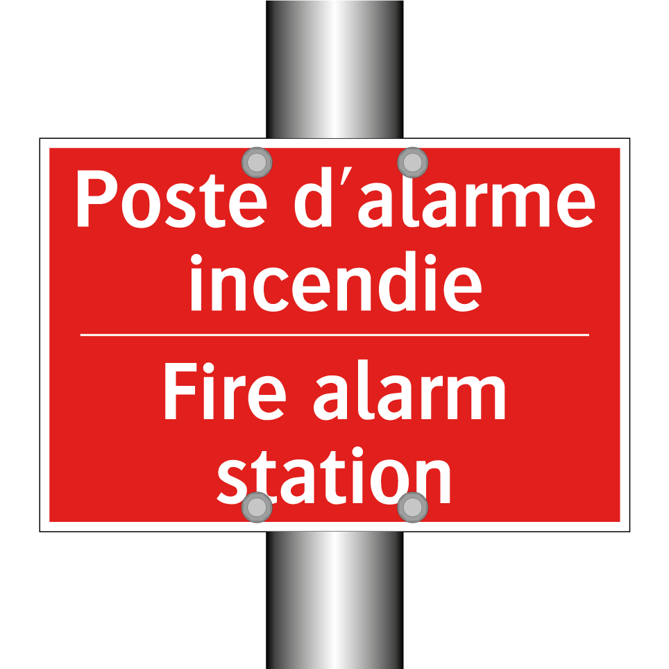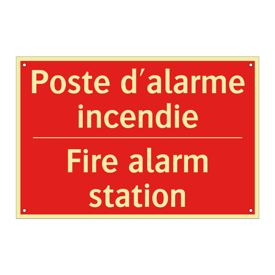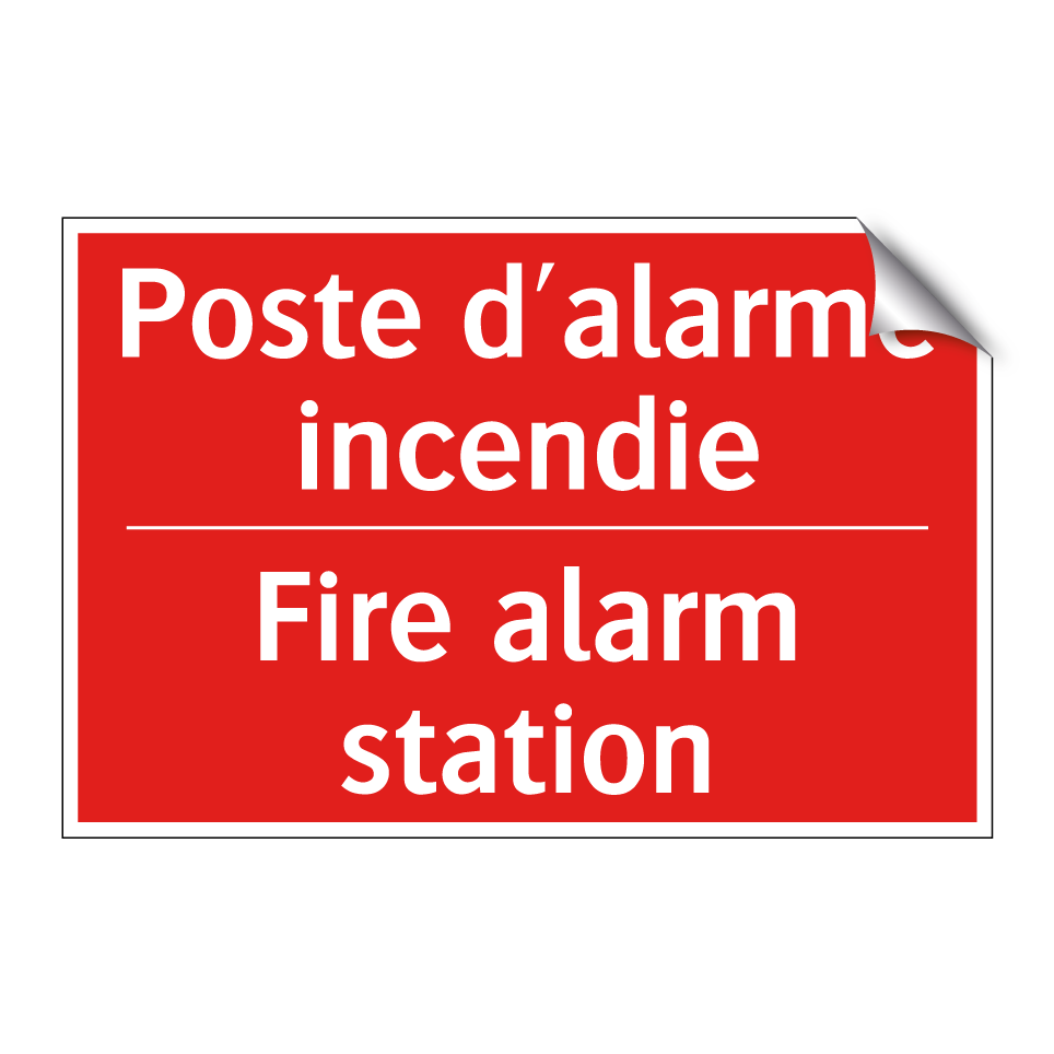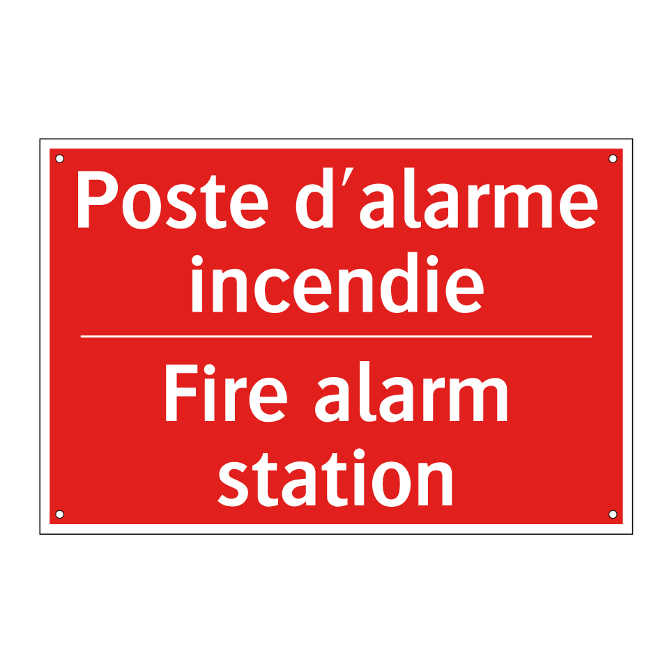 Panneau de signalisation incendie bilingue avec texte en français : "Poste d'alarme incendie", et en anglais : "Fire alarm station"