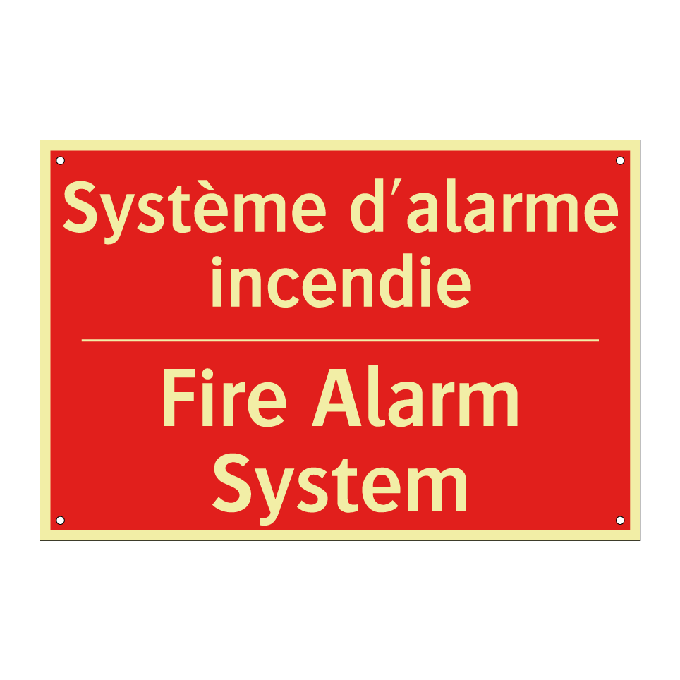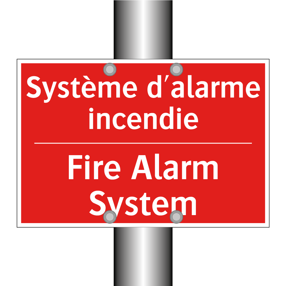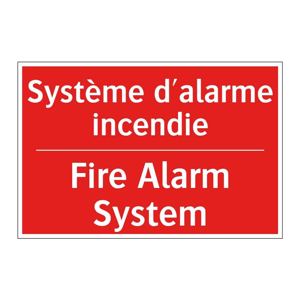 Panneau de signalisation incendie bilingue avec texte en français : "Système d'alarme incendie", et en anglais : "Fire Alarm System"