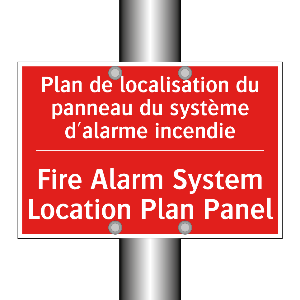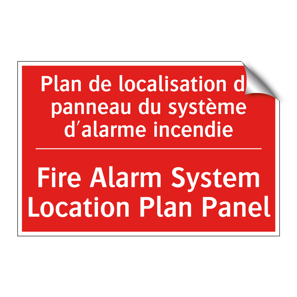 Panneau de signalisation incendie bilingue avec texte en français : "Plan de localisation du panneau du système d'alarme incendie", et en anglais : "Fire Alarm System Location Plan Panel"