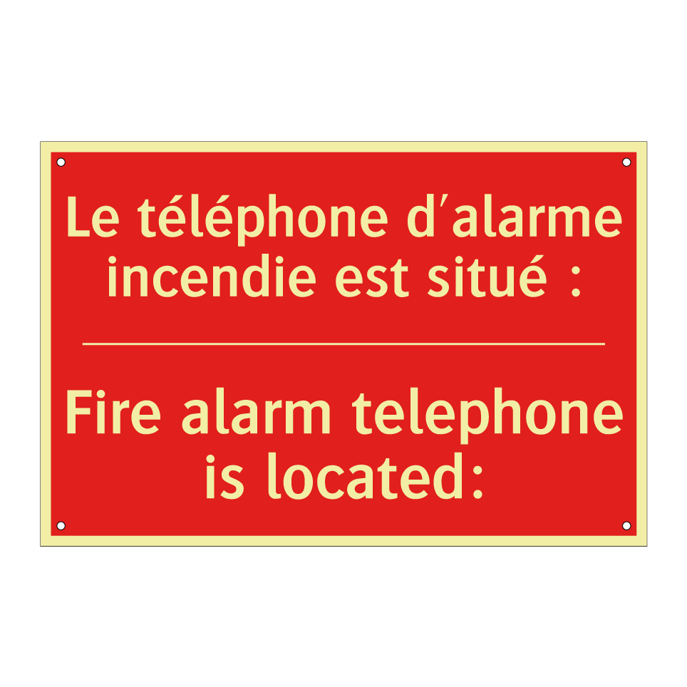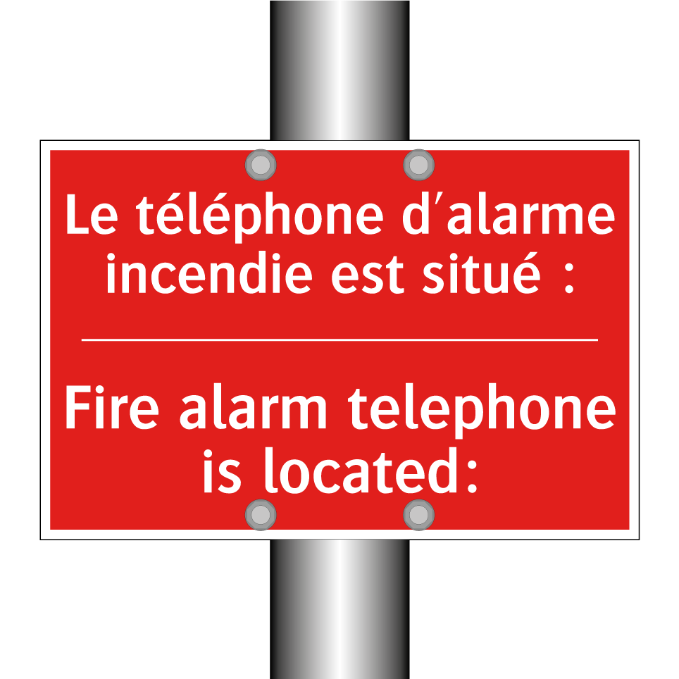 Panneau de signalisation incendie bilingue avec texte en français : "Le téléphone d'alarme incendie est situé :", et en anglais : "Fire alarm telephone is located:"