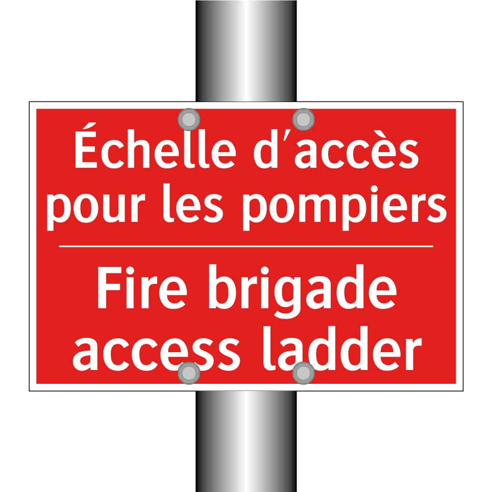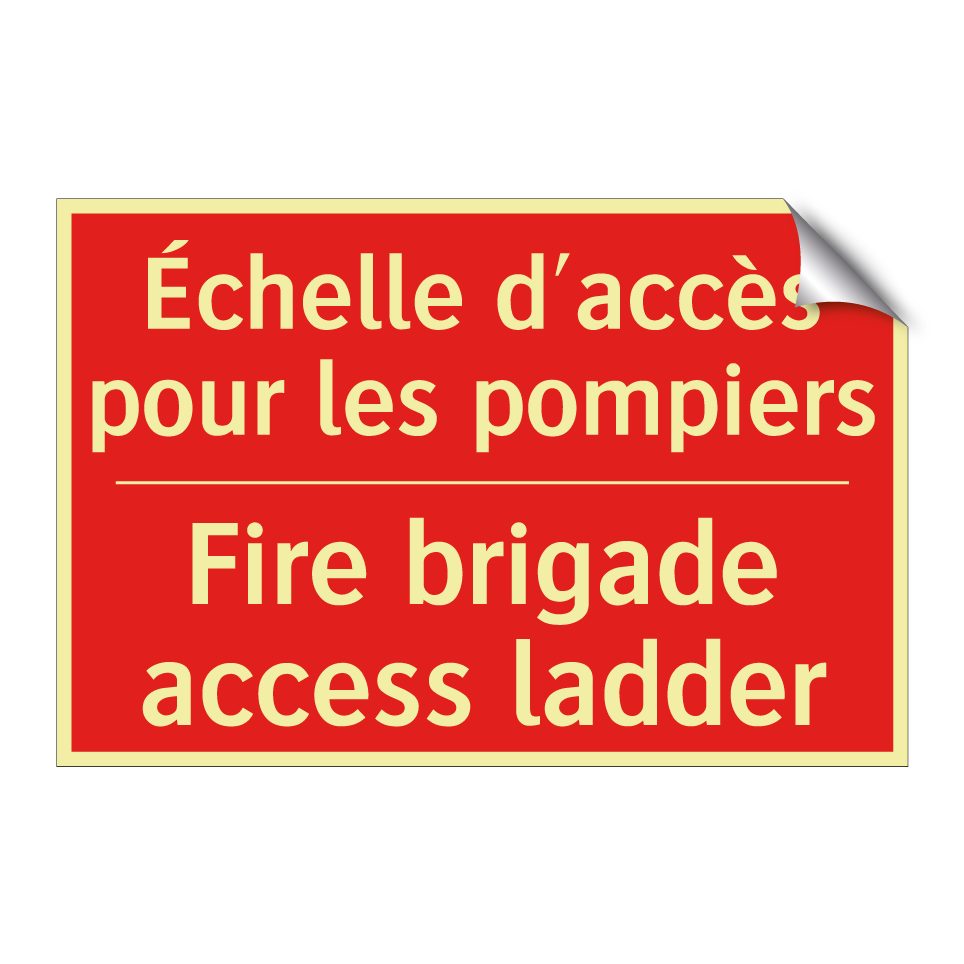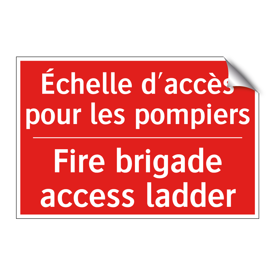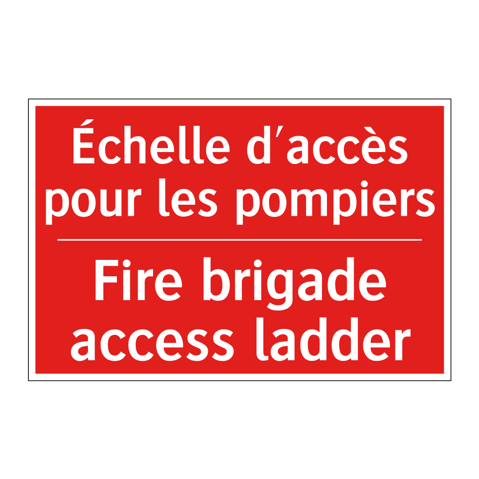 Panneau de signalisation incendie bilingue avec texte en français : "Échelle d'accès pour les pompiers", et en anglais : "Fire brigade access ladder"
