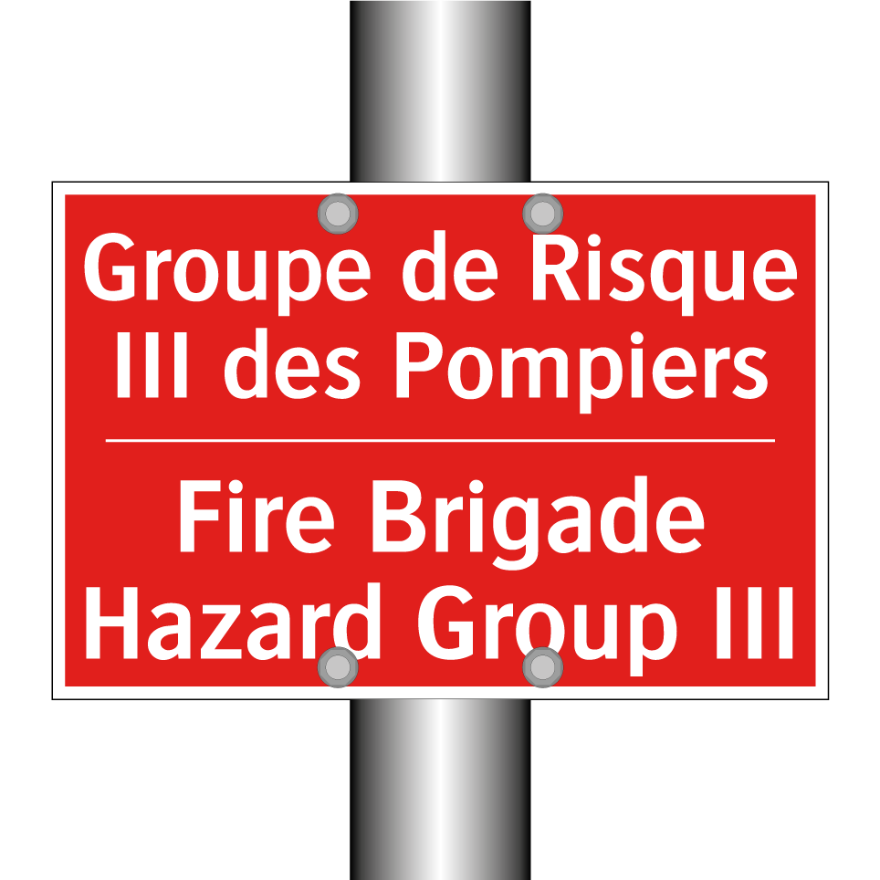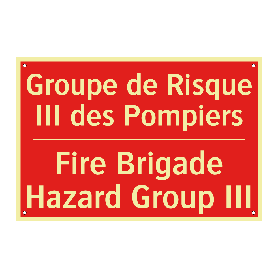 Panneau de signalisation incendie bilingue avec texte en français : "Groupe de Risque III des Pompiers", et en anglais : "Fire Brigade Hazard Group III"