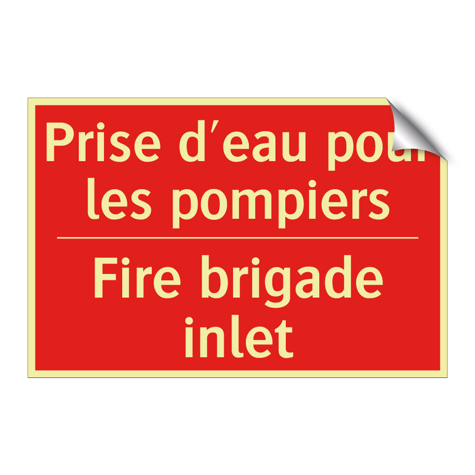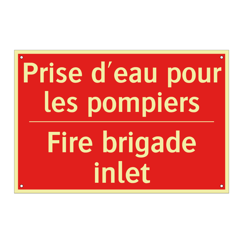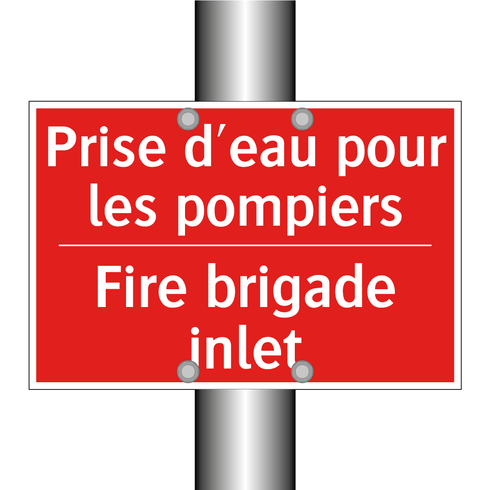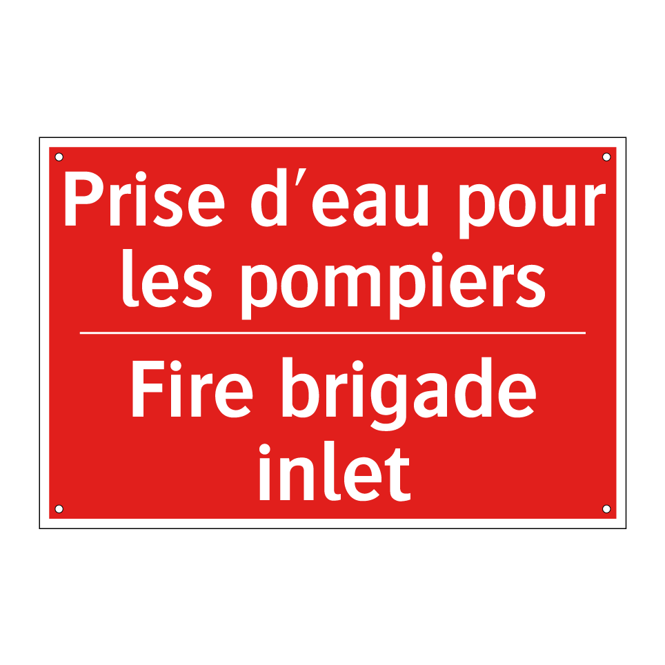 Panneau de signalisation incendie bilingue avec texte en français : "Prise d'eau pour les pompiers", et en anglais : "Fire brigade inlet"