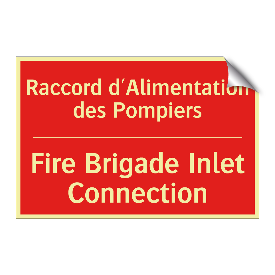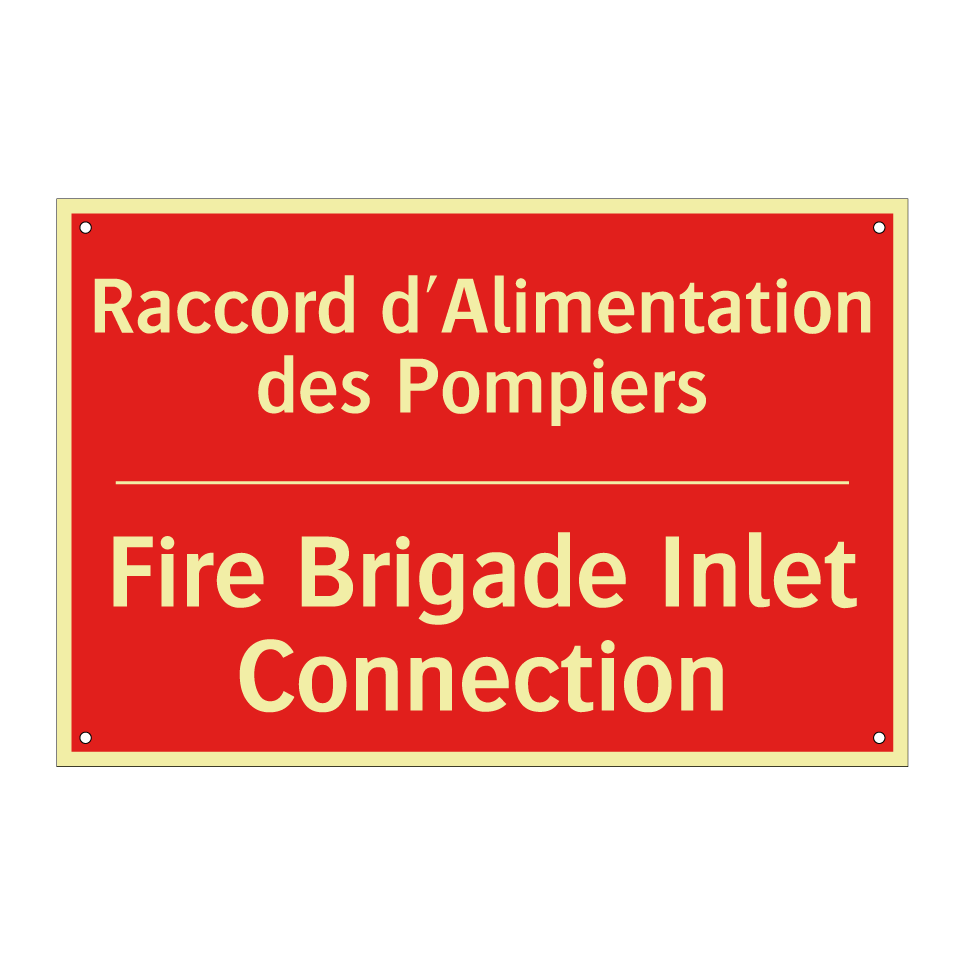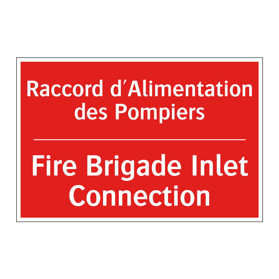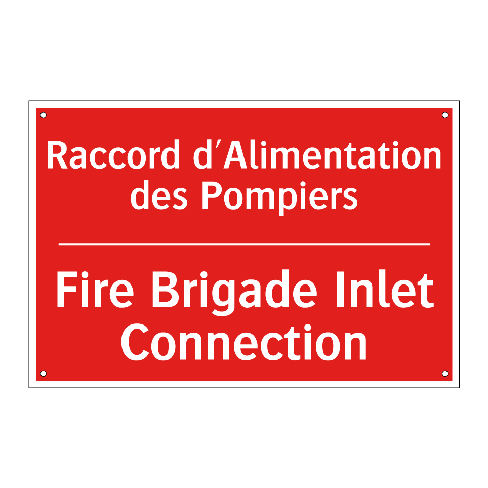 Panneau de signalisation incendie bilingue avec texte en français : "Raccord d'Alimentation des Pompiers", et en anglais : "Fire Brigade Inlet Connection"