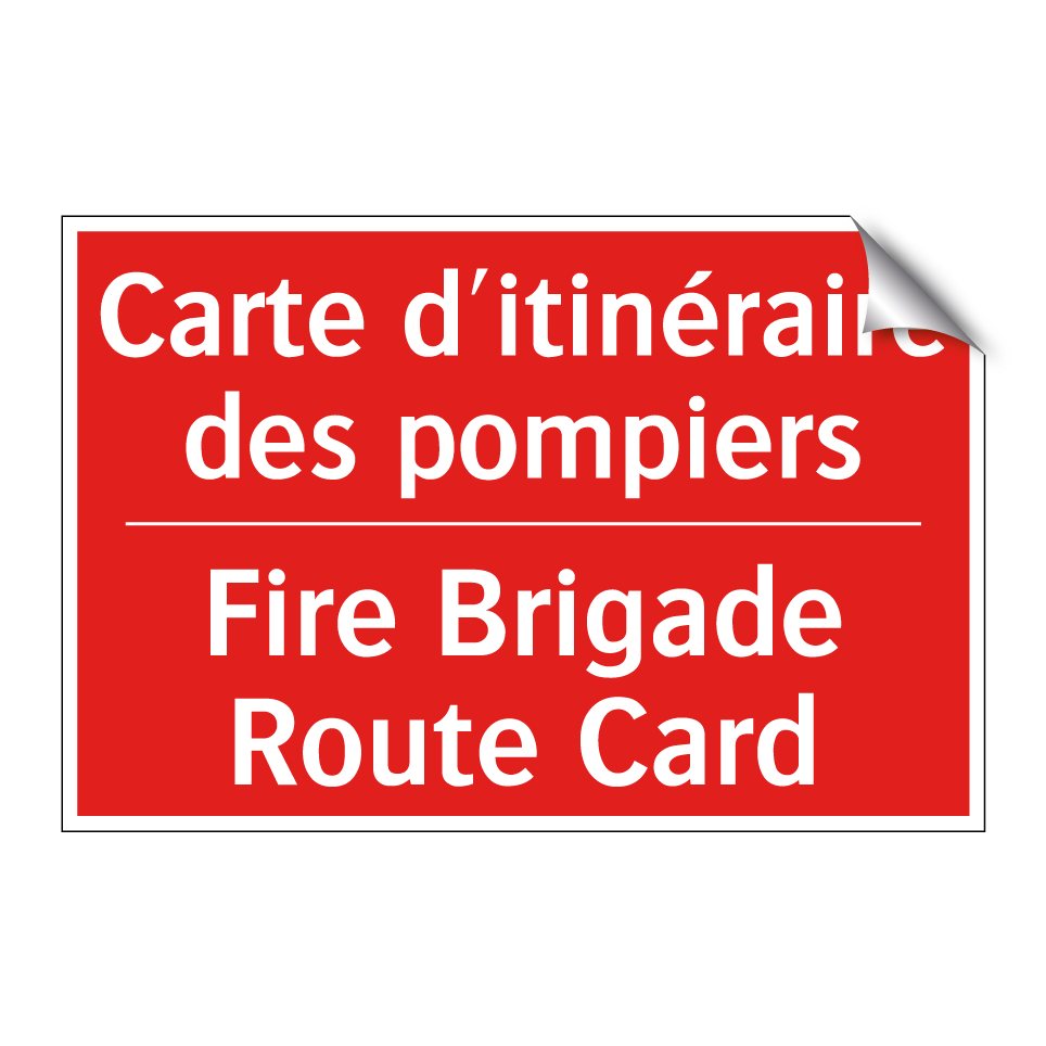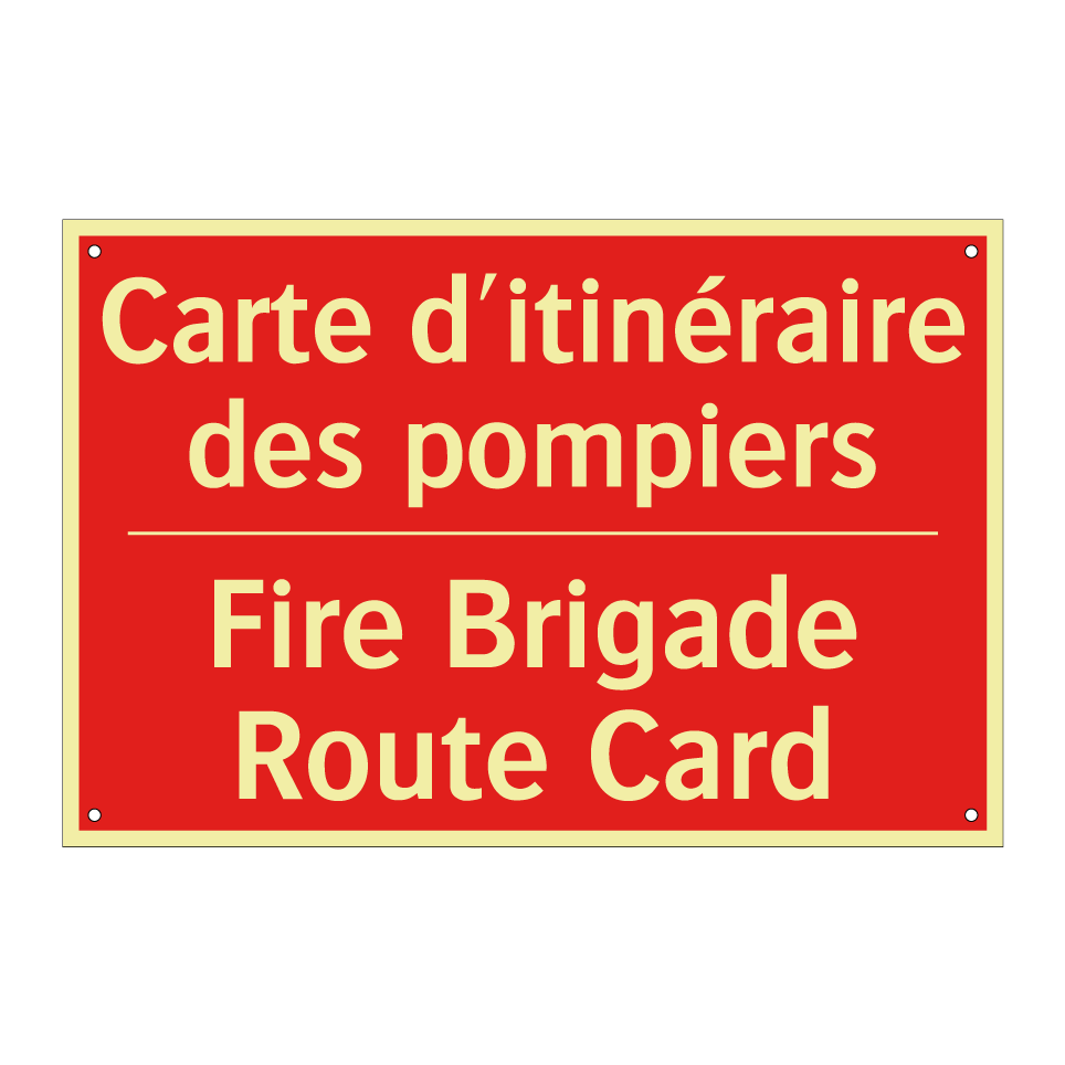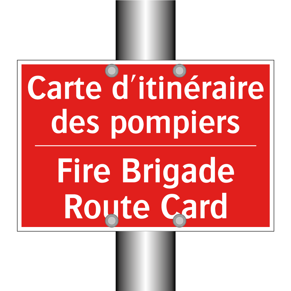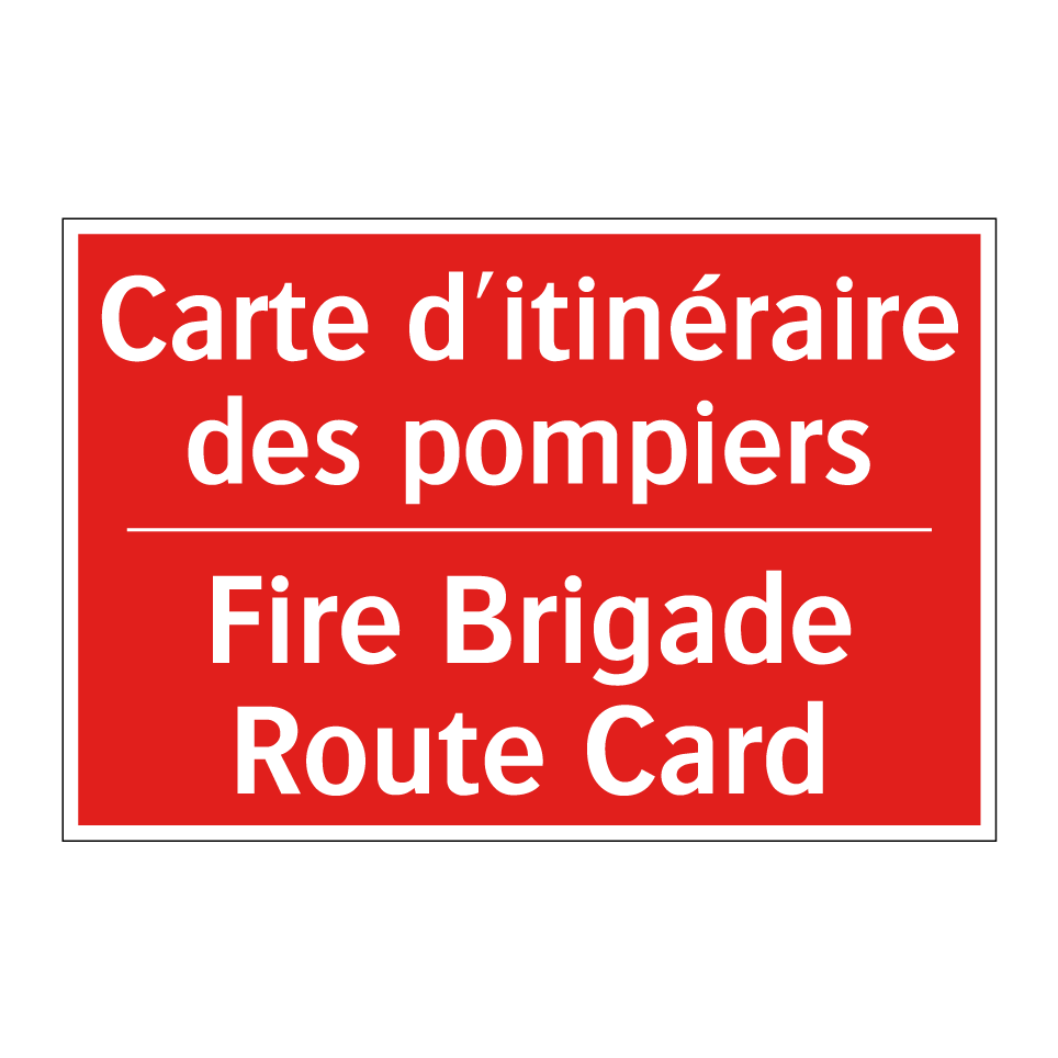 Panneau de signalisation incendie bilingue avec texte en français : "Carte d'itinéraire des pompiers", et en anglais : "Fire Brigade Route Card"