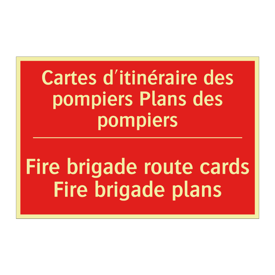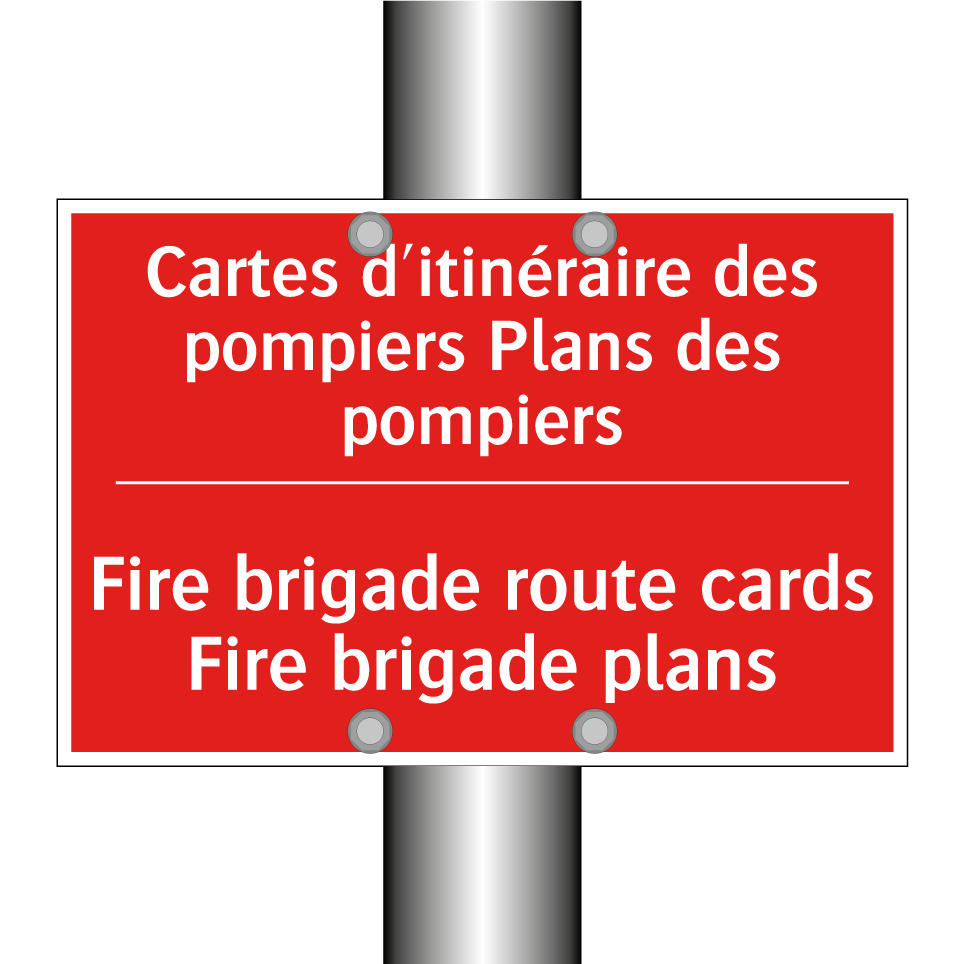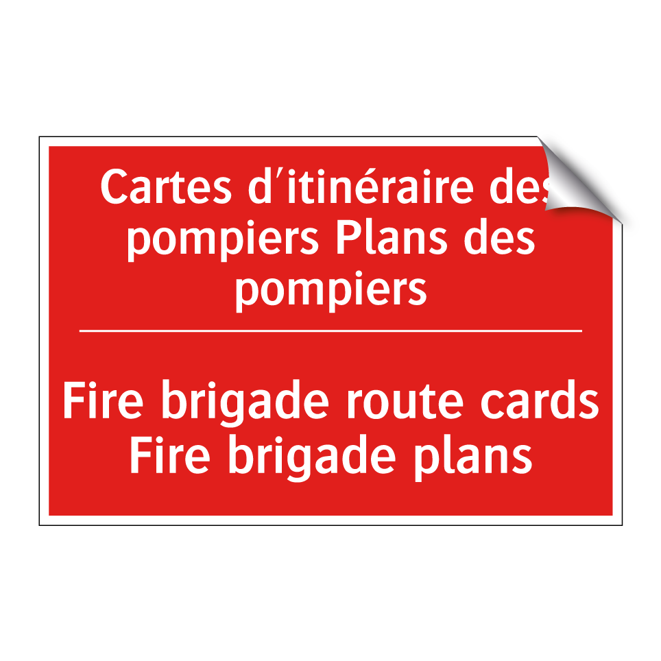Panneau de signalisation incendie bilingue avec texte en français : "Cartes d'itinéraire des pompiers Plans des pompiers", et en anglais : "Fire brigade route cards Fire brigade plans"