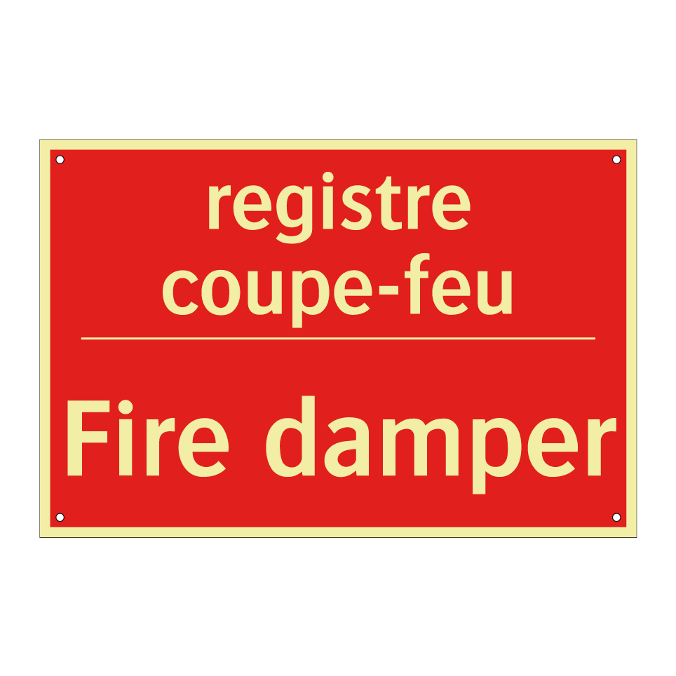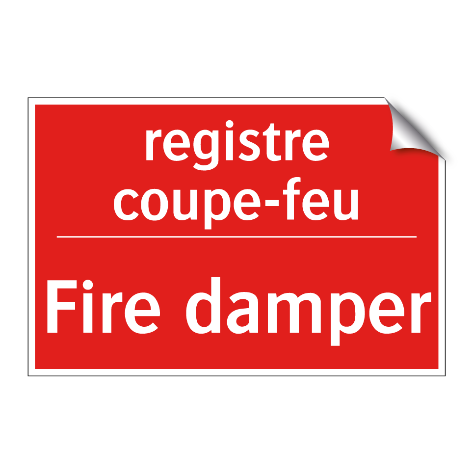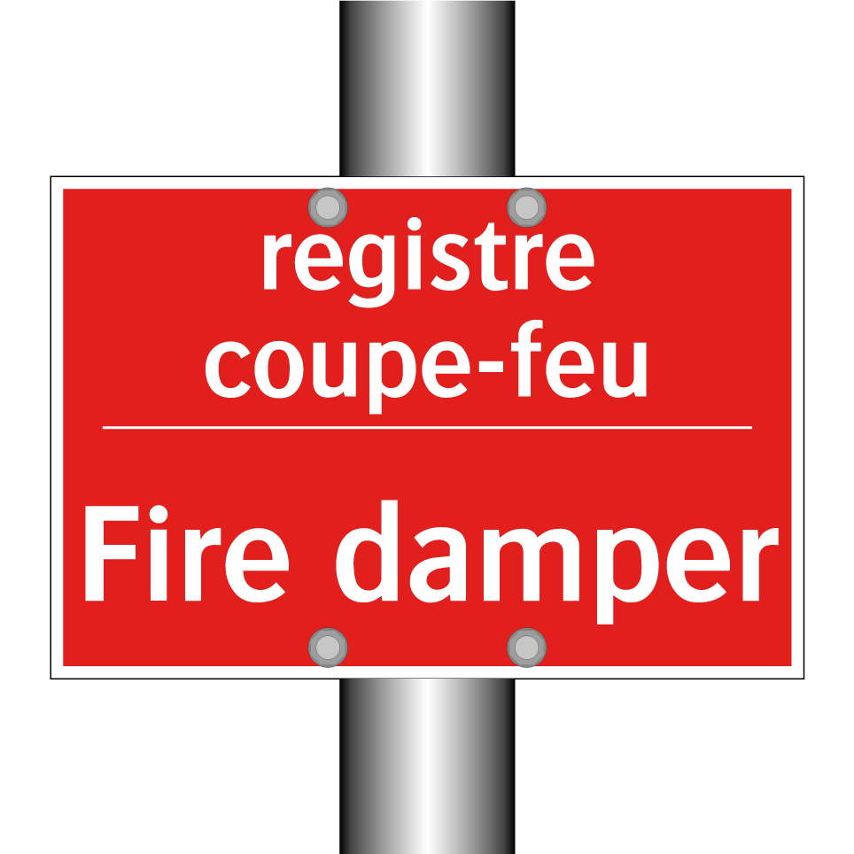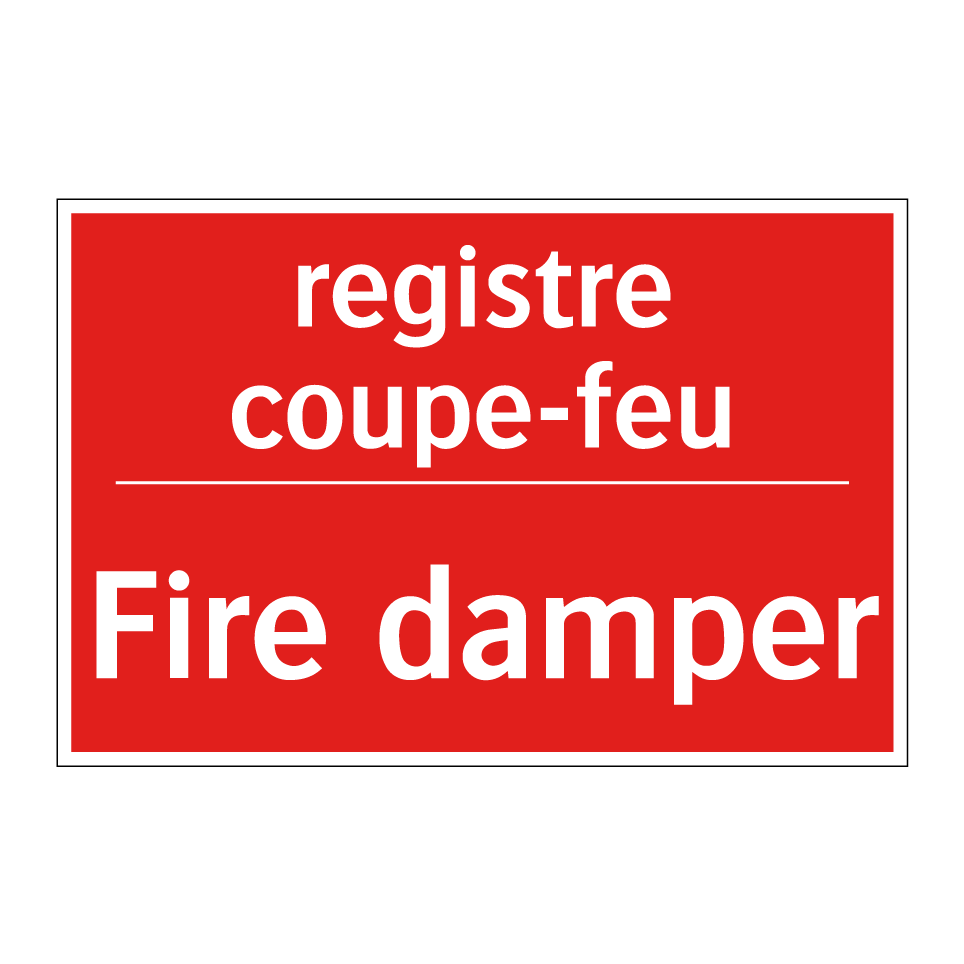 Panneau de signalisation incendie bilingue avec texte en français : "registre coupe-feu", et en anglais : "Fire damper"