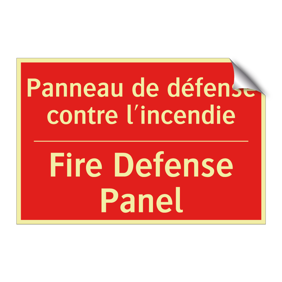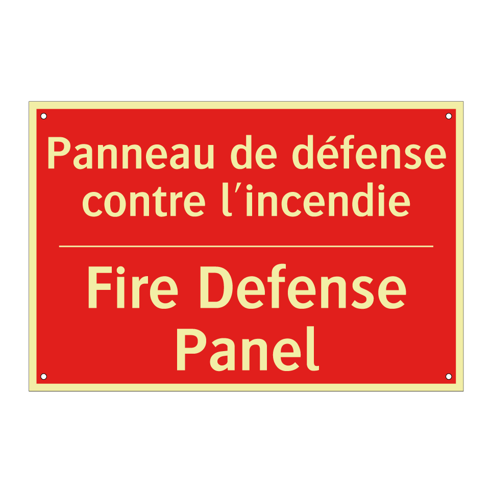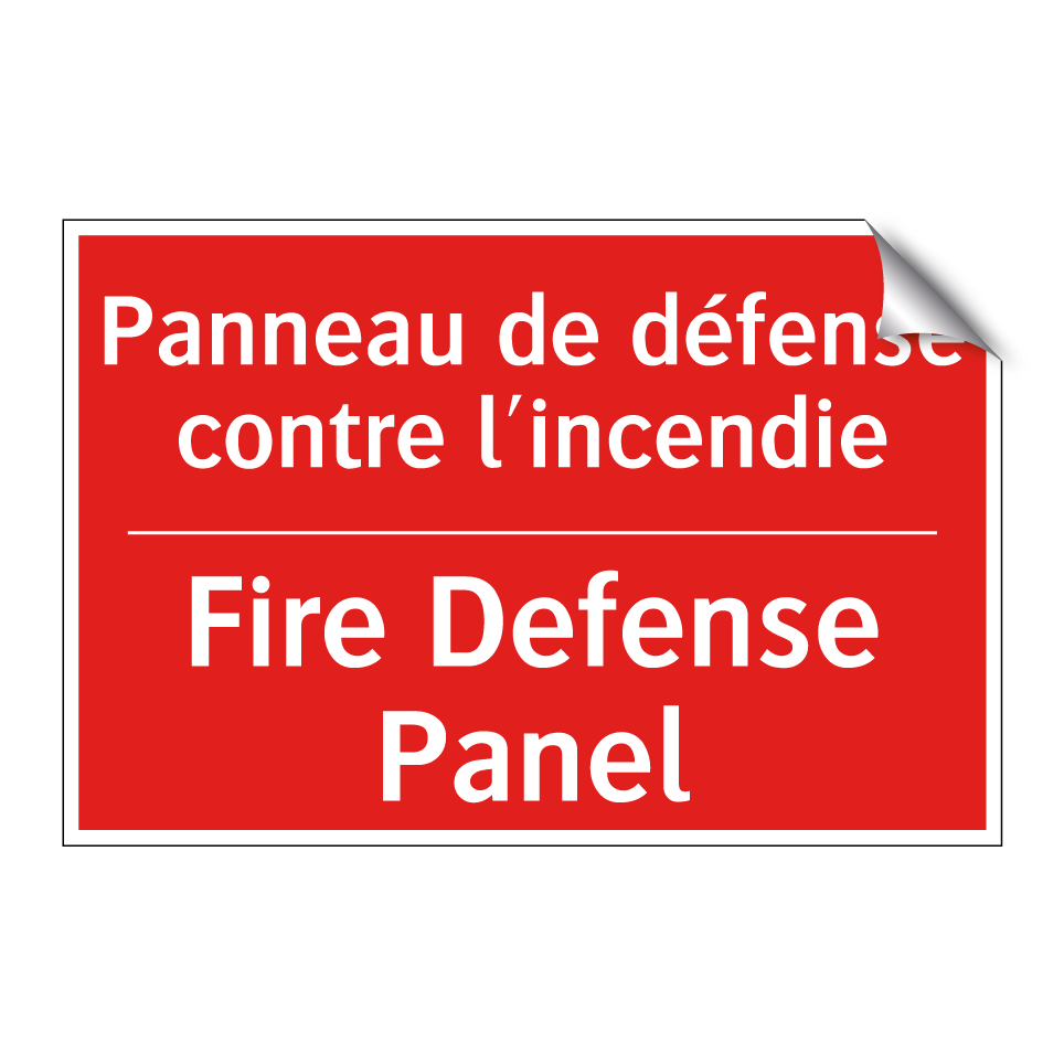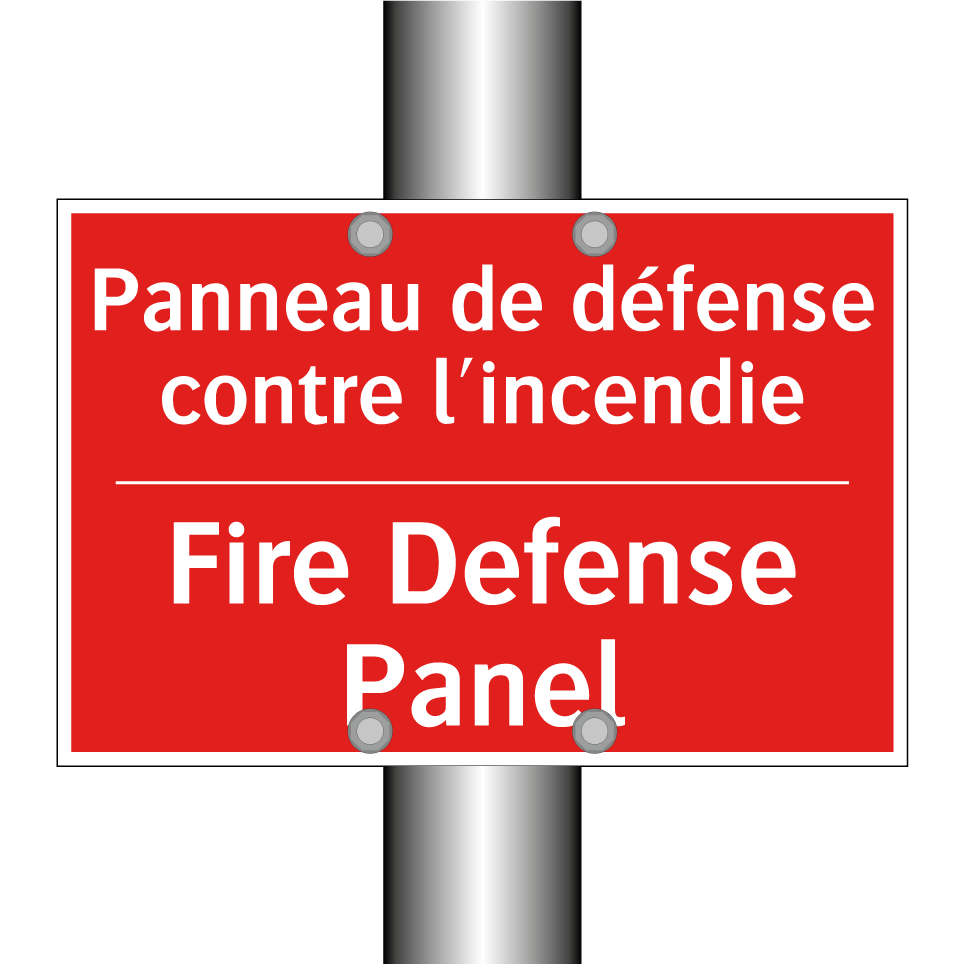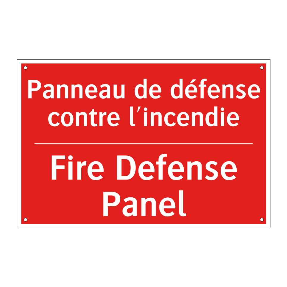 Panneau de signalisation incendie bilingue avec texte en français : "Panneau de défense contre l'incendie", et en anglais : "Fire Defense Panel"