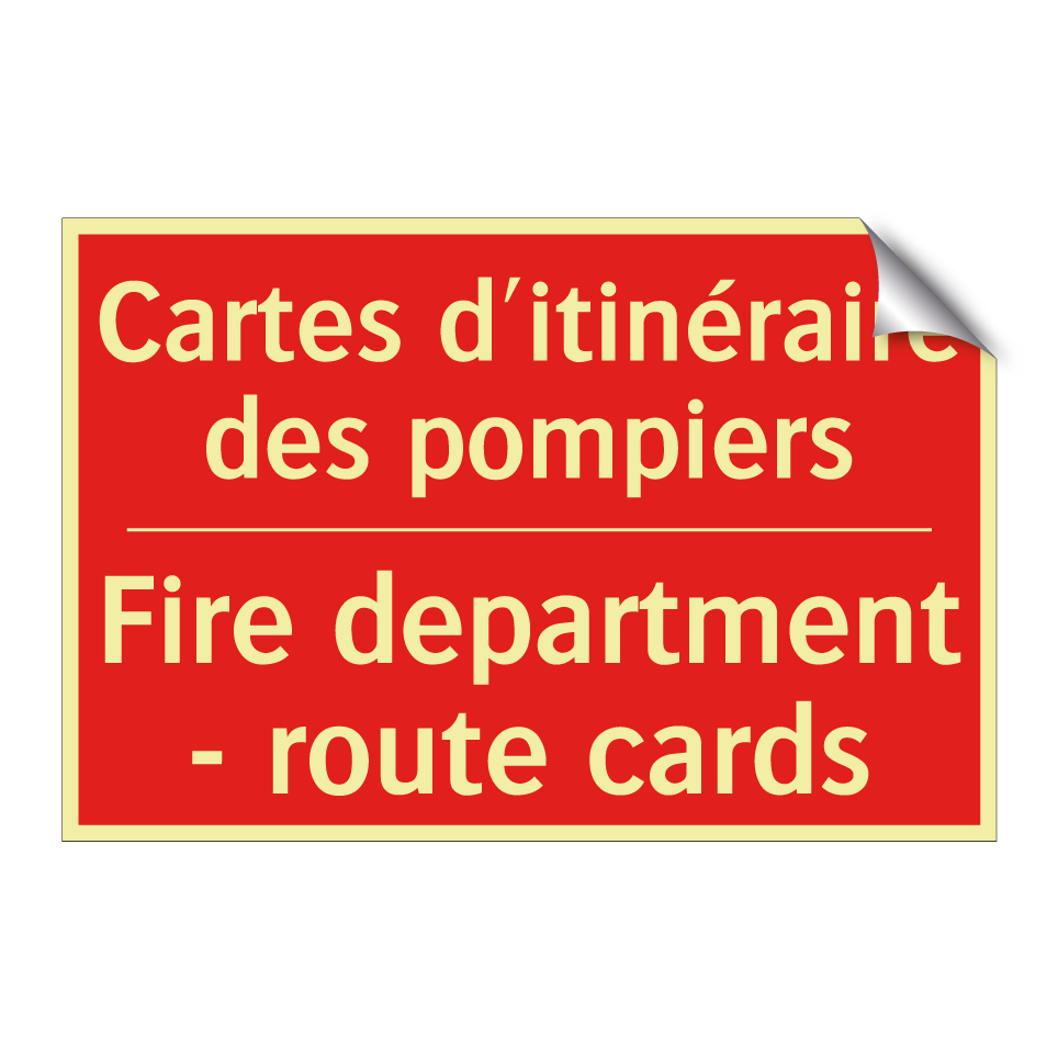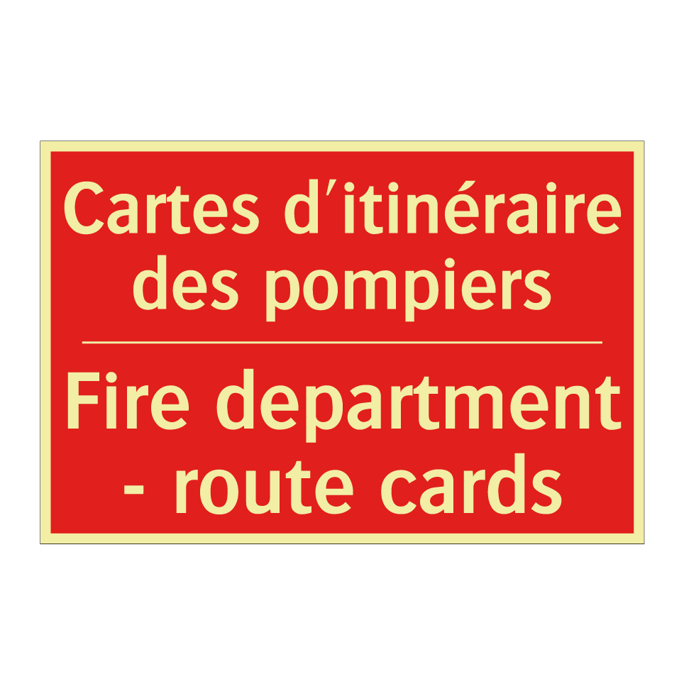Panneau de signalisation incendie bilingue avec texte en français : "Cartes d'itinéraire des pompiers", et en anglais : "Fire department - route cards"