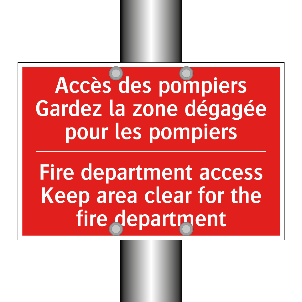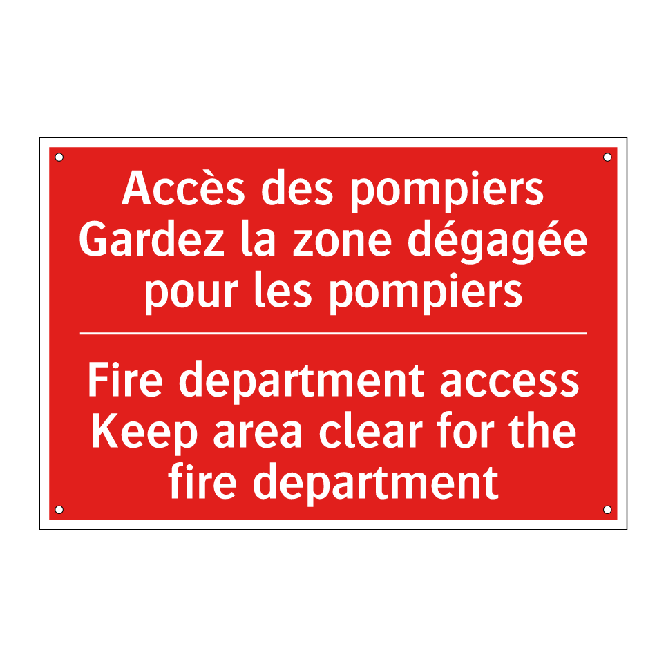 Panneau de signalisation incendie bilingue avec texte en français : "Accès des pompiers Gardez la zone dégagée pour les pompiers", et en anglais : "Fire department access Keep area clear for the fire department"