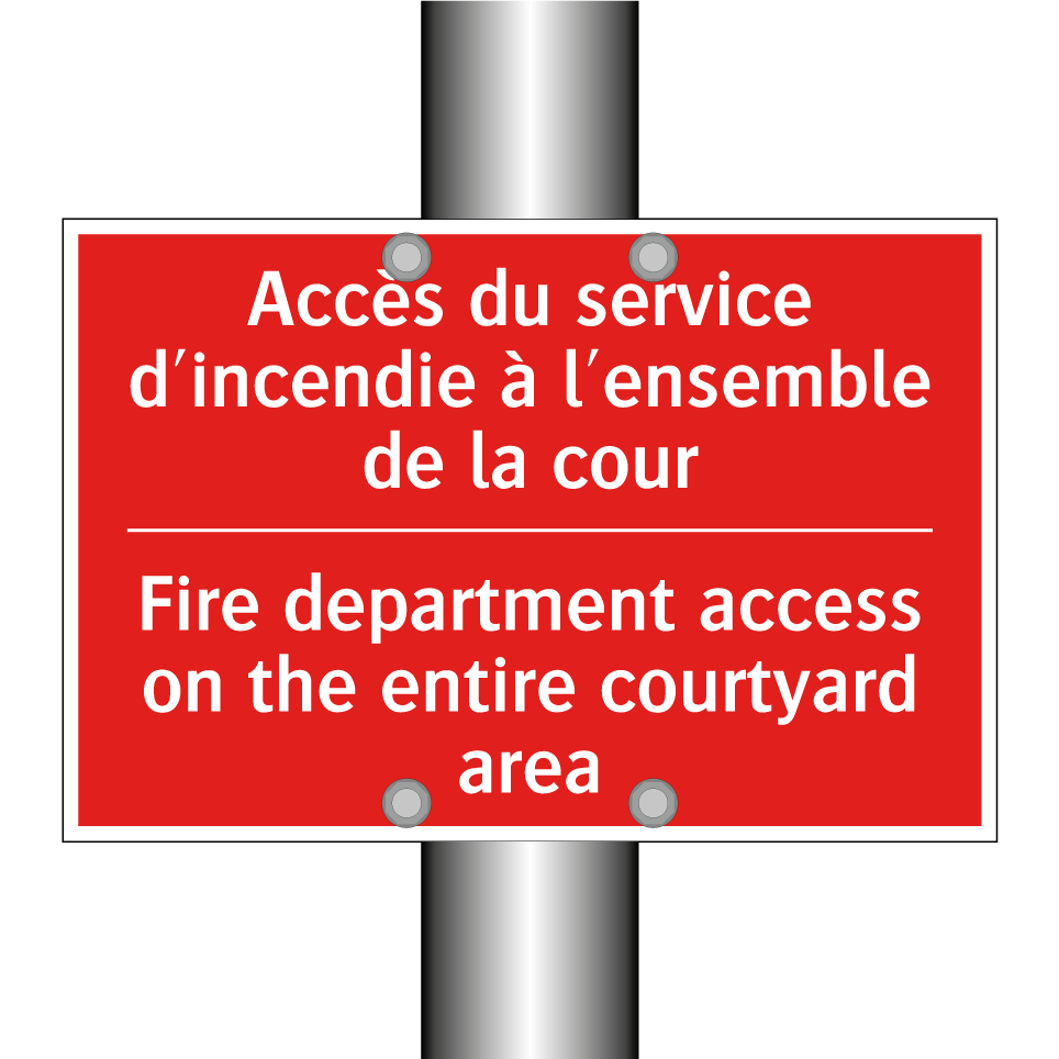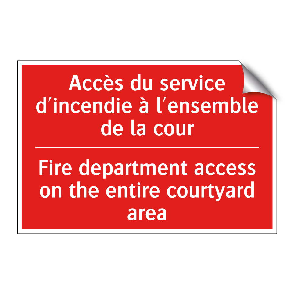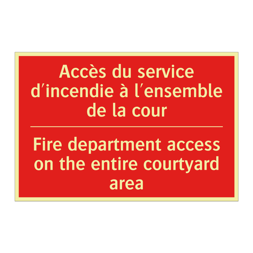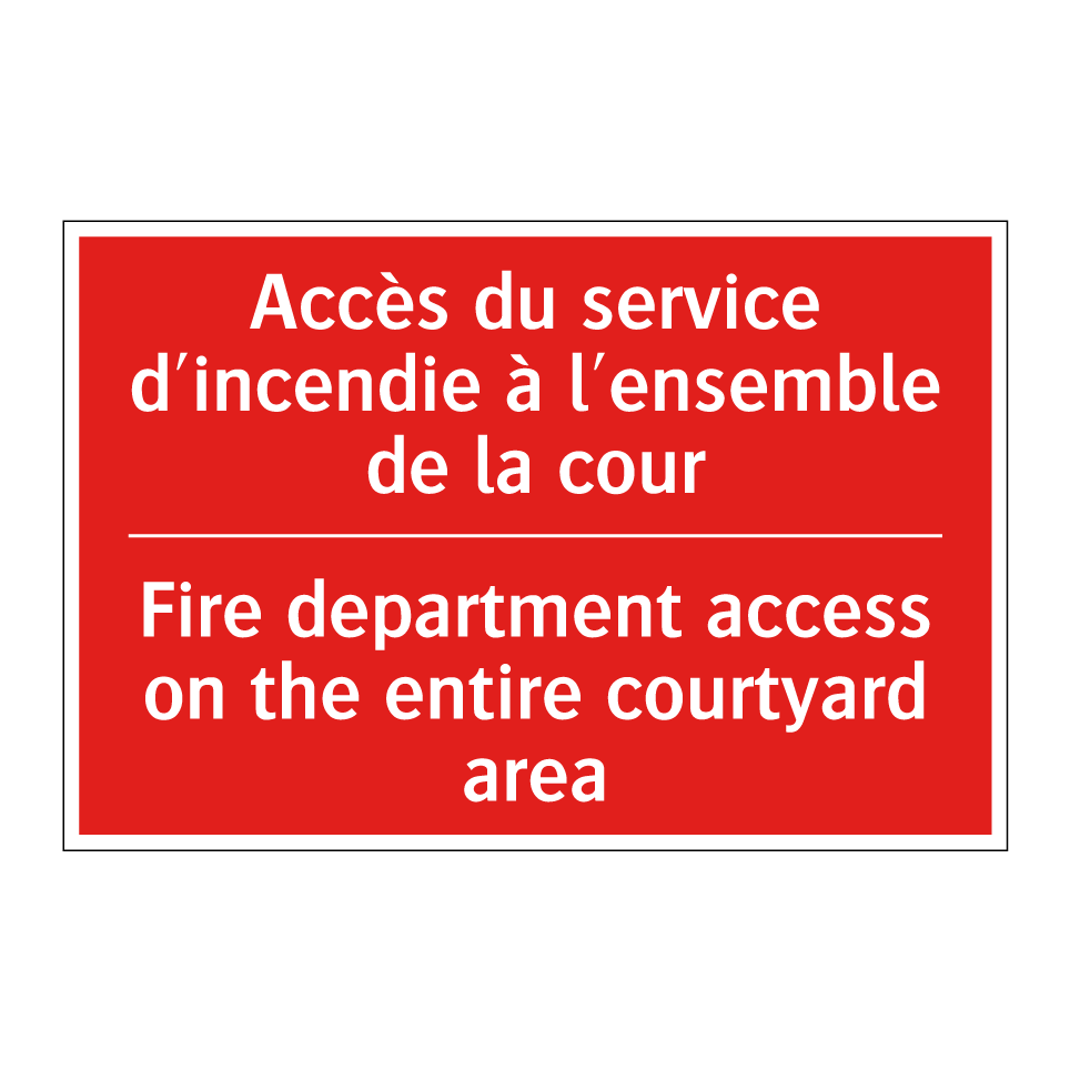 Panneau de signalisation incendie bilingue avec texte en français : "Accès du service d'incendie à l'ensemble de la cour", et en anglais : "Fire department access on the entire courtyard area"