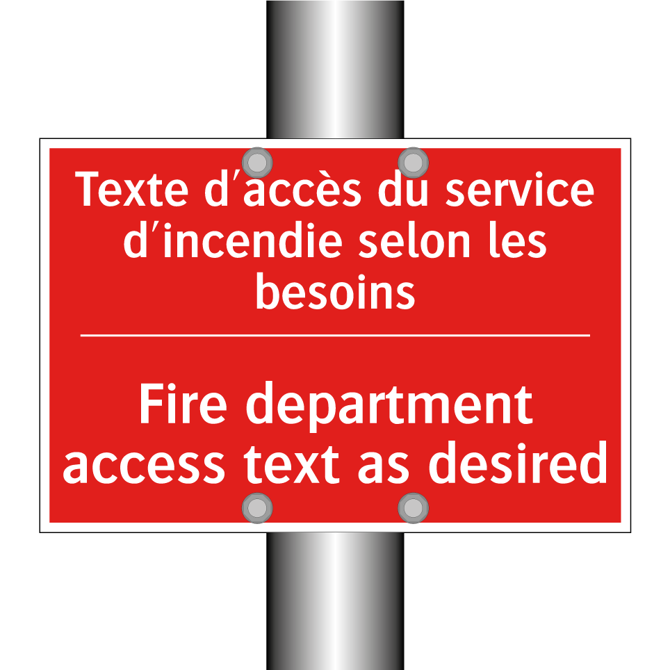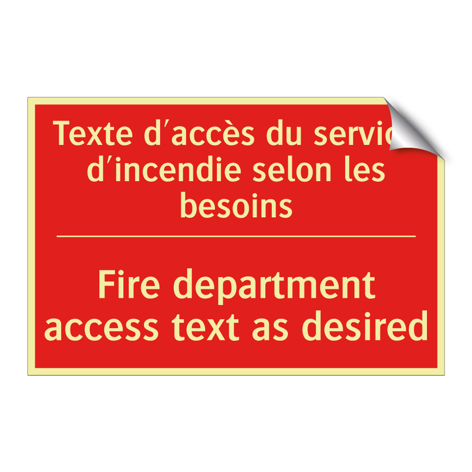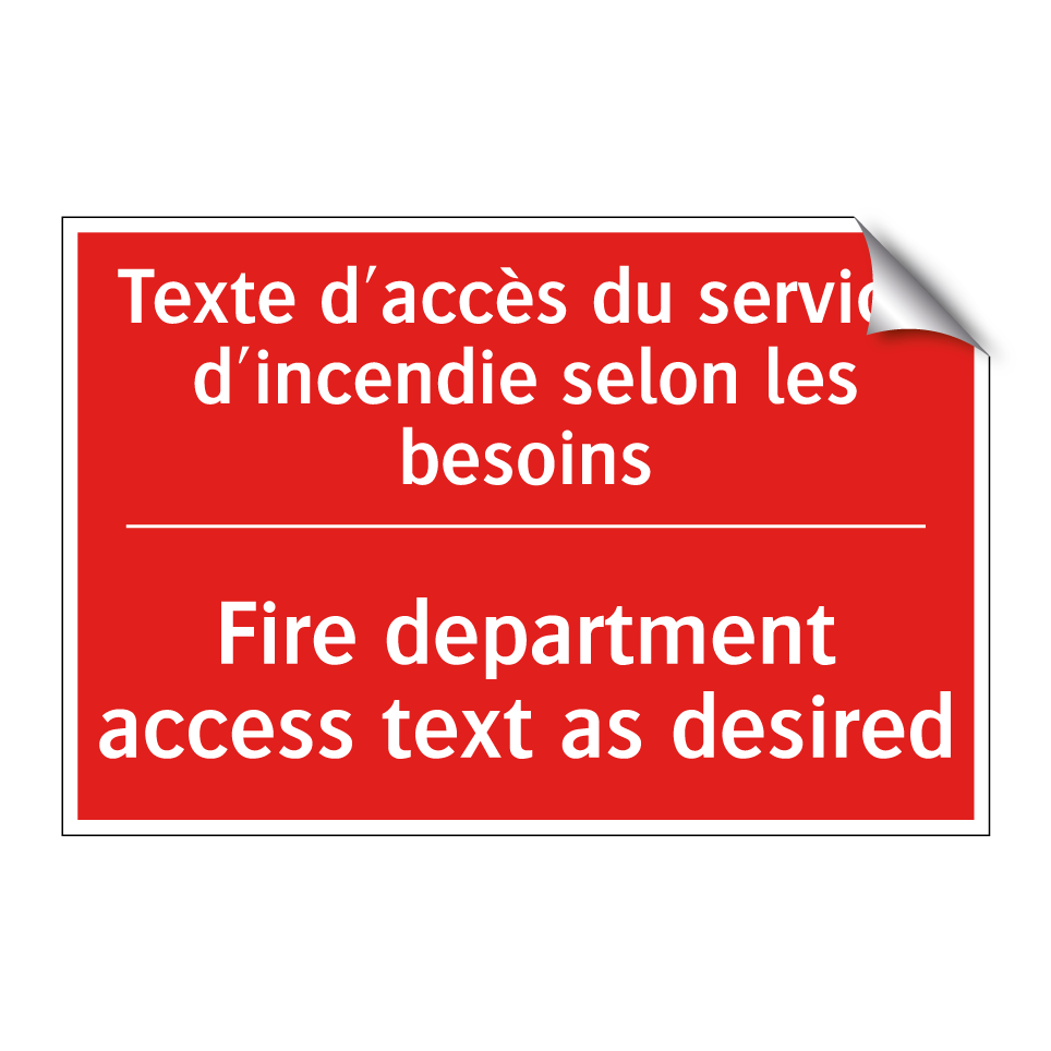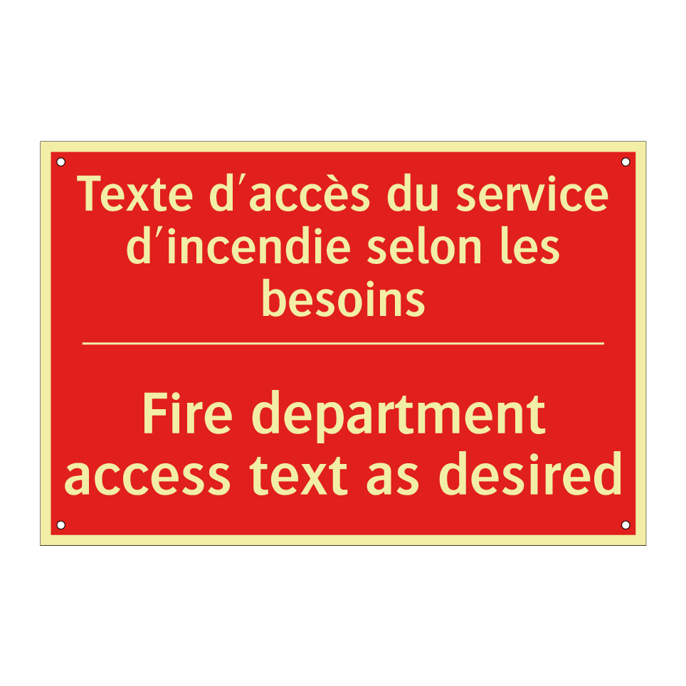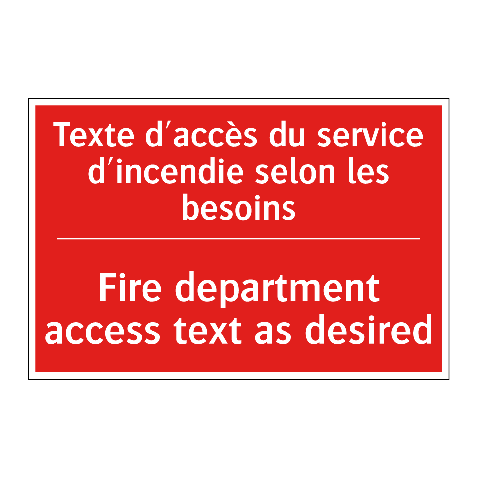 Panneau de signalisation incendie bilingue avec texte en français : "Texte d'accès du service d'incendie selon les besoins", et en anglais : "Fire department access text as desired"