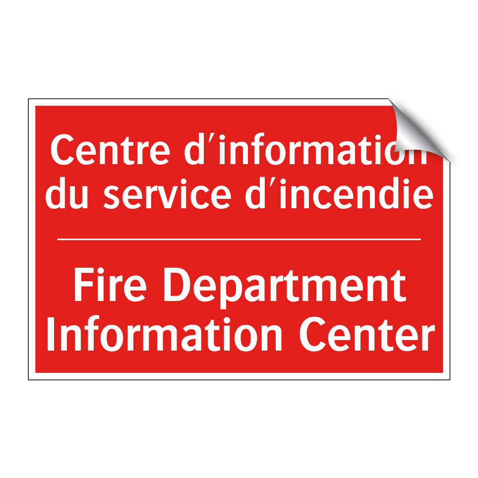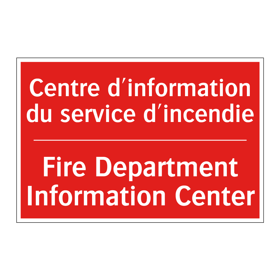 Panneau de signalisation incendie bilingue avec texte en français : "Centre d'information du service d'incendie", et en anglais : "Fire Department Information Center"