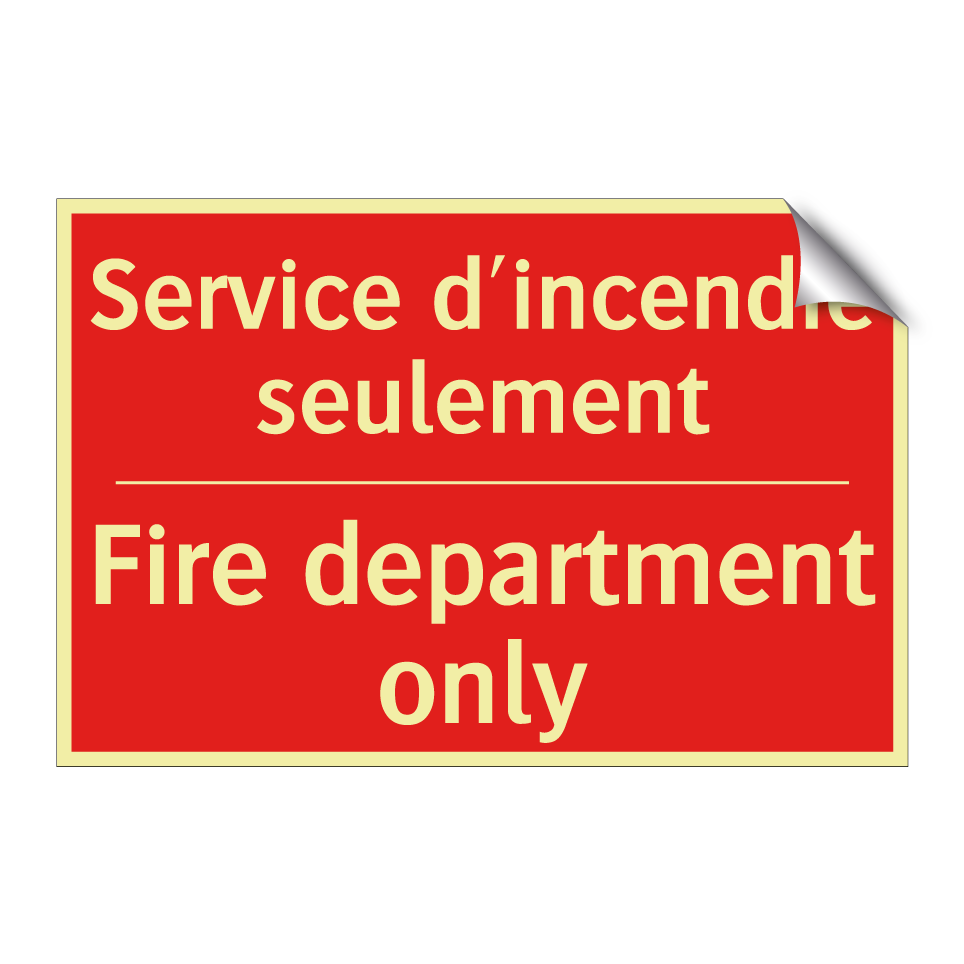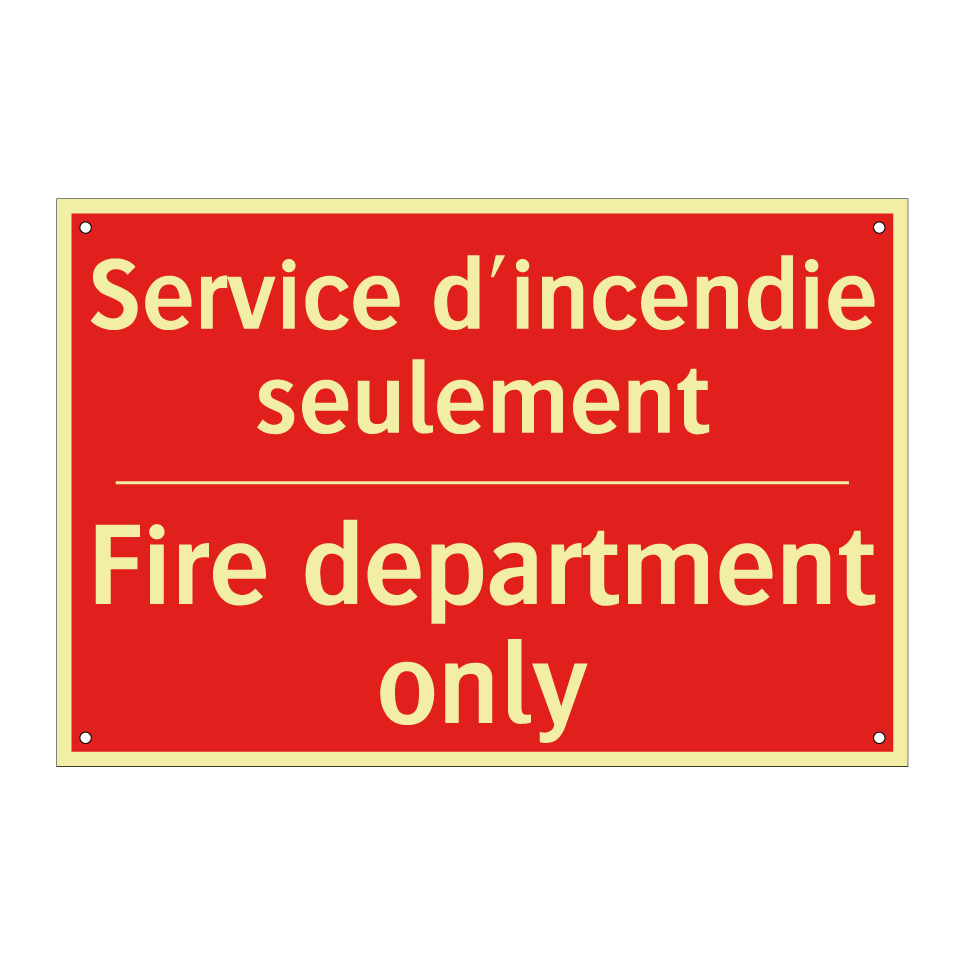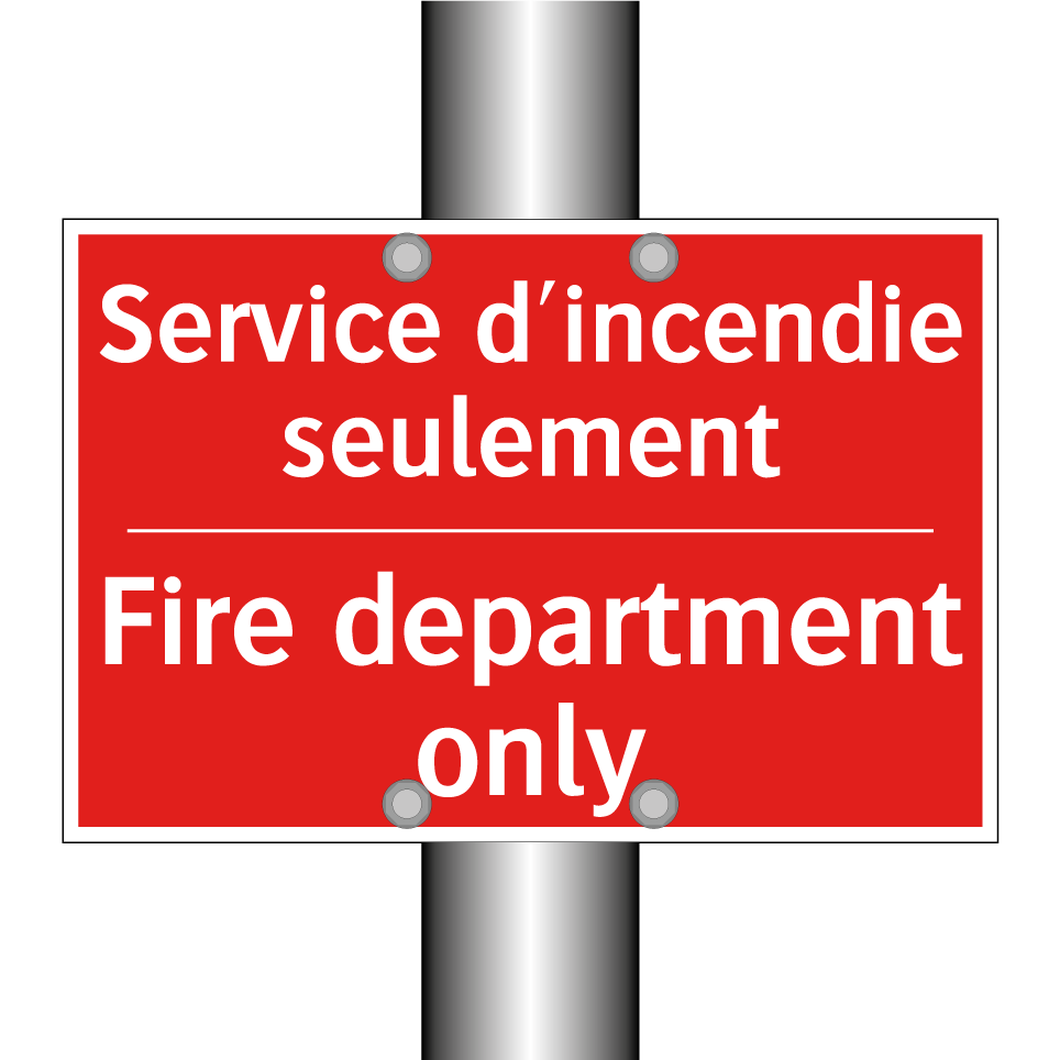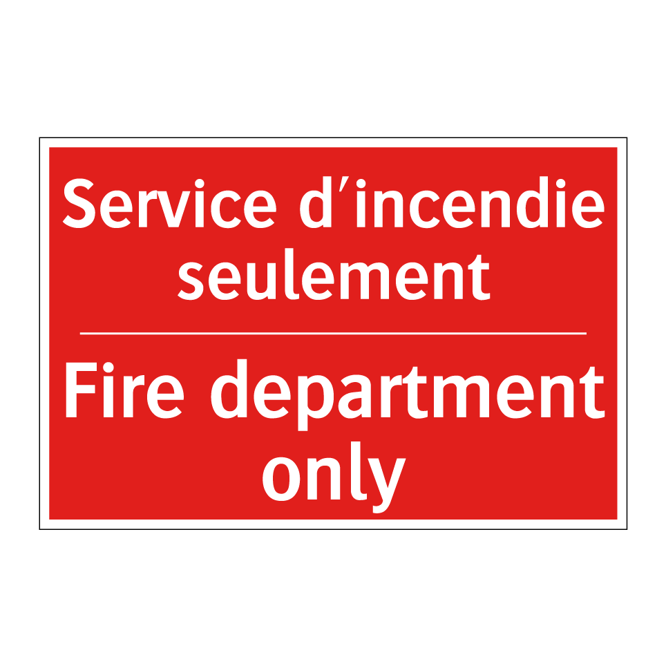 Panneau de signalisation incendie bilingue avec texte en français : "Service d'incendie seulement", et en anglais : "Fire department only"