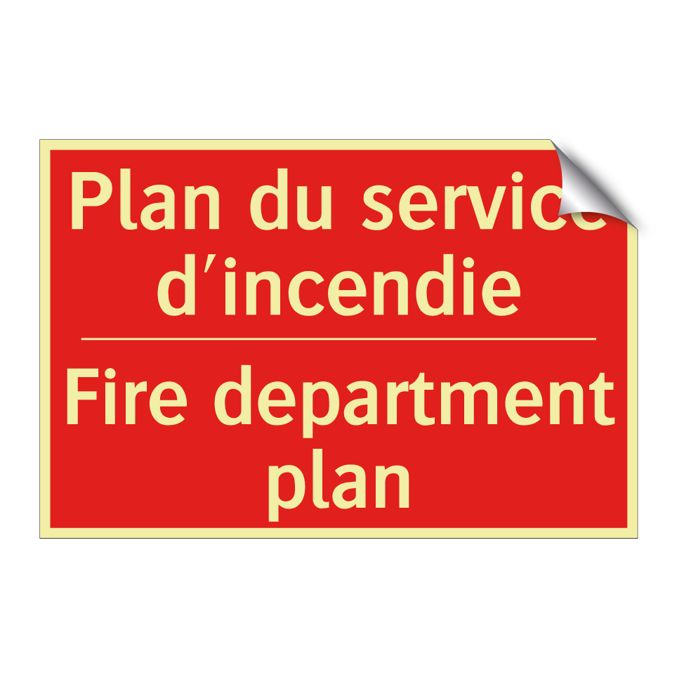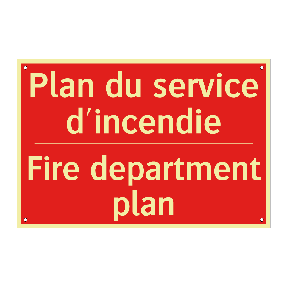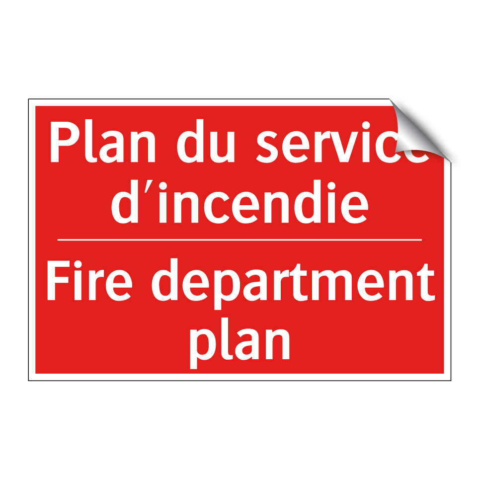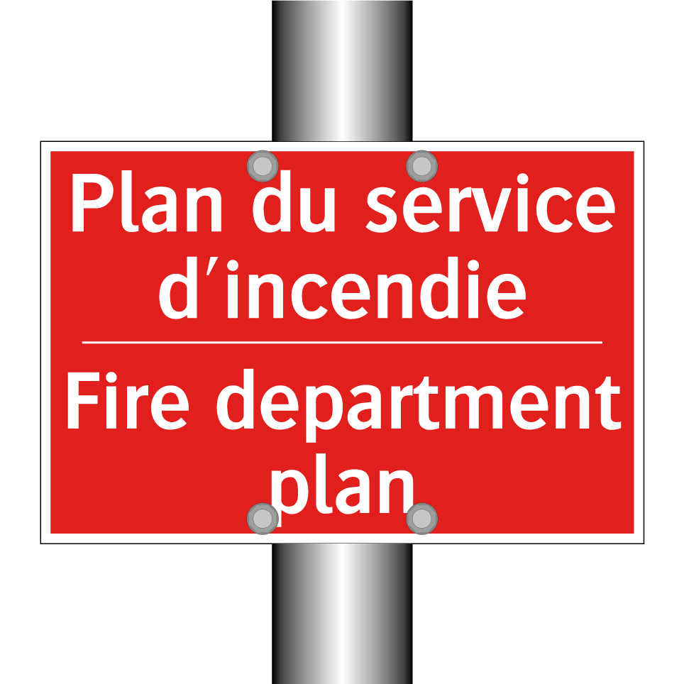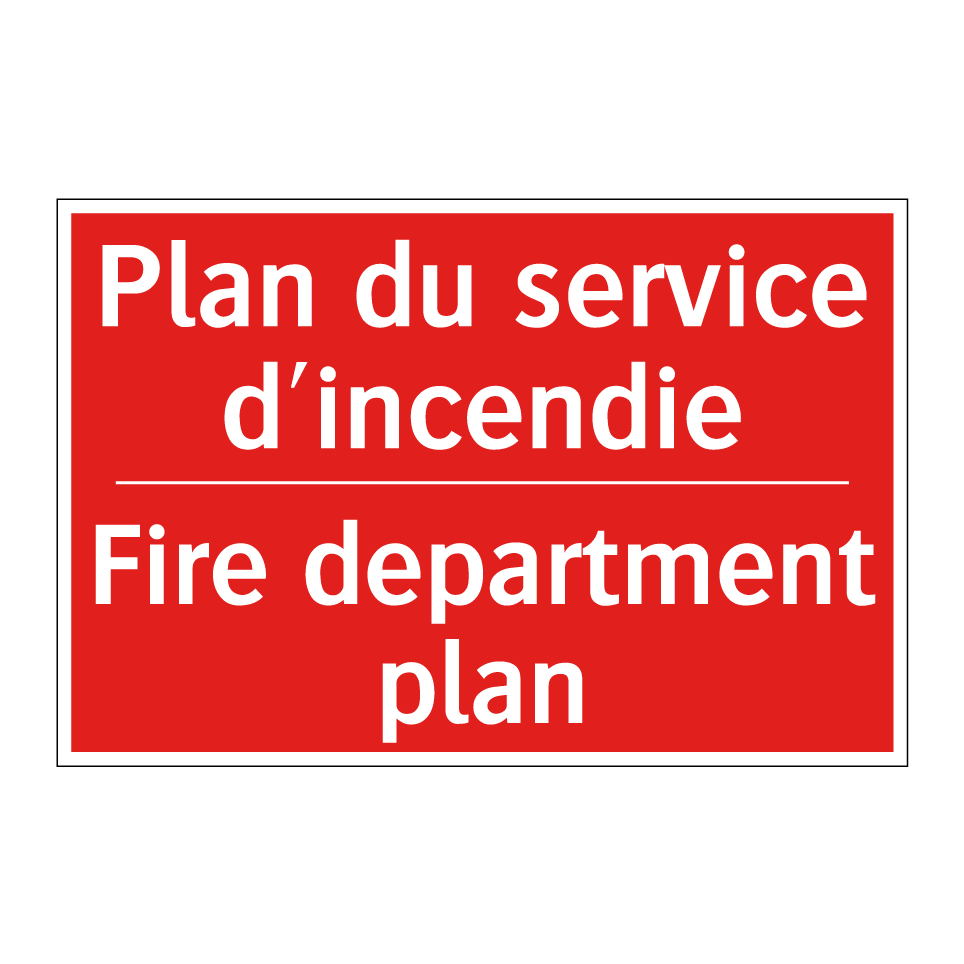 Panneau de signalisation incendie bilingue avec texte en français : "Plan du service d'incendie", et en anglais : "Fire department plan"