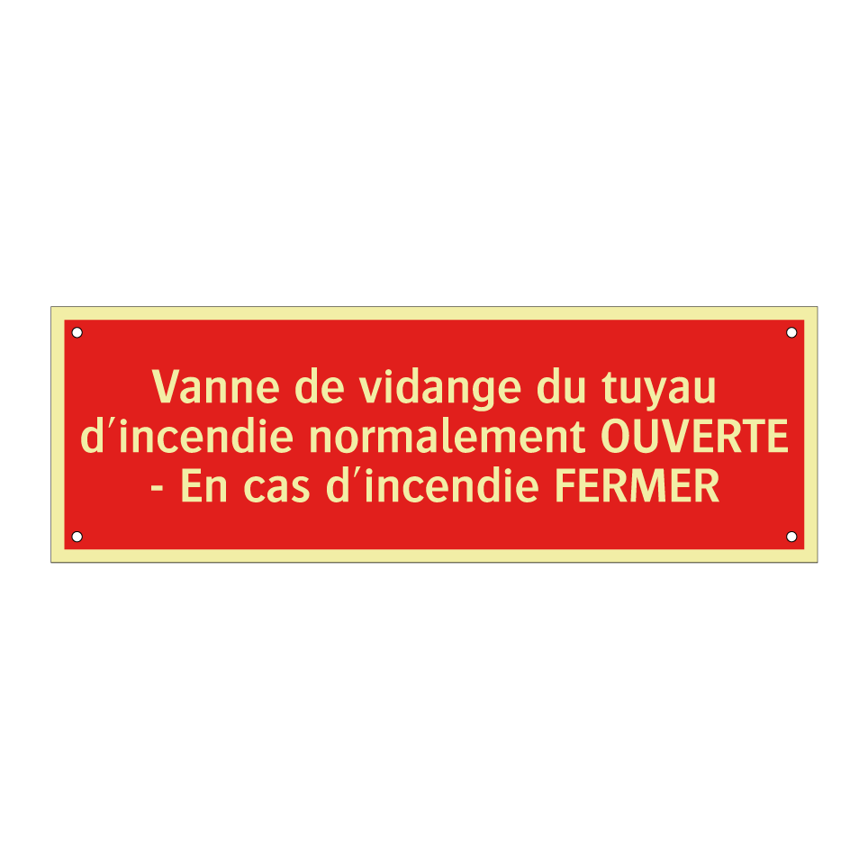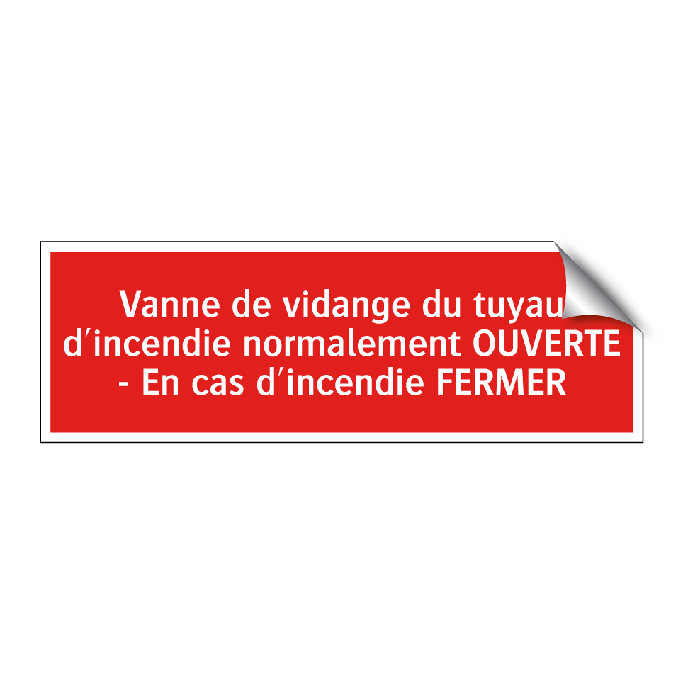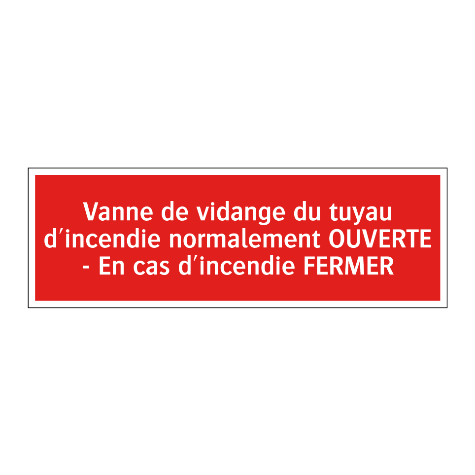 Cette signalisation incendie est essentielle pour garantir la sécurité dans les bâtiments. Elle est conçue pour être placée à proximité des vannes de vidange des tuyaux d'incendie, indiquant clairement que la vanne doit être normalement ouverte et fermée en cas d'incendie. Avec son fond rouge et son texte blanc, elle assure une visibilité optimale dans les environnements industriels, les parkings souterrains, ou les locaux techniques. Idéale pour les usines, les entrepôts et les immeubles de bureaux, cette signalétique contribue à une gestion efficace des situations d'urgence en guidant le personnel et les intervenants vers les actions appropriées.