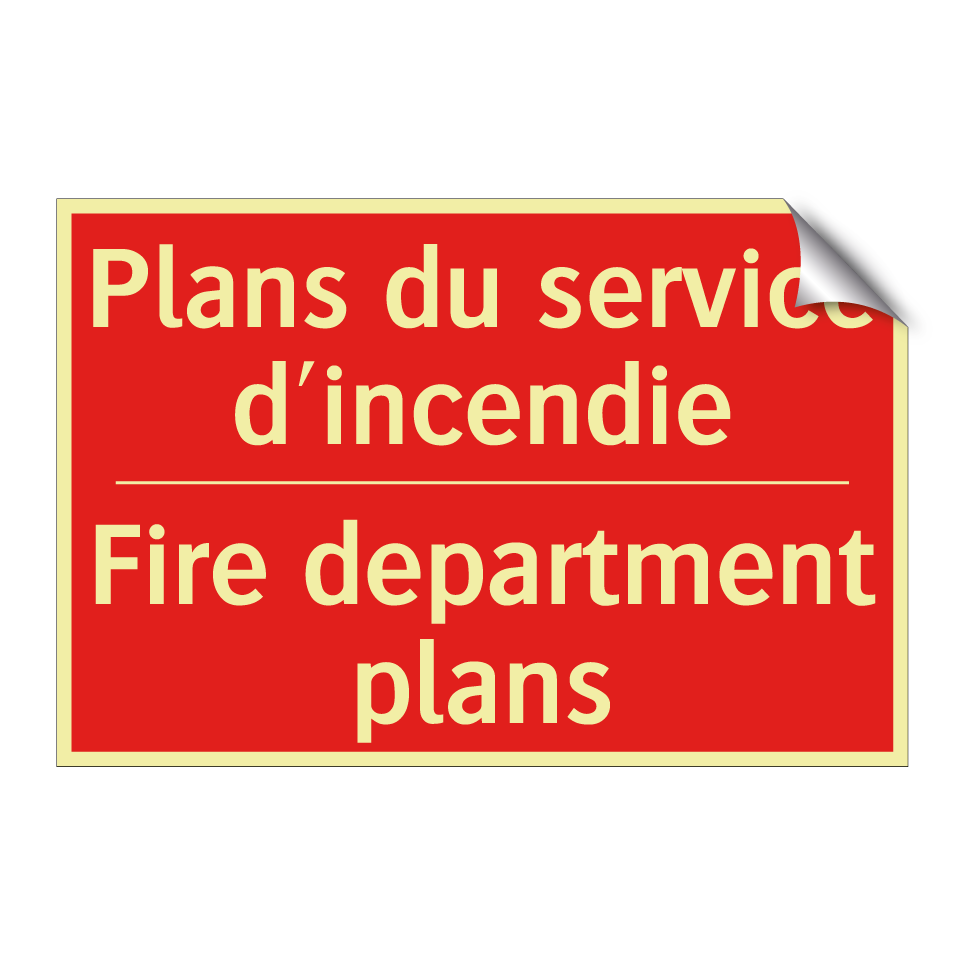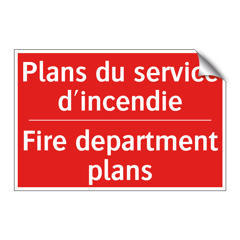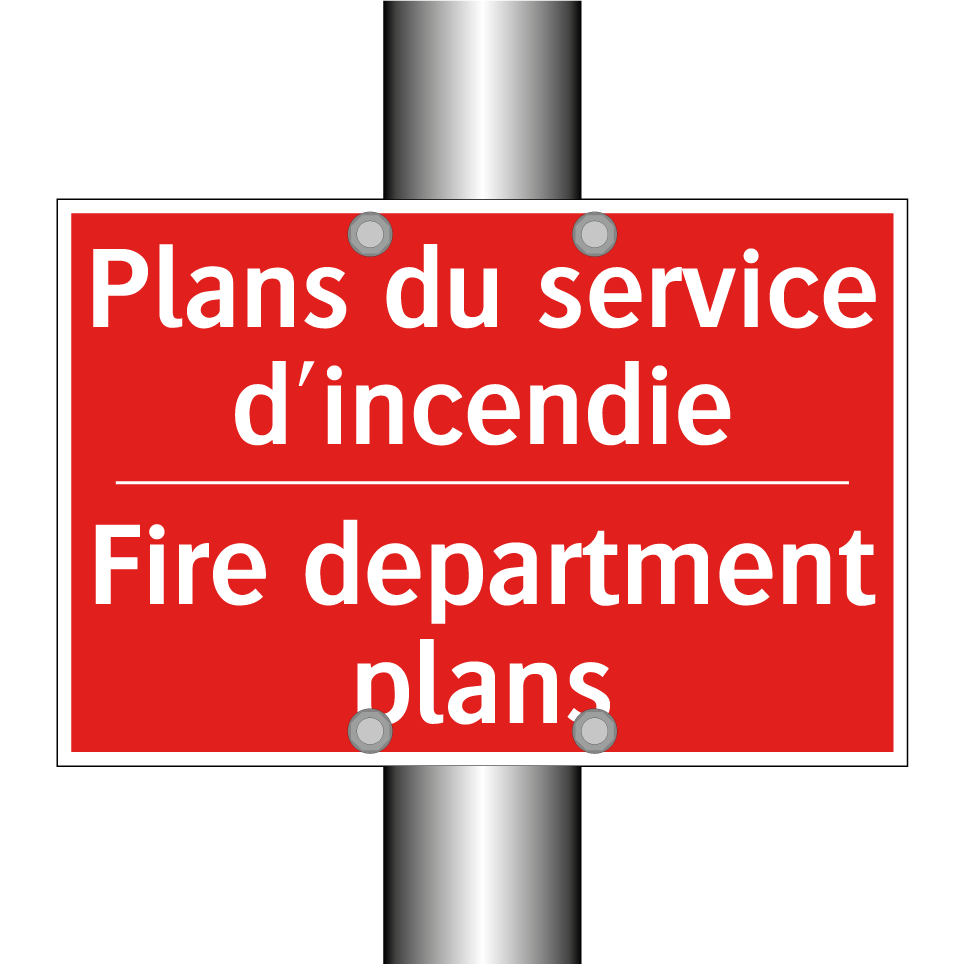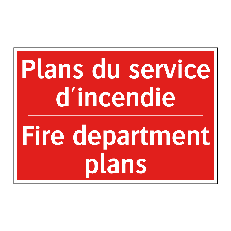 Panneau de signalisation incendie bilingue avec texte en français : "Plans du service d'incendie", et en anglais : "Fire department plans"