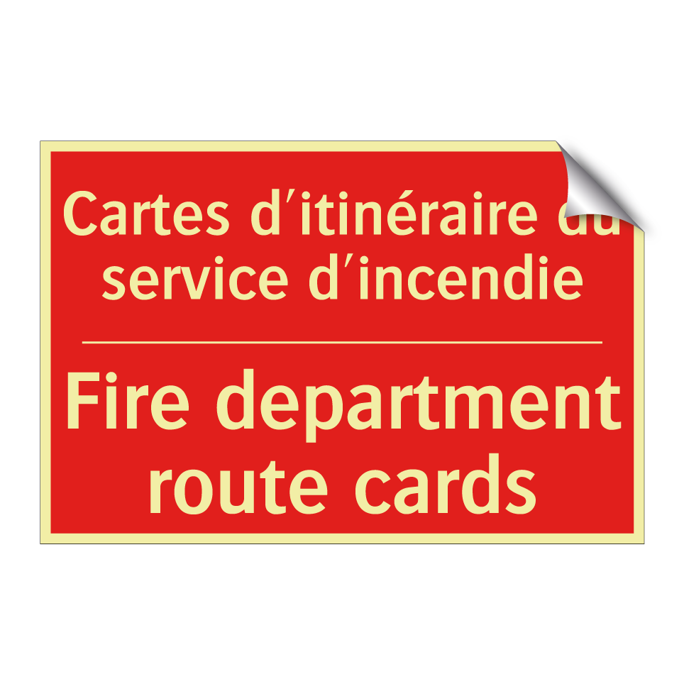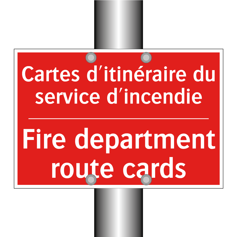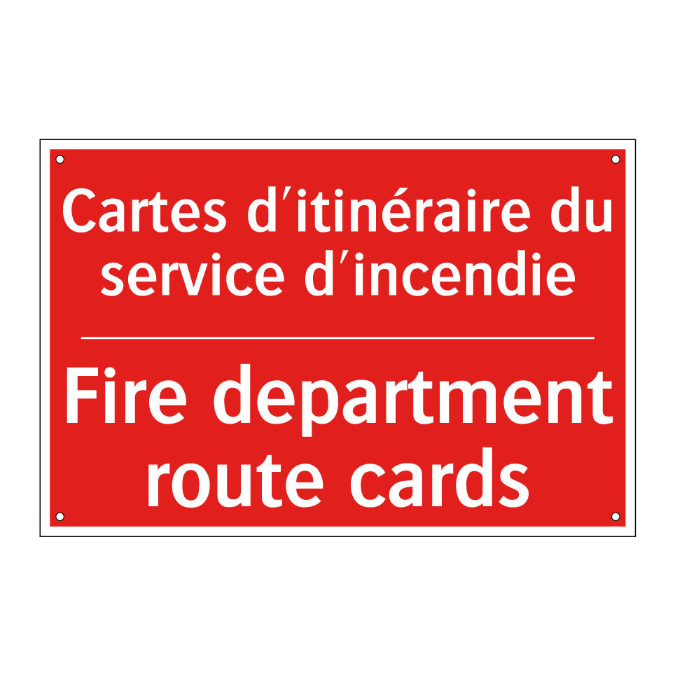 Panneau de signalisation incendie bilingue avec texte en français : "Cartes d'itinéraire du service d'incendie", et en anglais : "Fire department route cards"