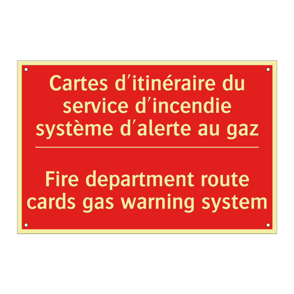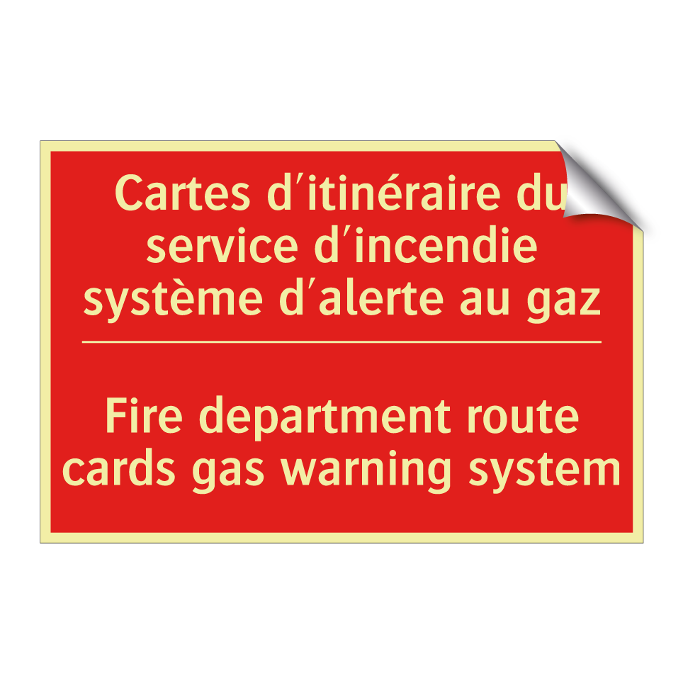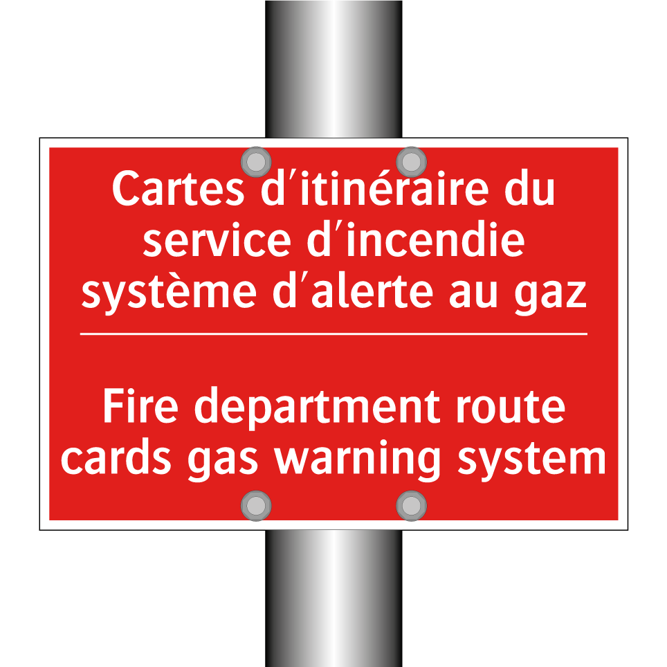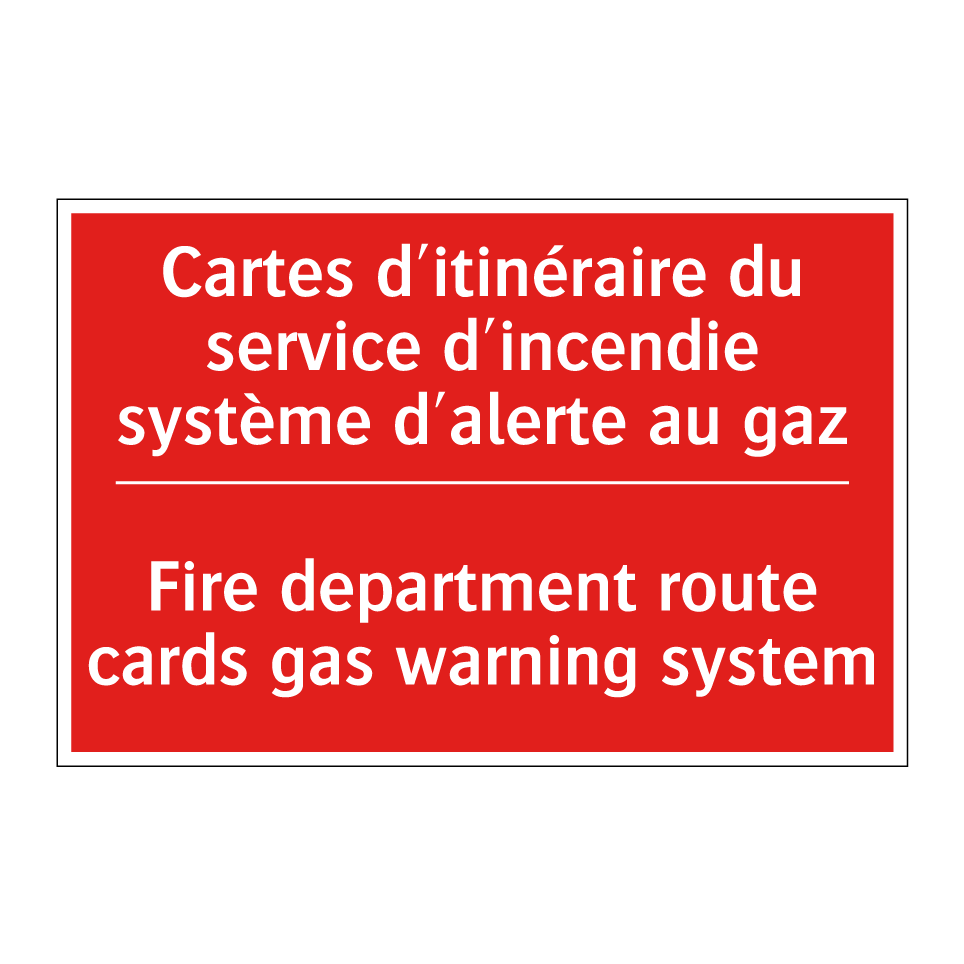 Panneau de signalisation incendie bilingue avec texte en français : "Cartes d'itinéraire du service d'incendie système d'alerte au gaz", et en anglais : "Fire department route cards gas warning system"