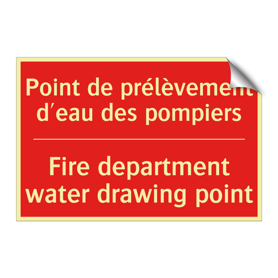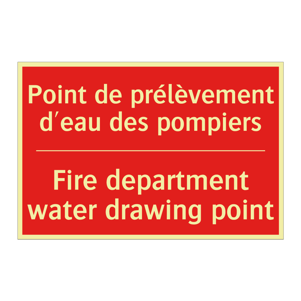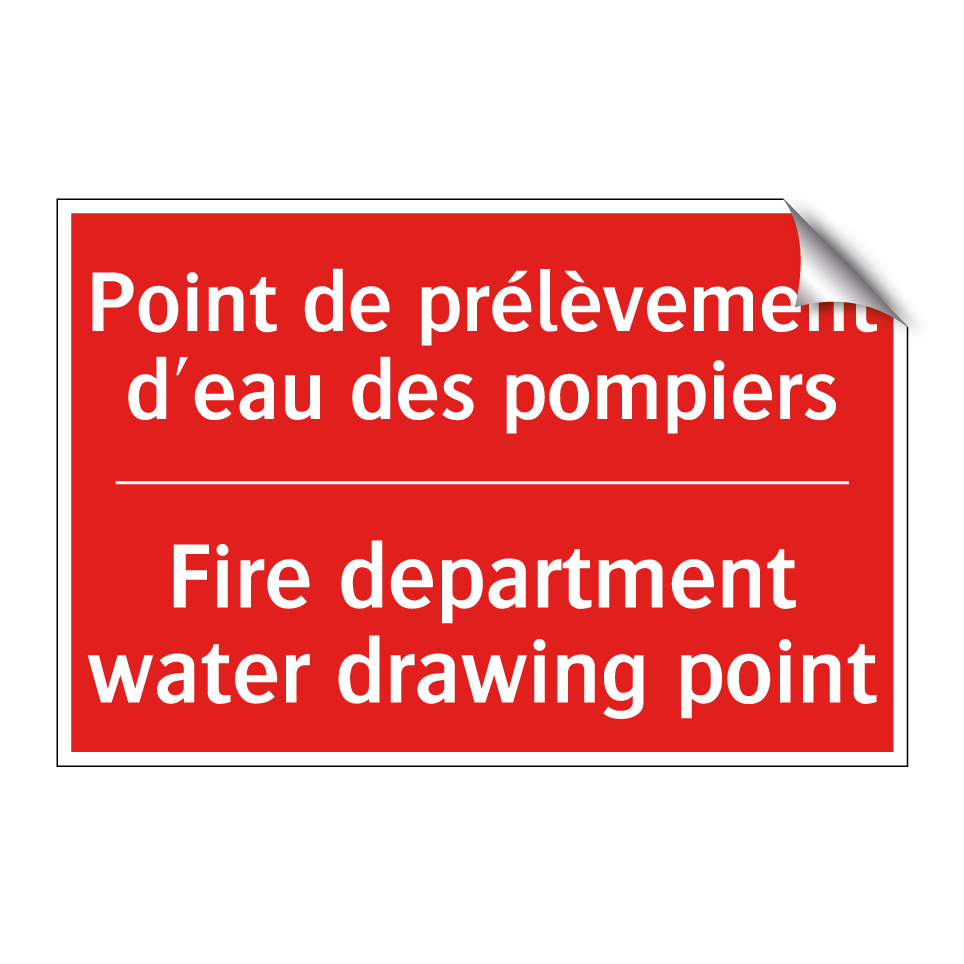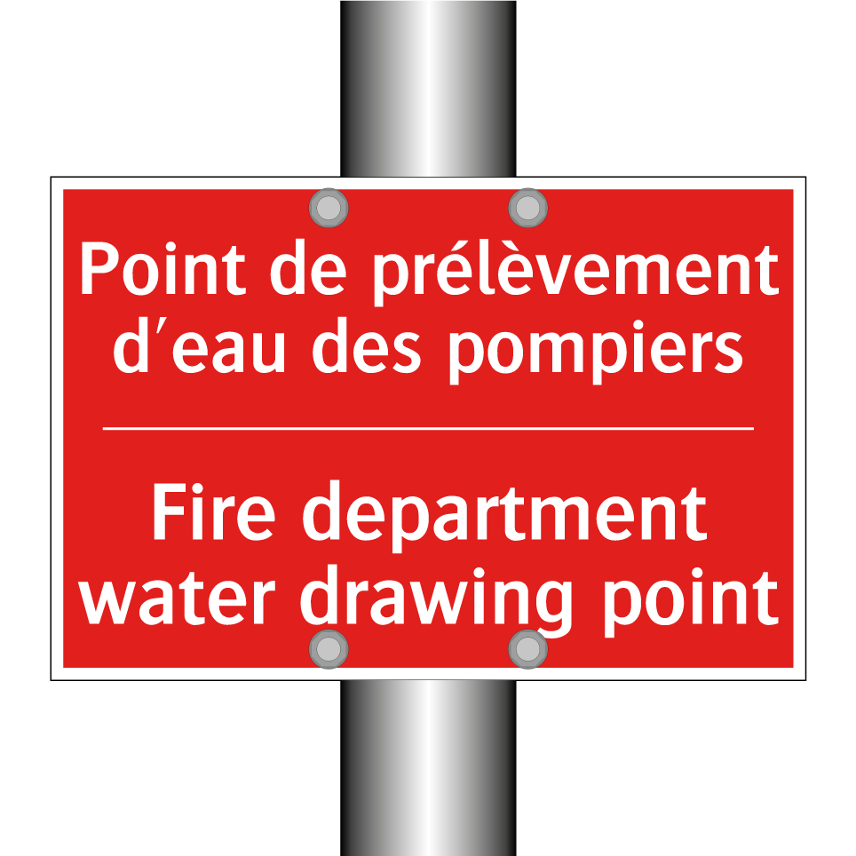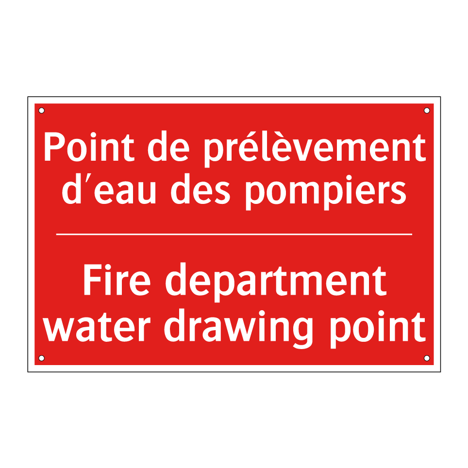 Panneau de signalisation incendie bilingue avec texte en français : "Point de prélèvement d'eau des pompiers", et en anglais : "Fire department water drawing point"