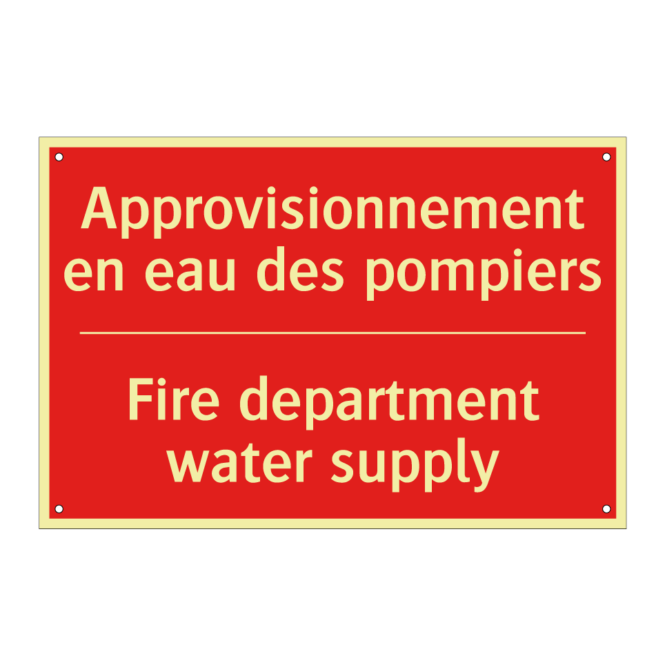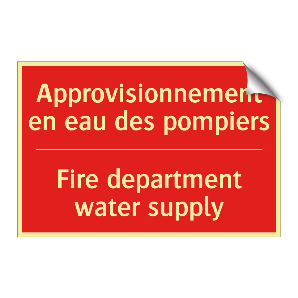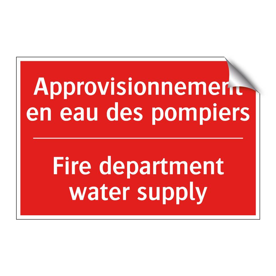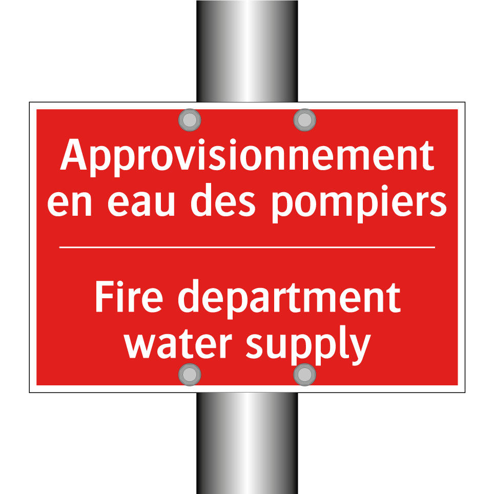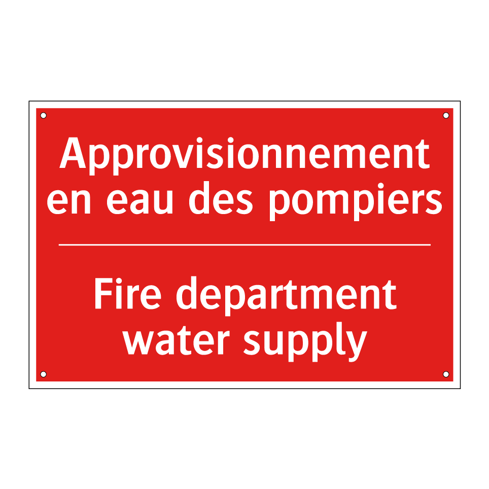 Panneau de signalisation incendie bilingue avec texte en français : "Approvisionnement en eau des pompiers", et en anglais : "Fire department water supply"