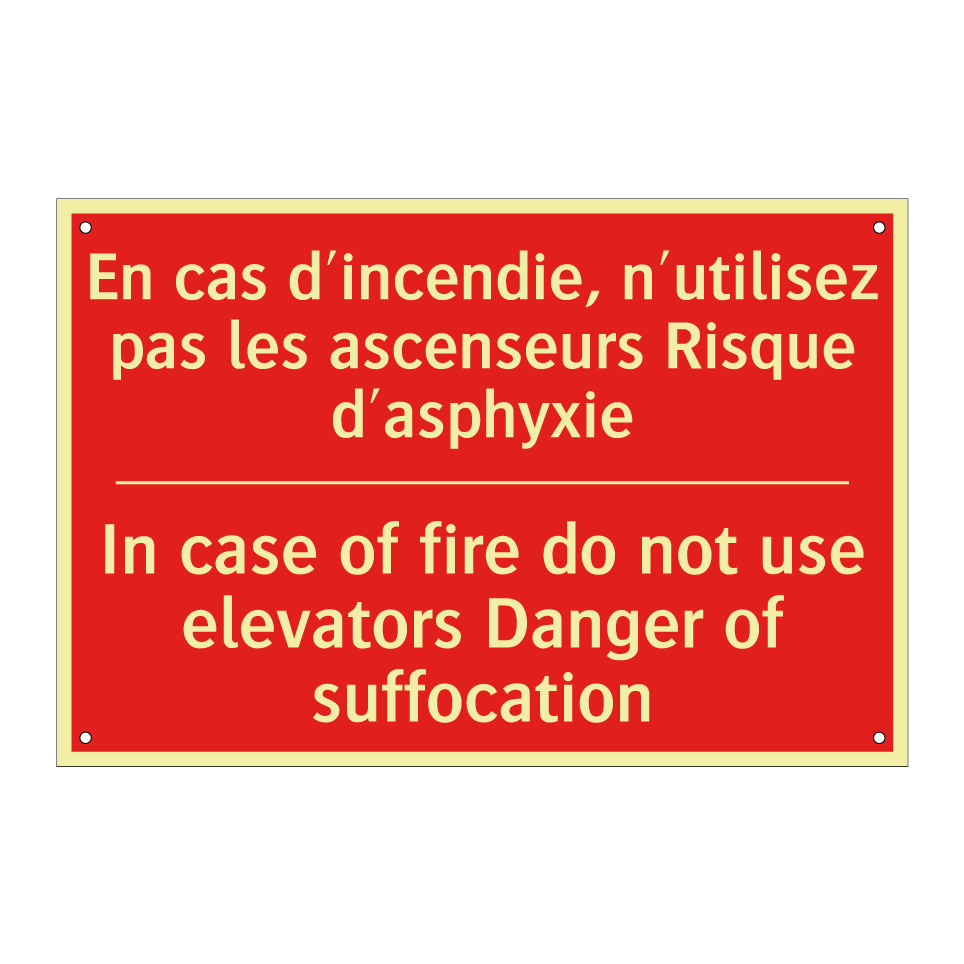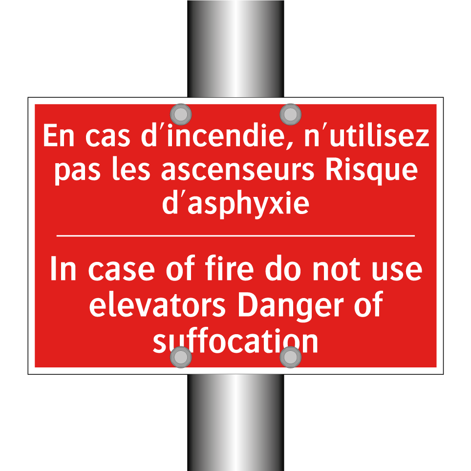 Panneau de signalisation incendie bilingue avec texte en français : "En cas d'incendie, n'utilisez pas les ascenseurs Risque d'asphyxie", et en anglais : "In case of fire do not use elevators Danger of suffocation"