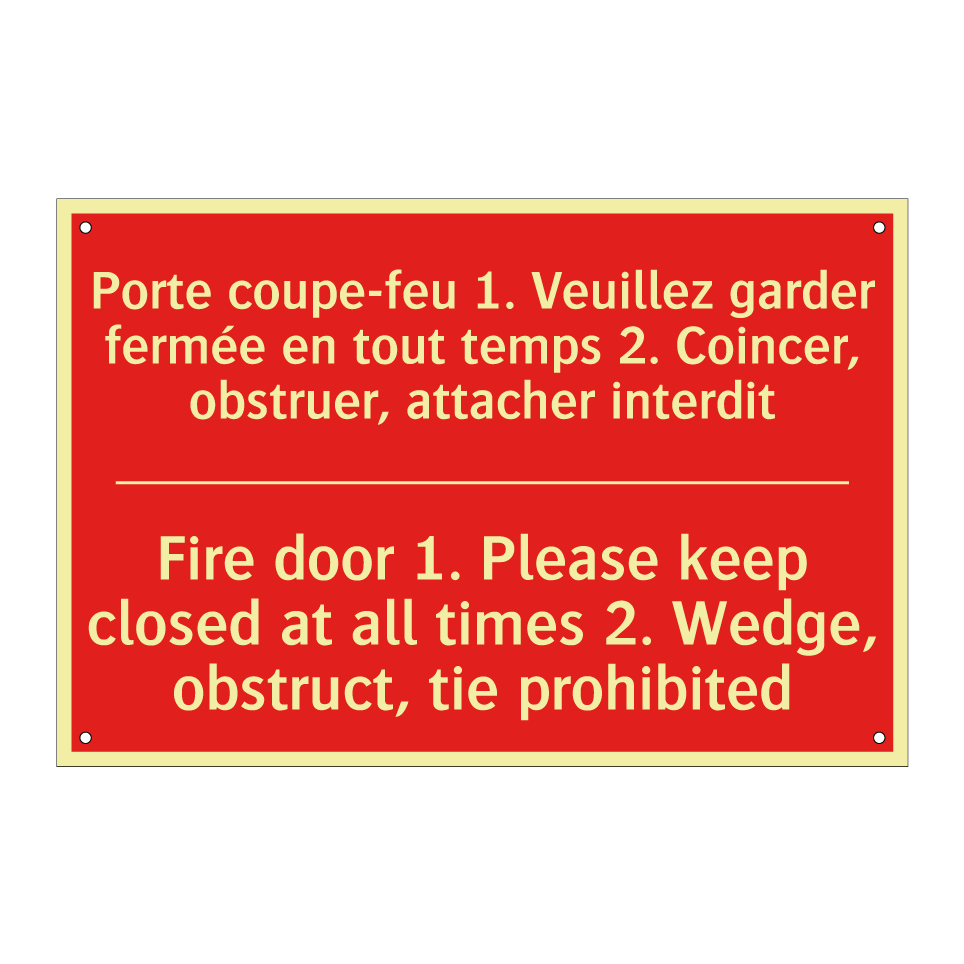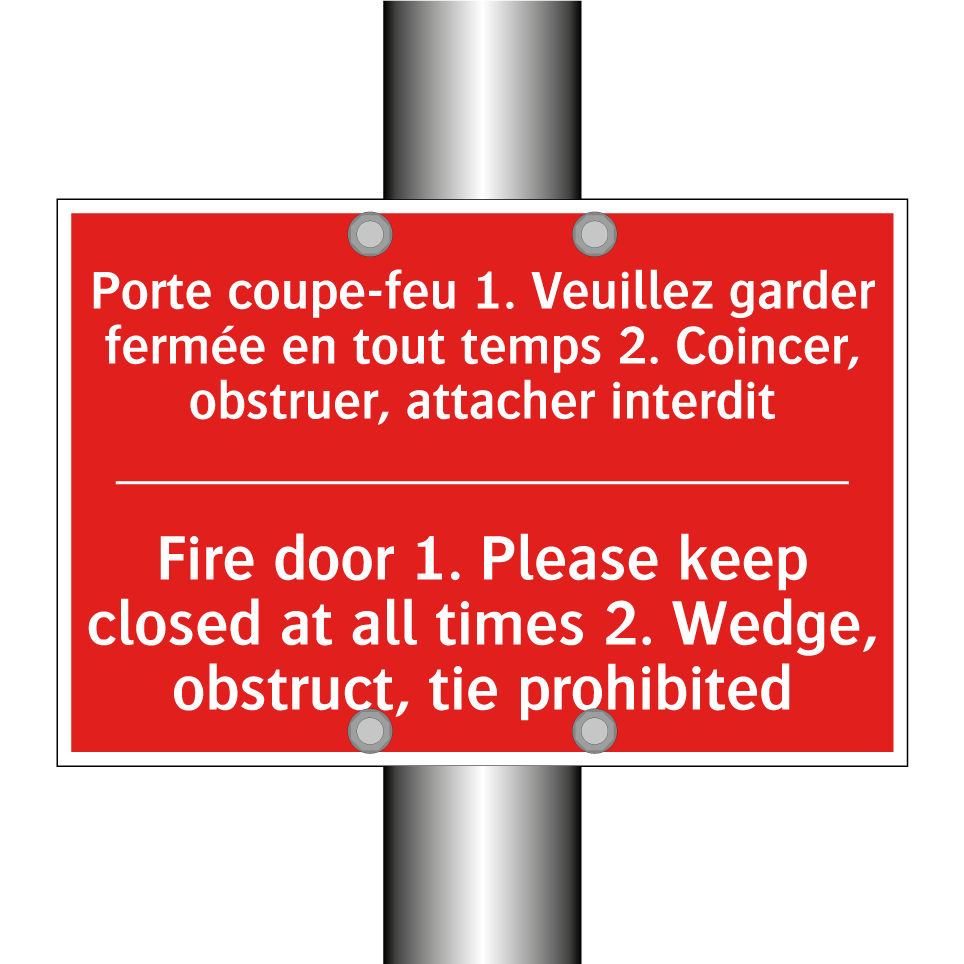 Panneau de signalisation incendie bilingue avec texte en français : "Porte coupe-feu 1. Veuillez garder fermée en tout temps 2. Coincer, obstruer, attacher interdit", et en anglais : "Fire door 1. Please keep closed at all times 2. Wedge, obstruct, tie prohibited"