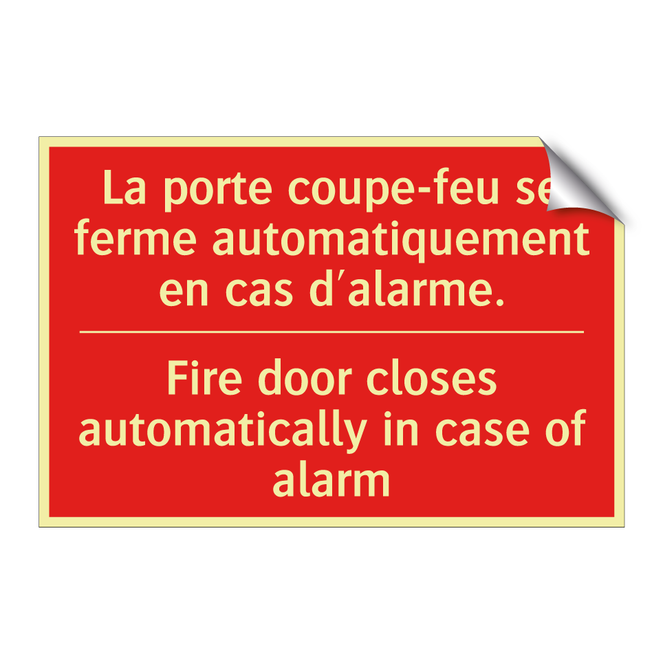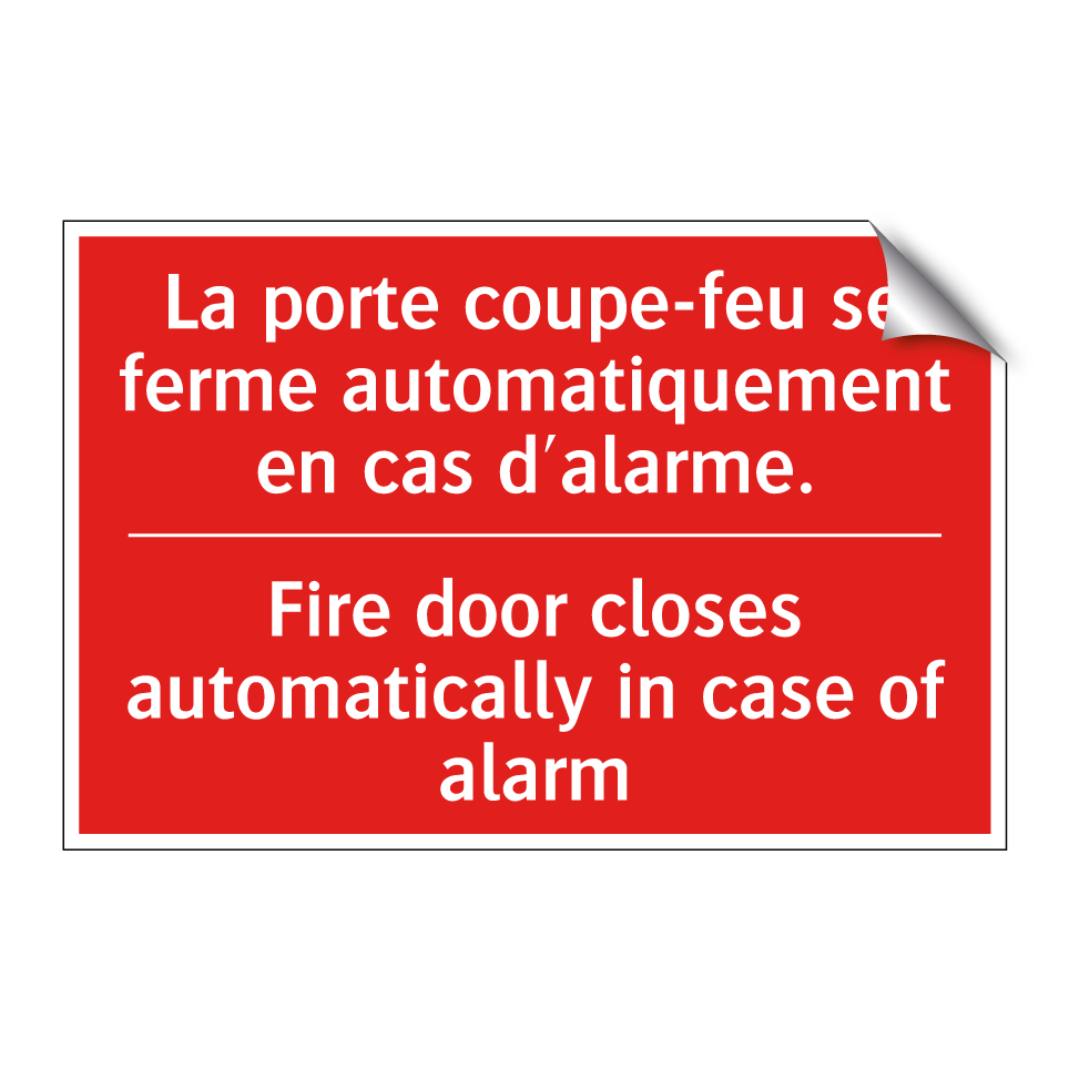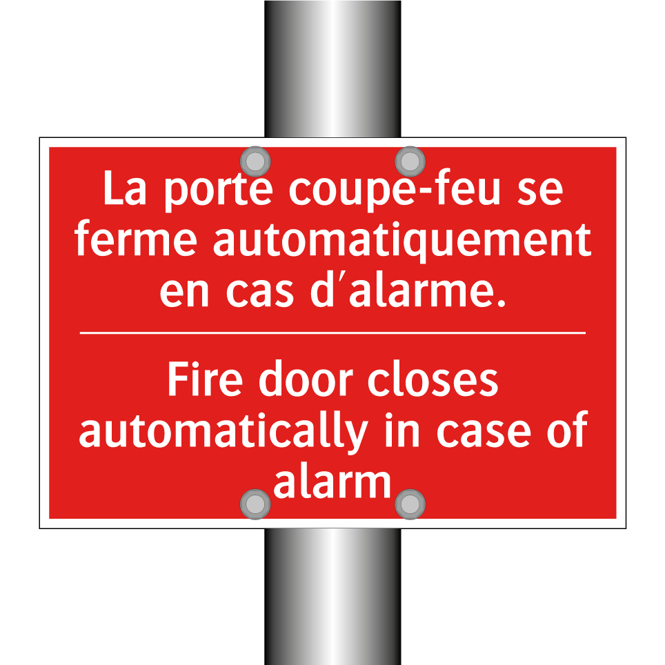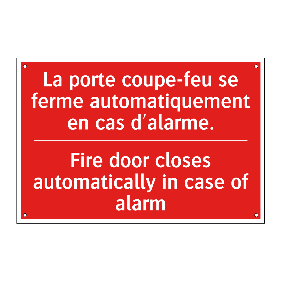 Panneau de signalisation incendie bilingue avec texte en français : "La porte coupe-feu se ferme automatiquement en cas d'alarme.", et en anglais : "Fire door closes automatically in case of alarm"