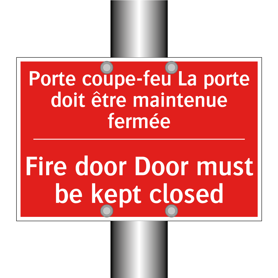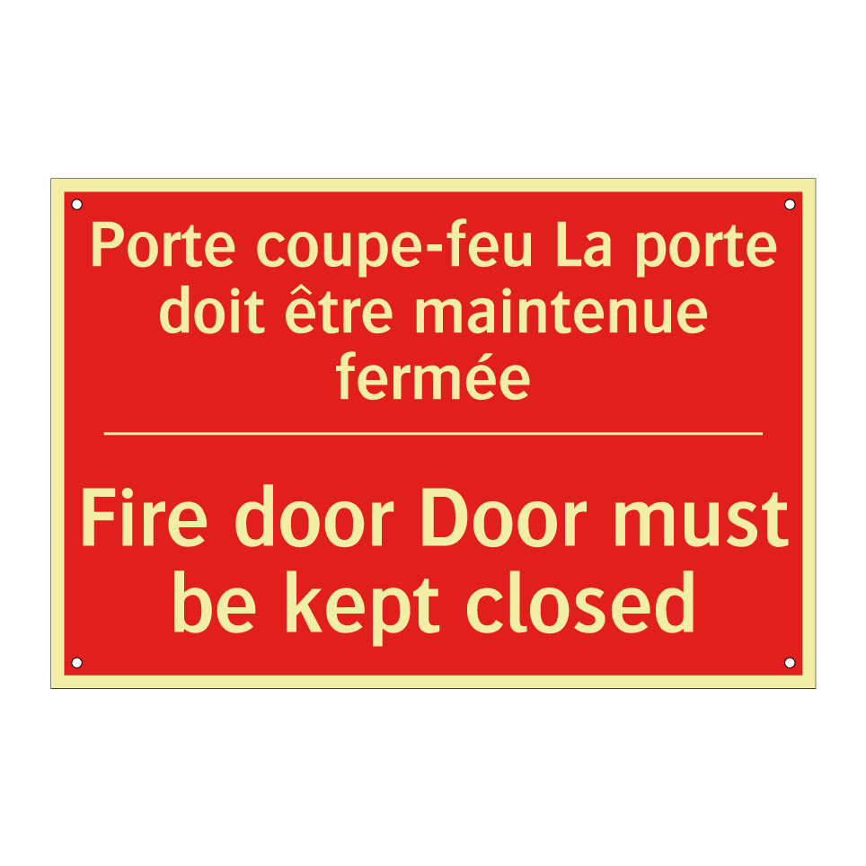 Panneau de signalisation incendie bilingue avec texte en français : "Porte coupe-feu La porte doit être maintenue fermée", et en anglais : "Fire door Door must be kept closed"