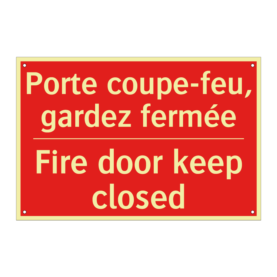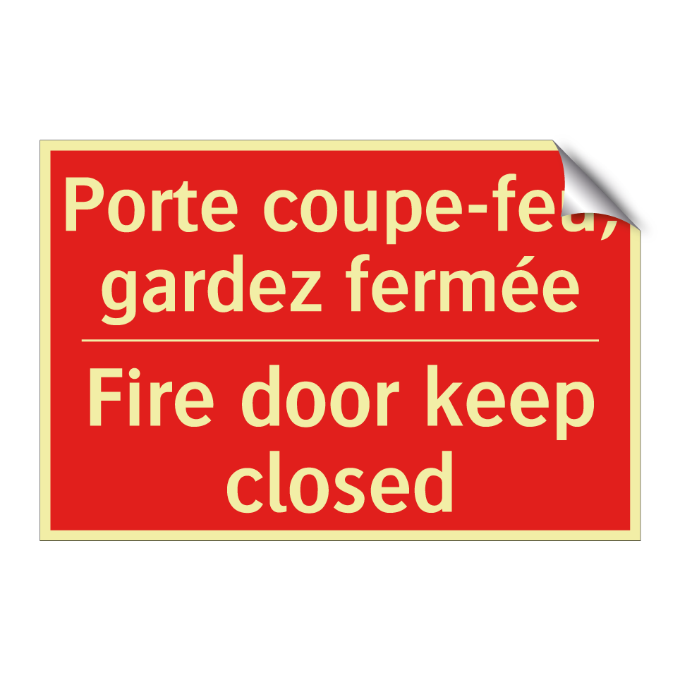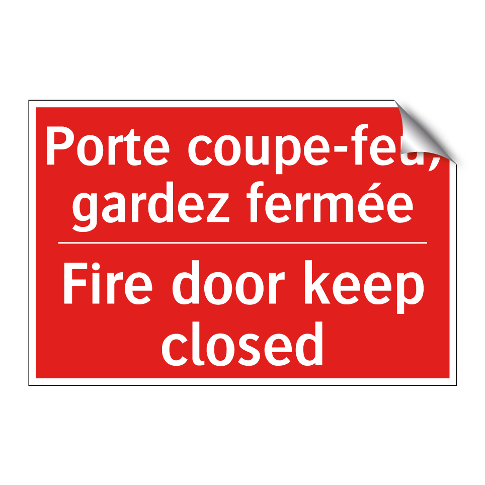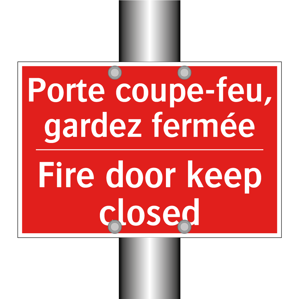 Panneau de signalisation incendie bilingue avec texte en français : "Porte coupe-feu, gardez fermée", et en anglais : "Fire door keep closed"