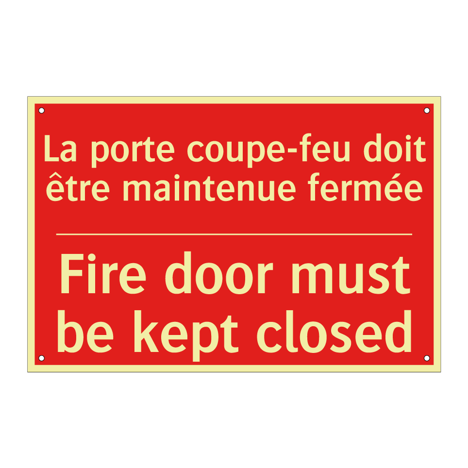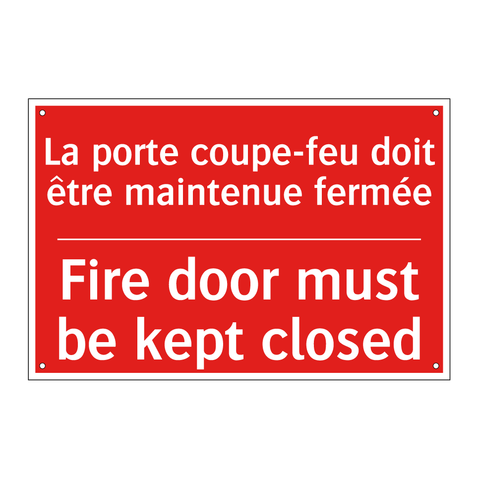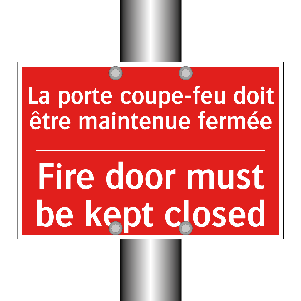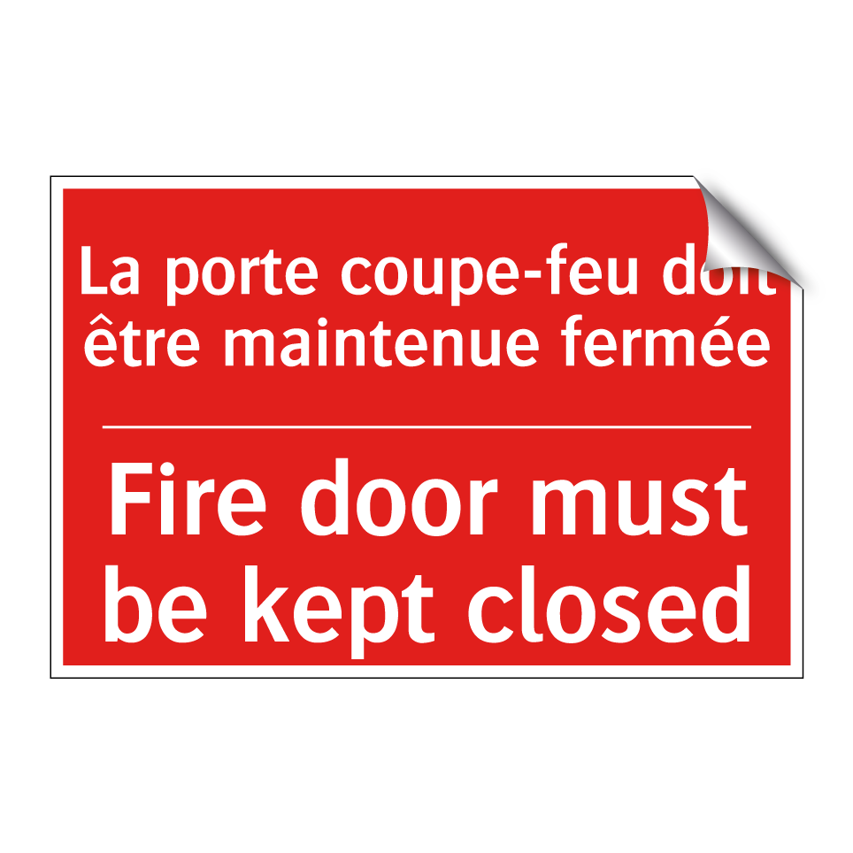 Panneau de signalisation incendie bilingue avec texte en français : "La porte coupe-feu doit être maintenue fermée", et en anglais : "Fire door must be kept closed"