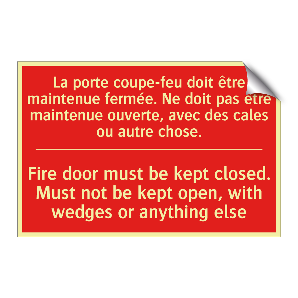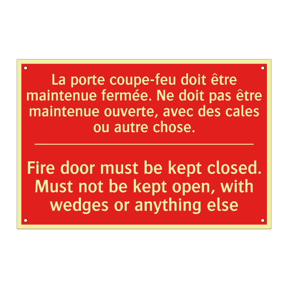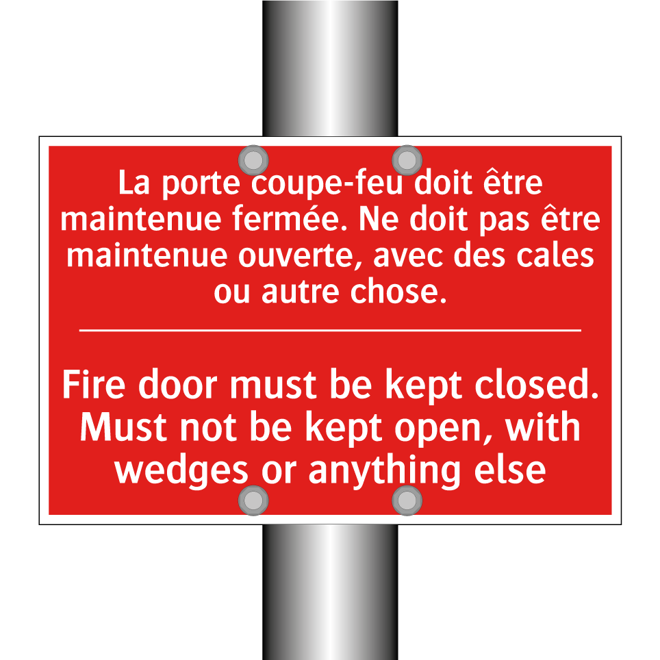 Panneau de signalisation incendie bilingue avec texte en français : "La porte coupe-feu doit être maintenue fermée. Ne doit pas être maintenue ouverte, avec des cales ou autre chose.", et en anglais : "Fire door must be kept closed. Must not be kept open, with wedges or anything else"