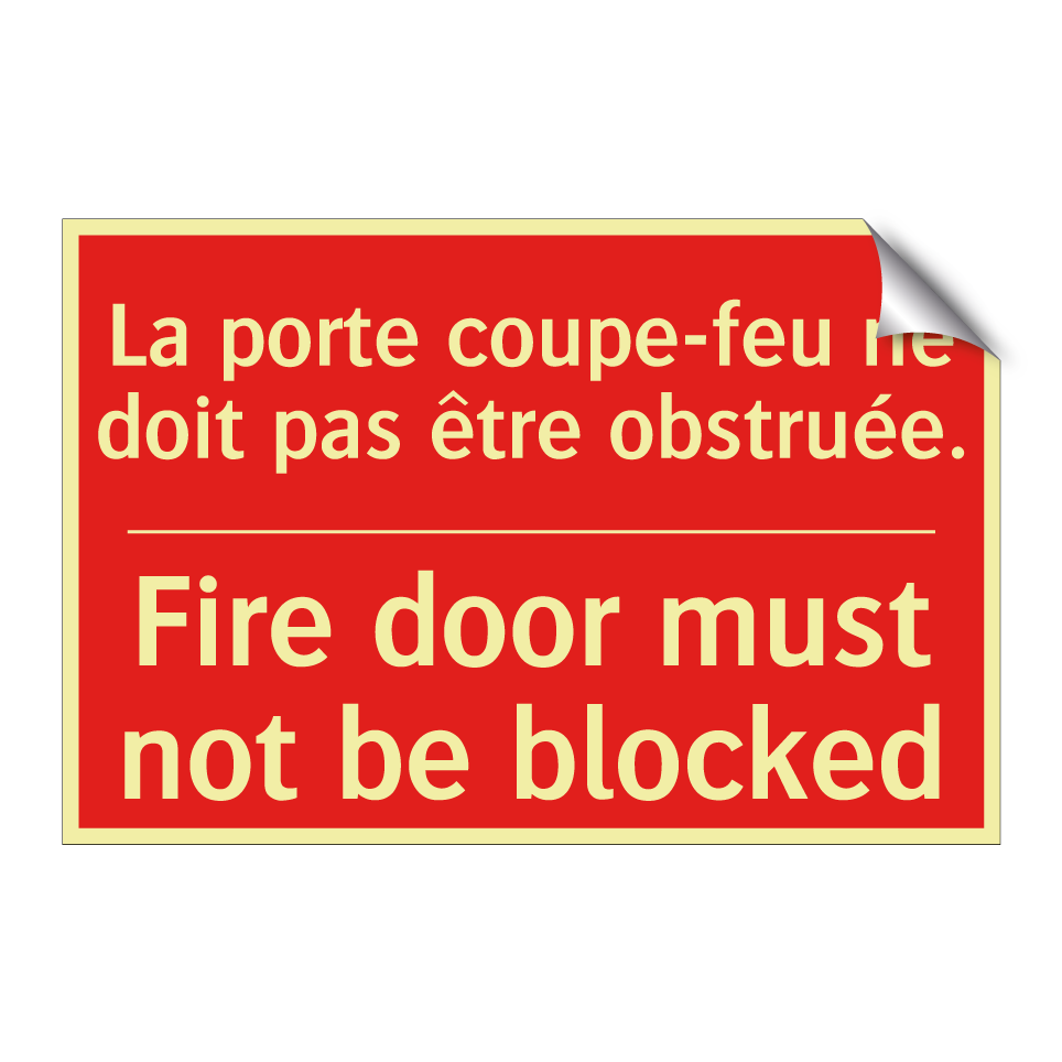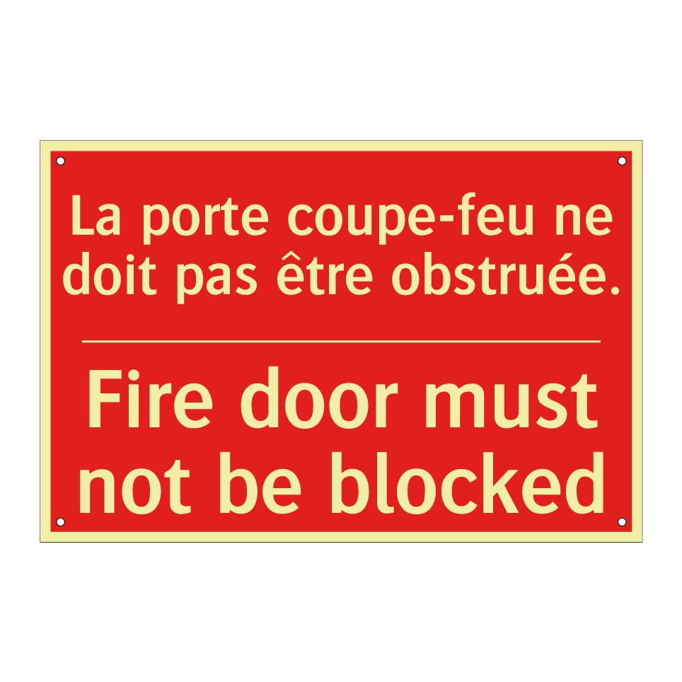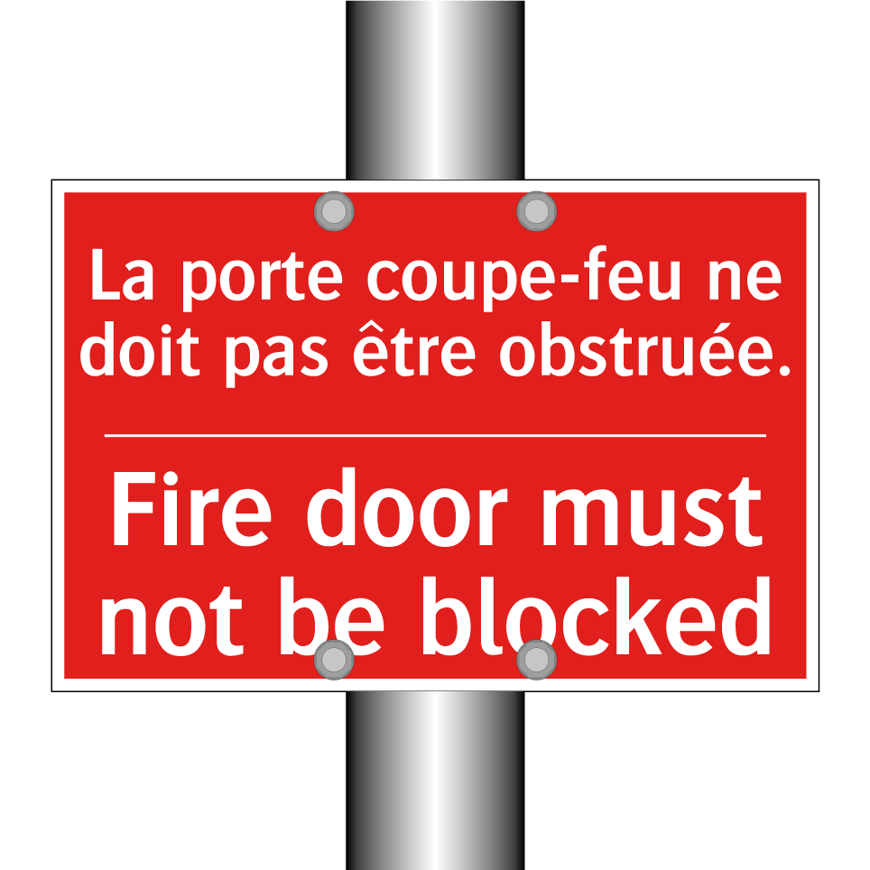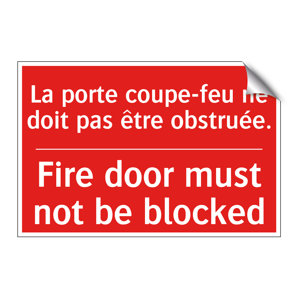 Panneau de signalisation incendie bilingue avec texte en français : "La porte coupe-feu ne doit pas être obstruée.", et en anglais : "Fire door must not be blocked"