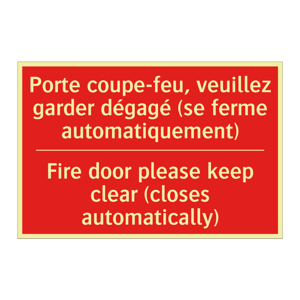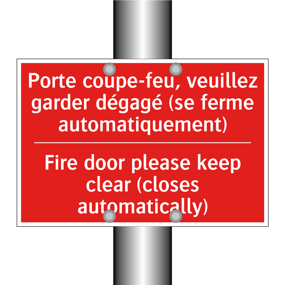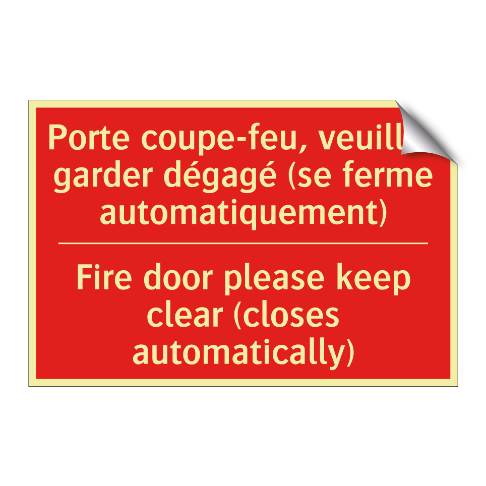 Panneau de signalisation incendie bilingue avec texte en français : "Porte coupe-feu, veuillez garder dégagé (se ferme automatiquement)", et en anglais : "Fire door please keep clear (closes automatically)"