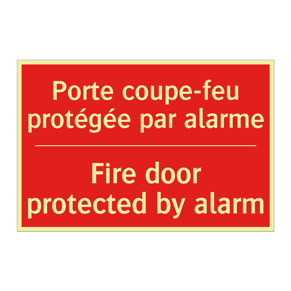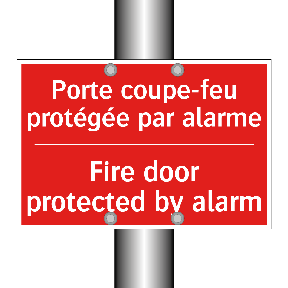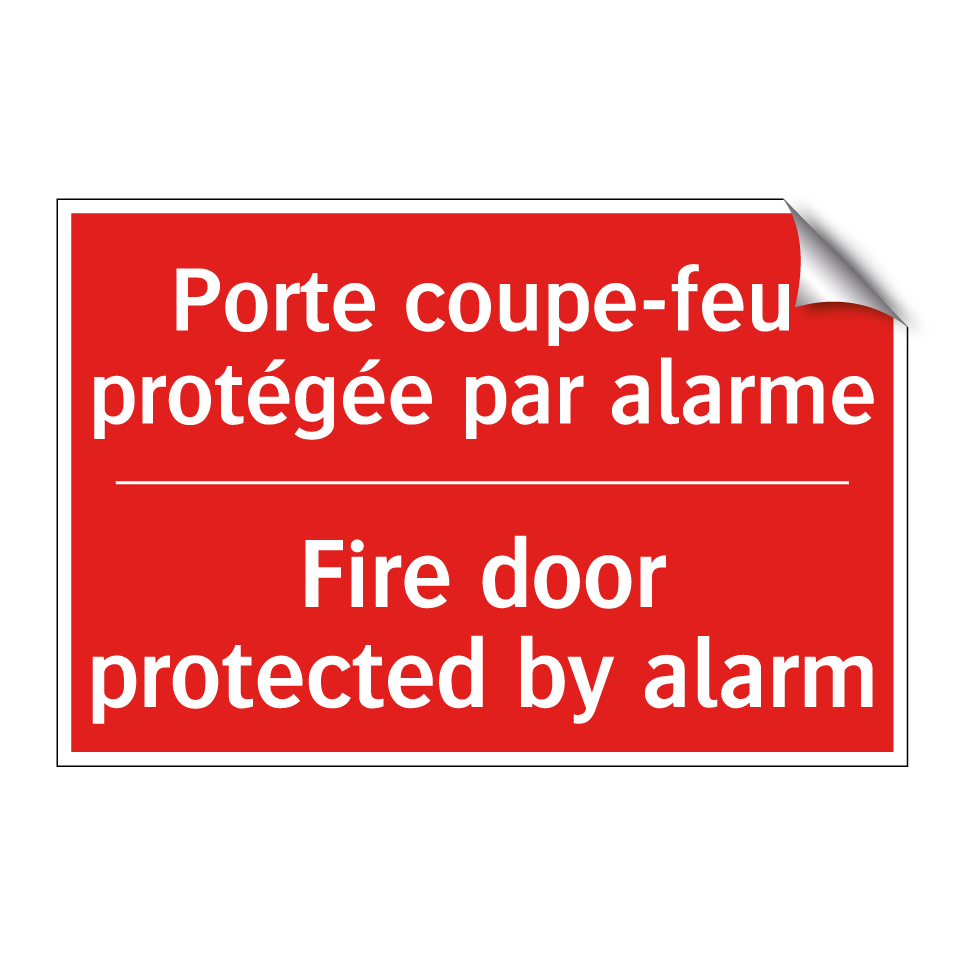 Panneau de signalisation incendie bilingue avec texte en français : "Porte coupe-feu protégée par alarme", et en anglais : "Fire door protected by alarm"