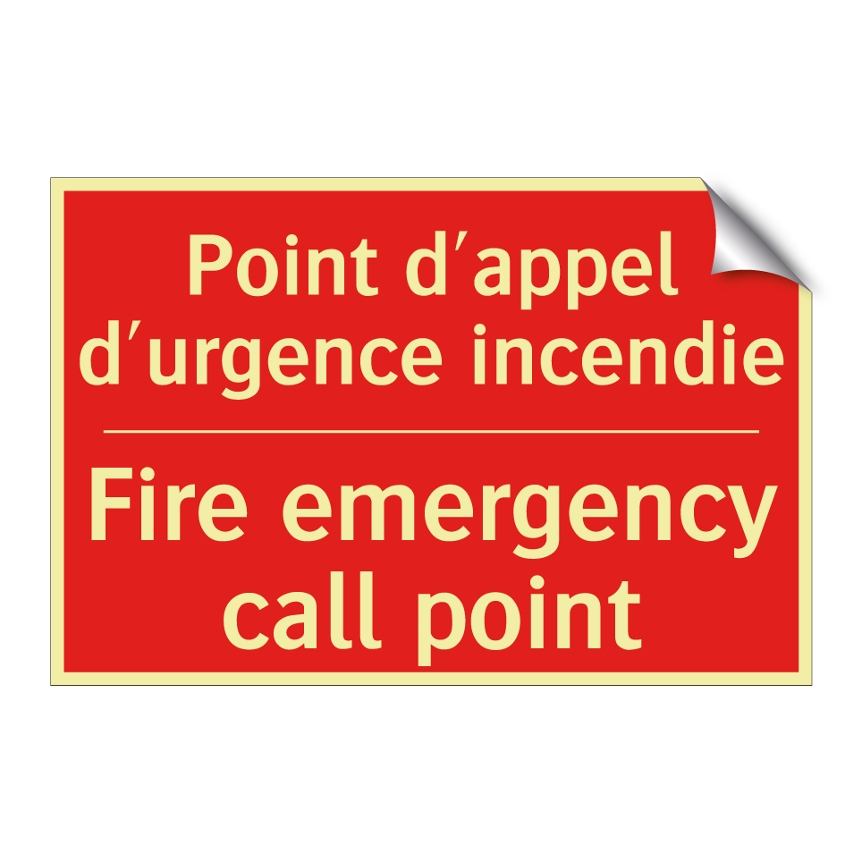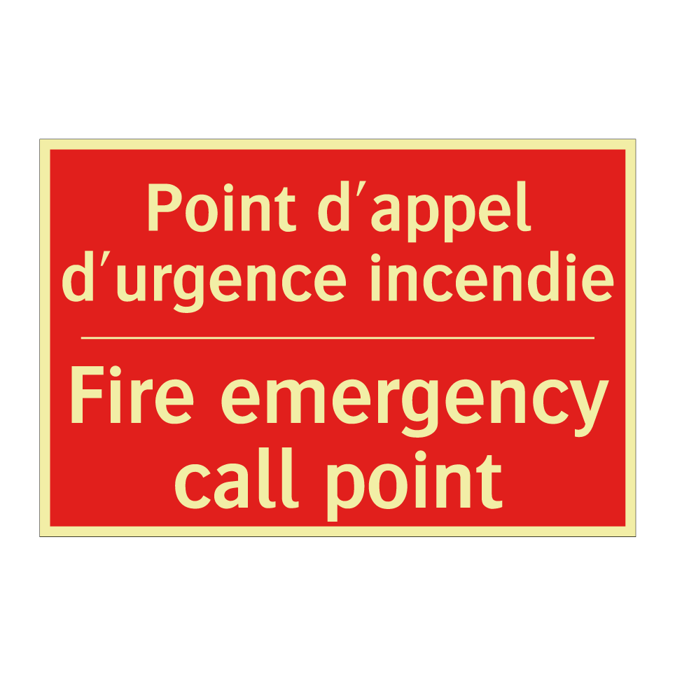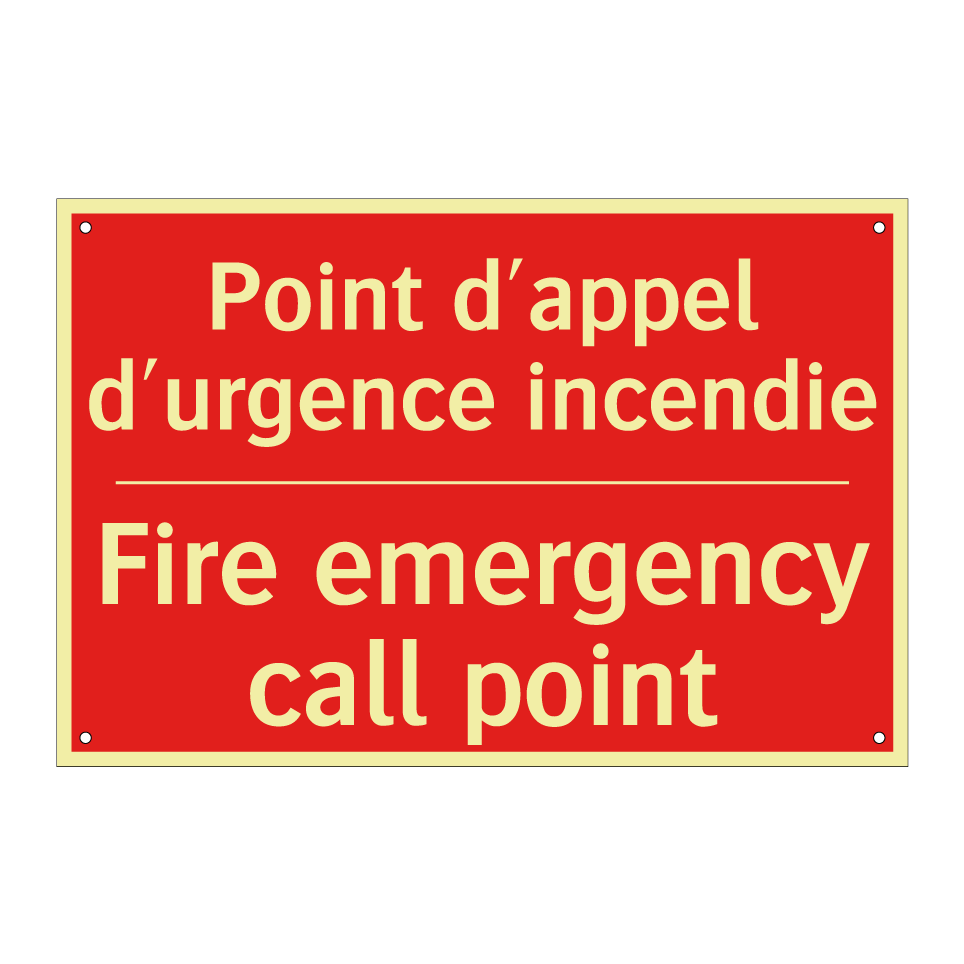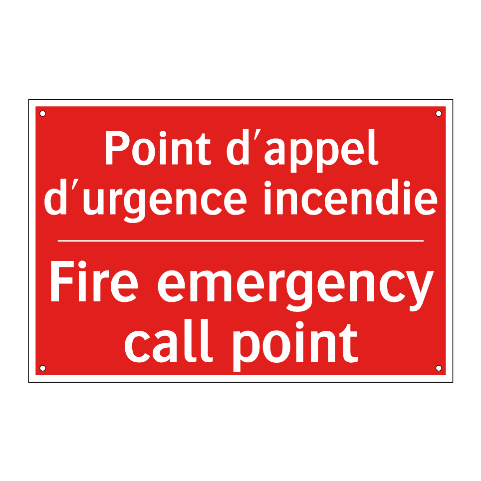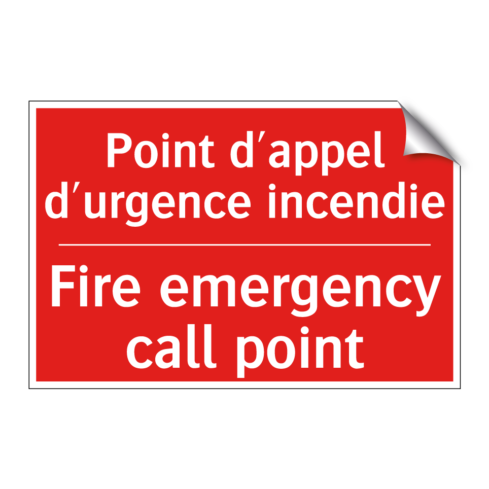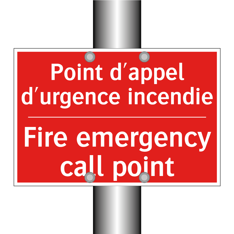 Panneau de signalisation incendie bilingue avec texte en français : "Point d'appel d'urgence incendie", et en anglais : "Fire emergency call point"