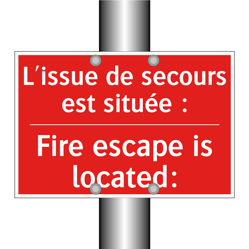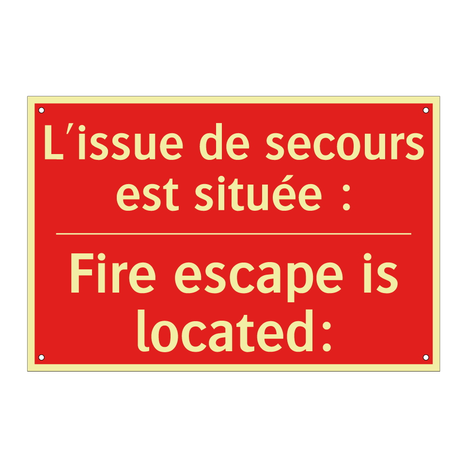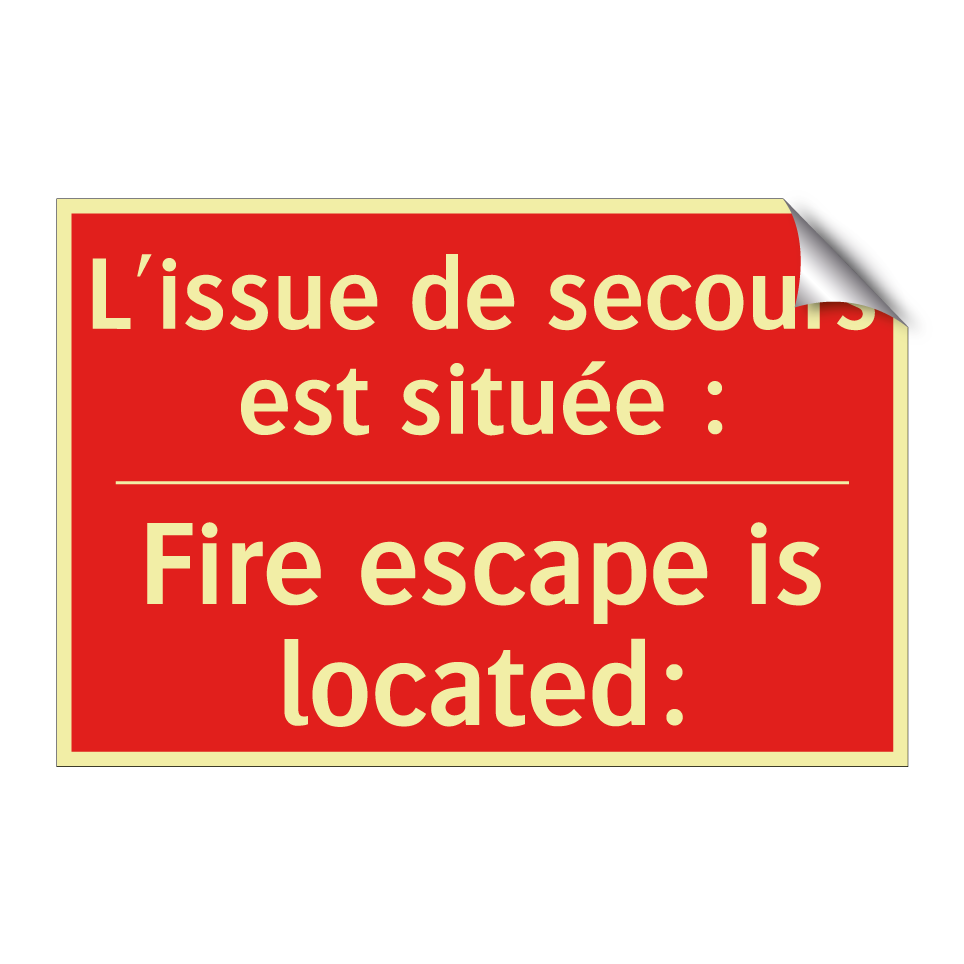 Panneau de signalisation incendie bilingue avec texte en français : "L'issue de secours est située :", et en anglais : "Fire escape is located:"