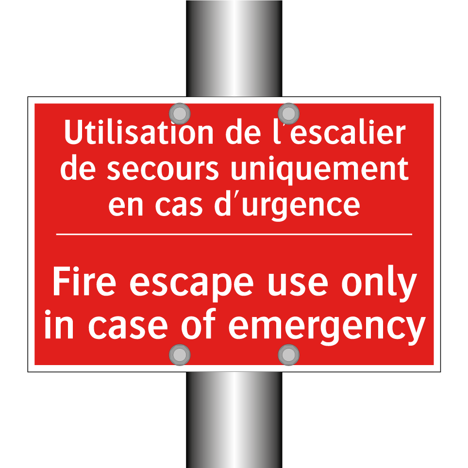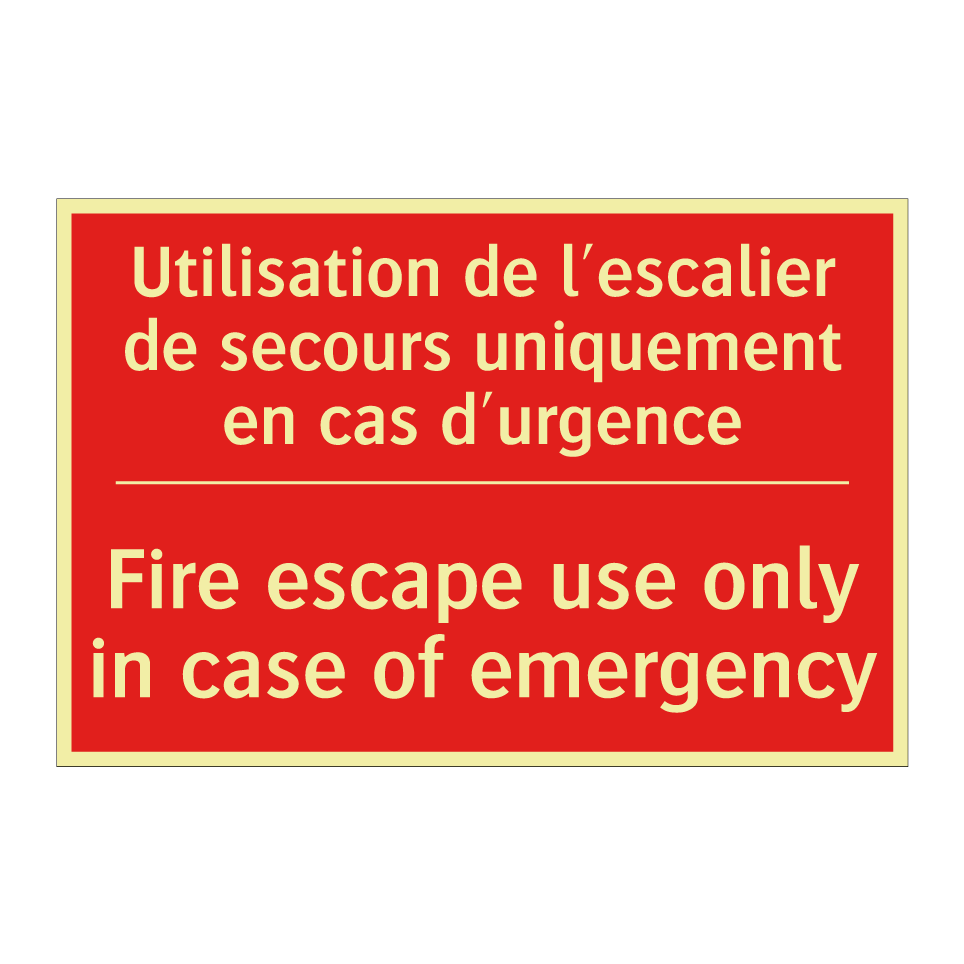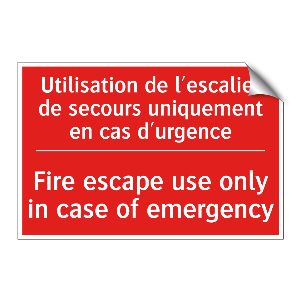 Panneau de signalisation incendie bilingue avec texte en français : "Utilisation de l'escalier de secours uniquement en cas d'urgence", et en anglais : "Fire escape use only in case of emergency"