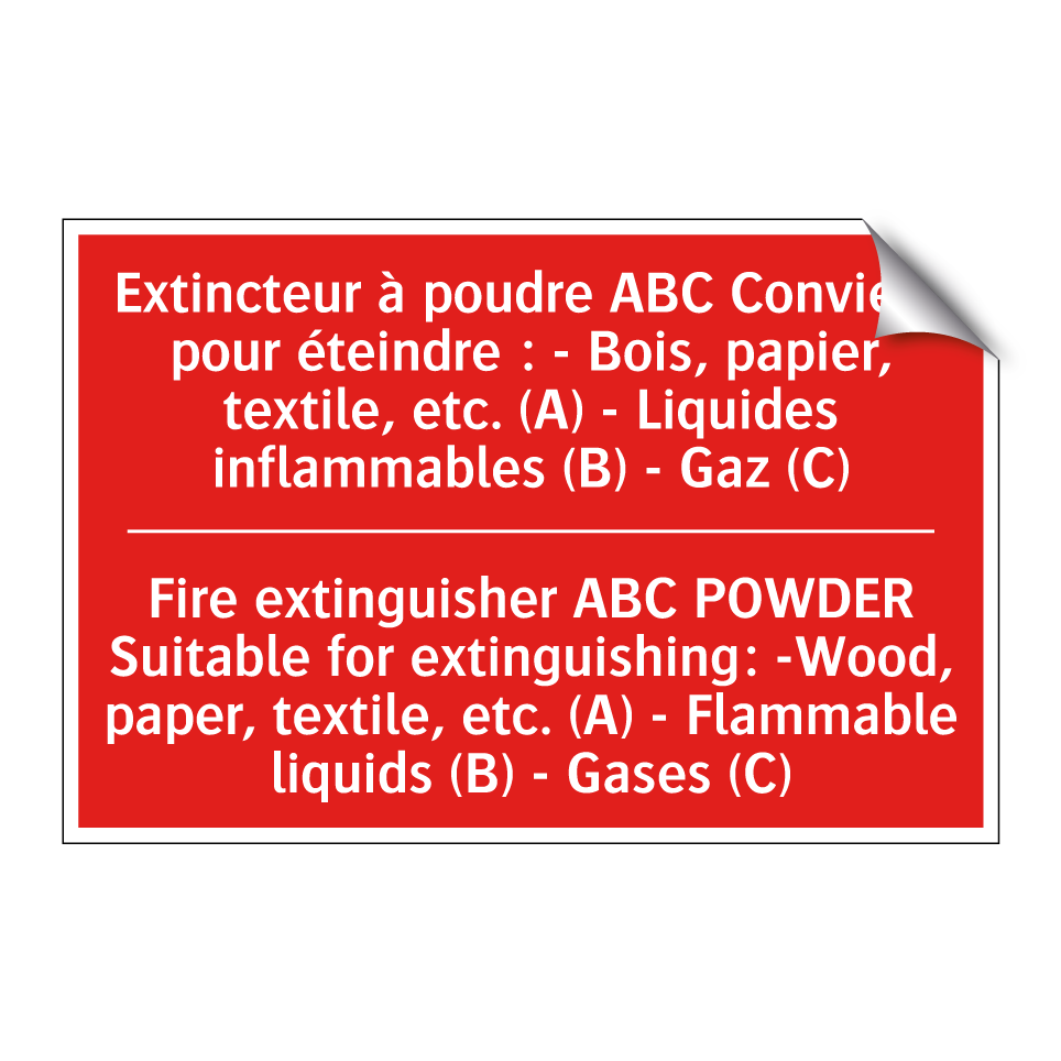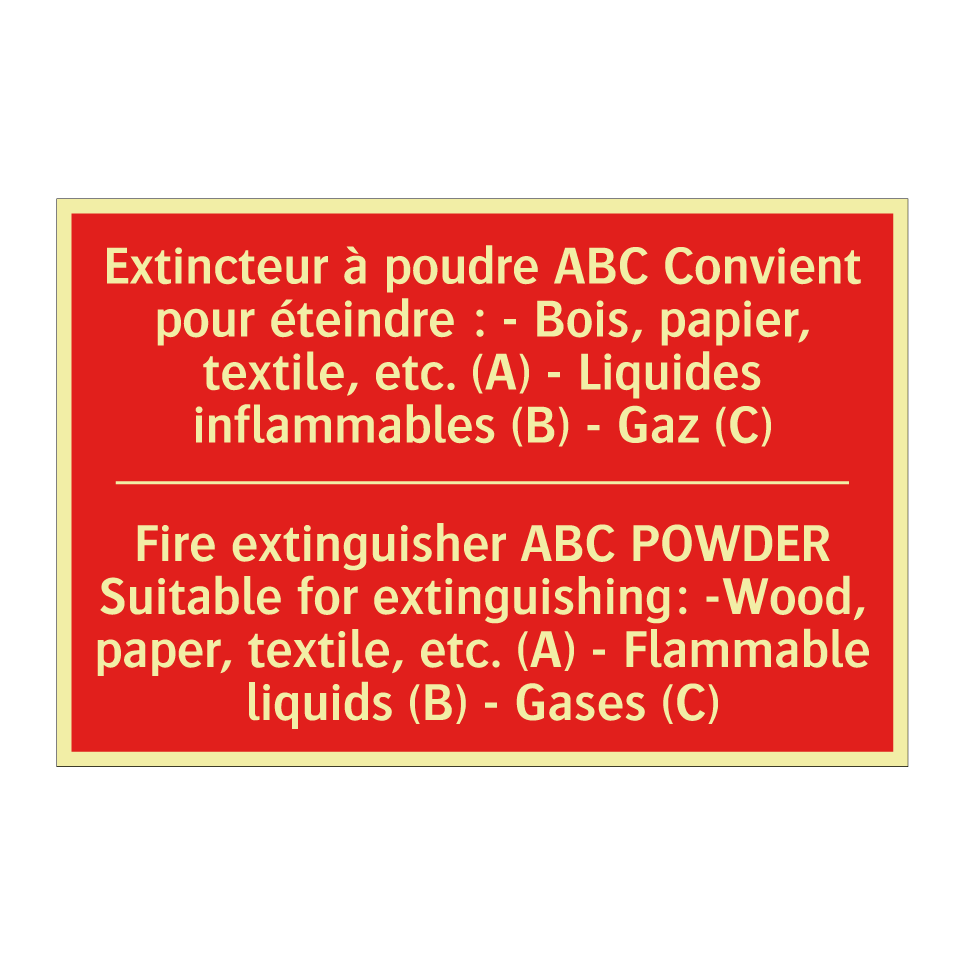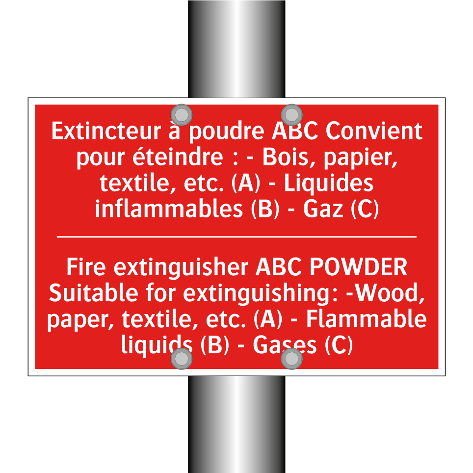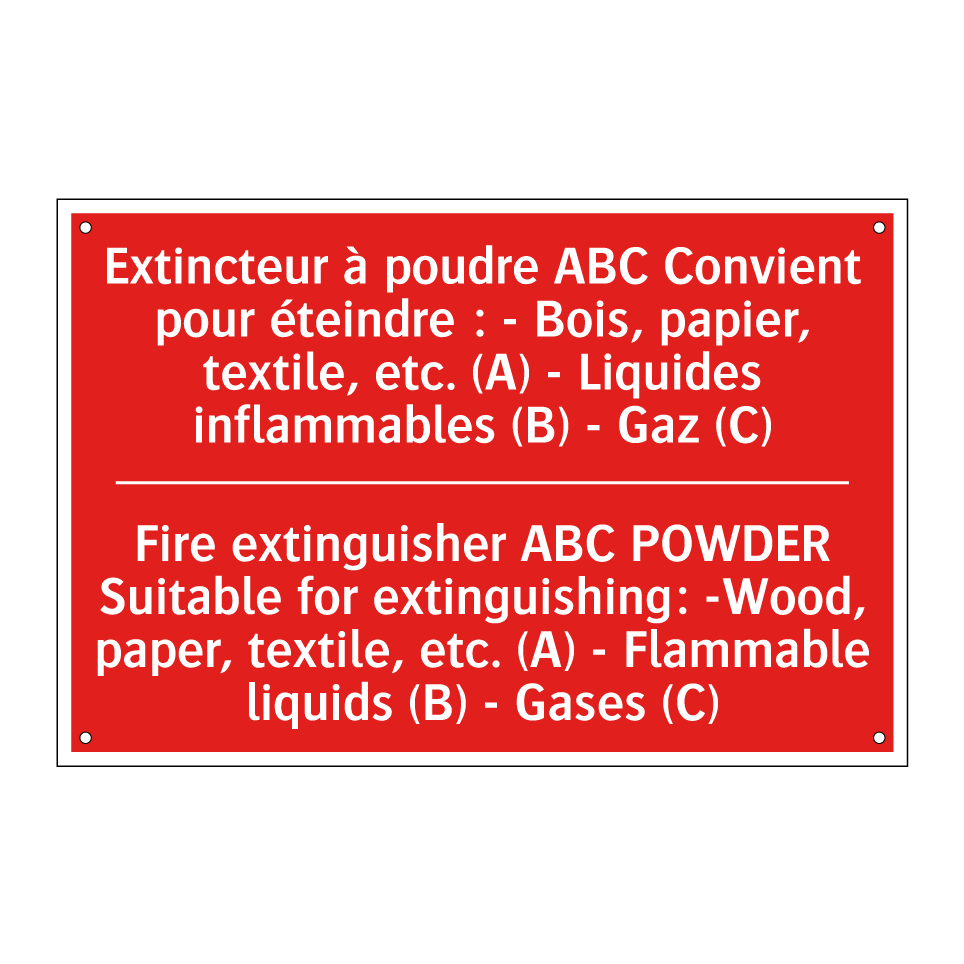Panneau de signalisation incendie bilingue avec texte en français : "Extincteur à poudre ABC Convient pour éteindre : - Bois, papier, textile, etc. (A) - Liquides inflammables (B) - Gaz (C)", et en anglais : "Fire extinguisher ABC POWDER Suitable for extinguishing: -Wood, paper, textile, etc. (A) - Flammable liquids (B) - Gases (C)"