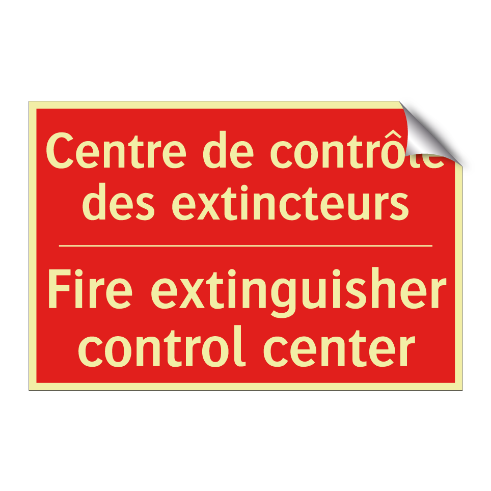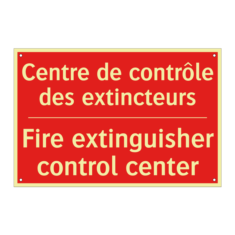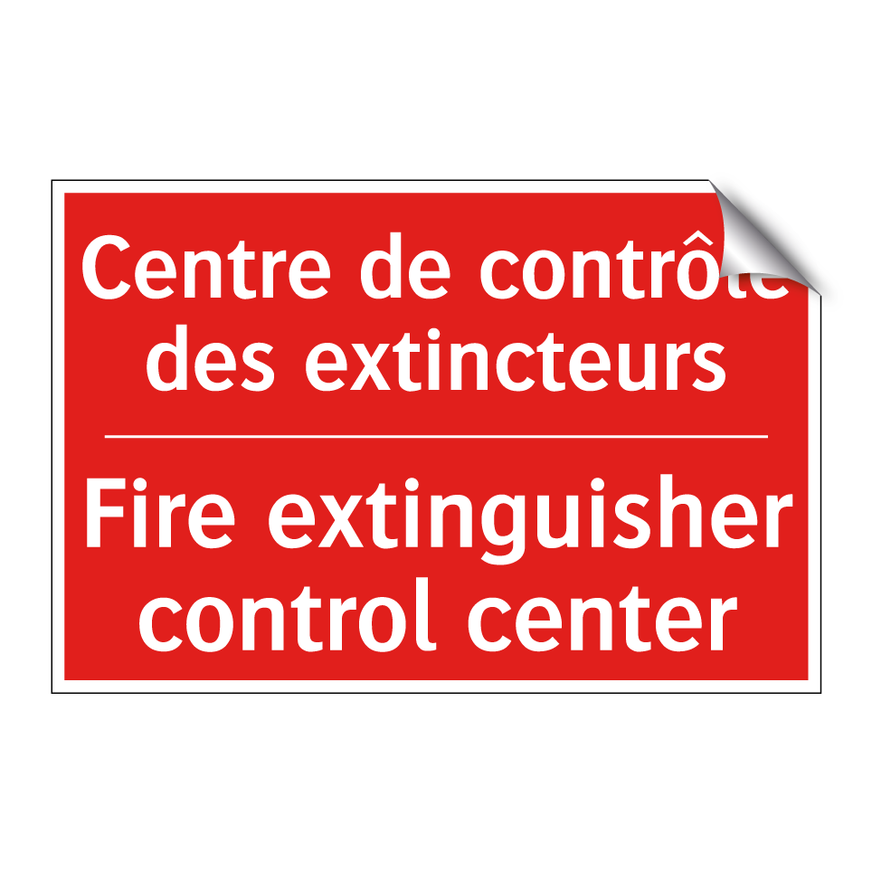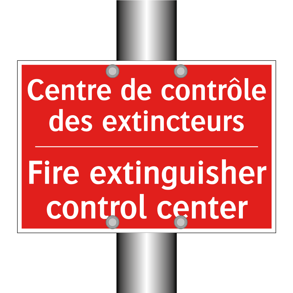 Panneau de signalisation incendie bilingue avec texte en français : "Centre de contrôle des extincteurs", et en anglais : "Fire extinguisher control center"