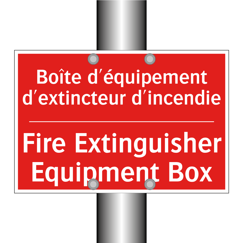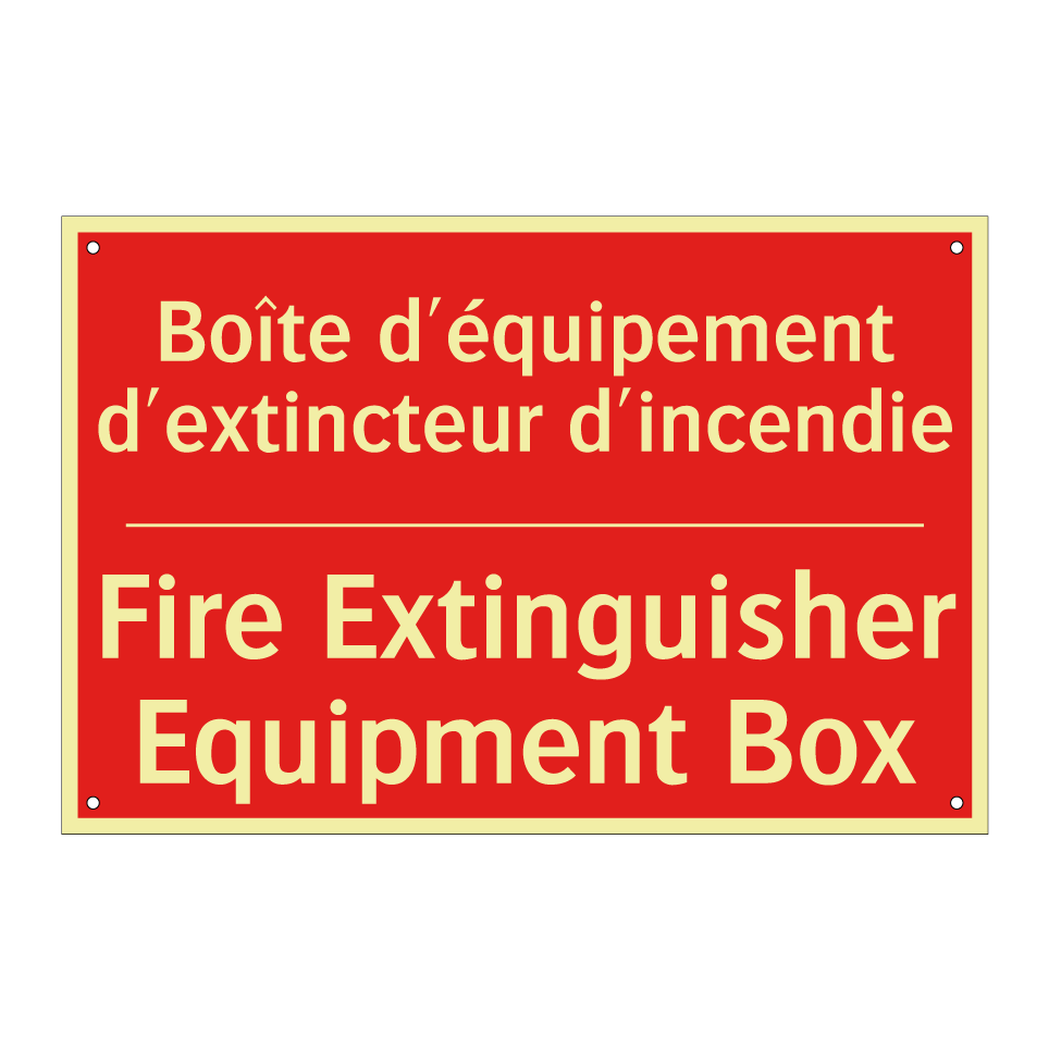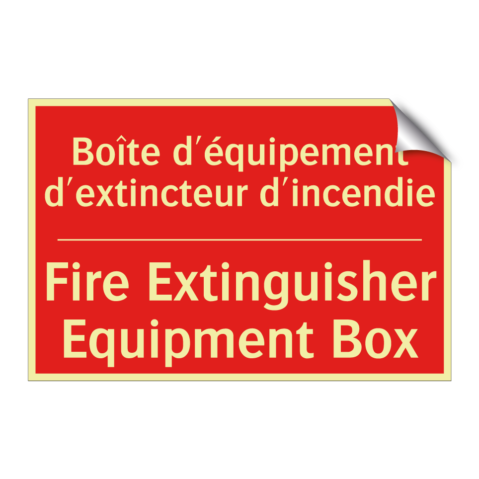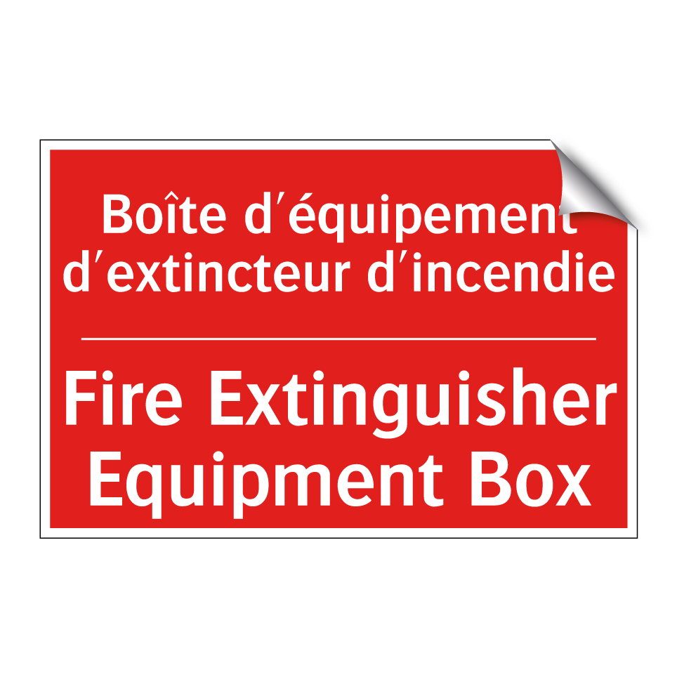 Panneau de signalisation incendie bilingue avec texte en français : "Boîte d'équipement d'extincteur d'incendie", et en anglais : "Fire Extinguisher Equipment Box"