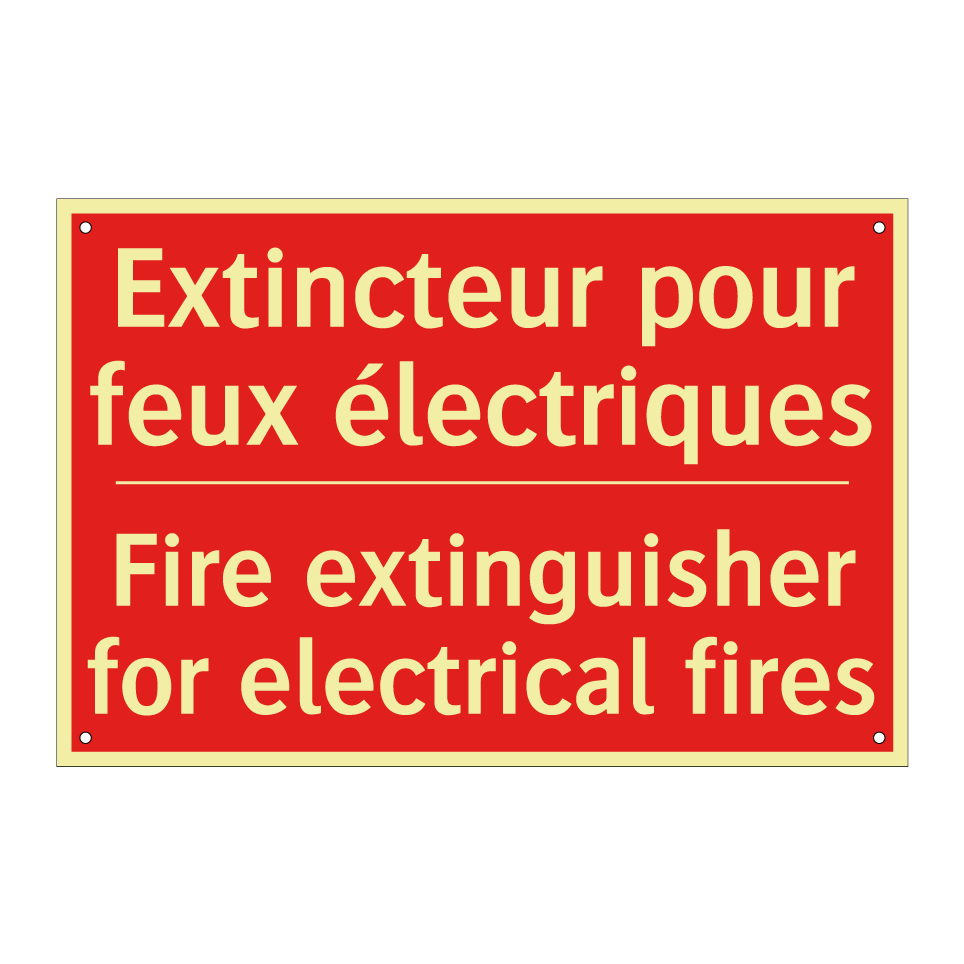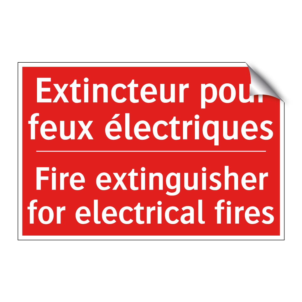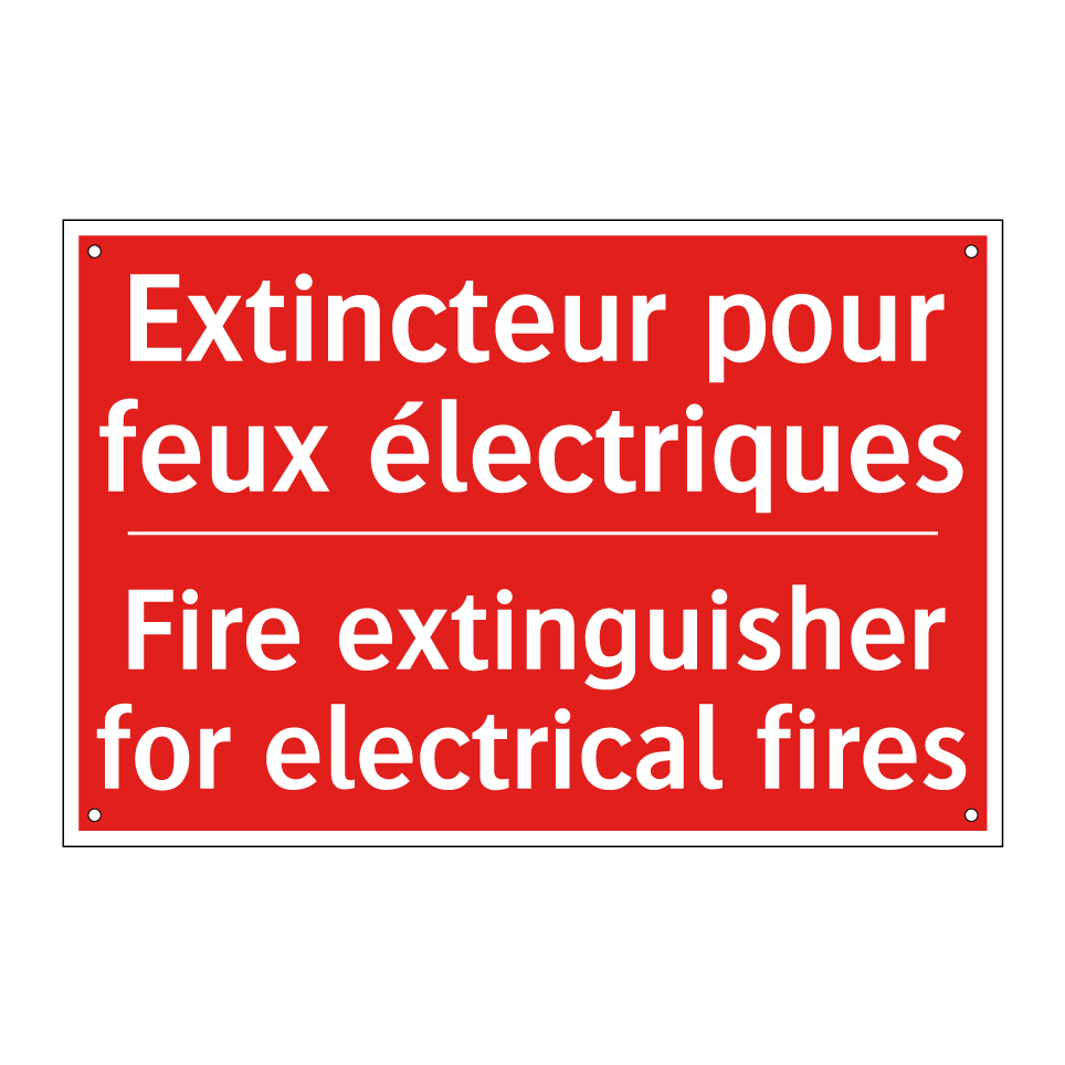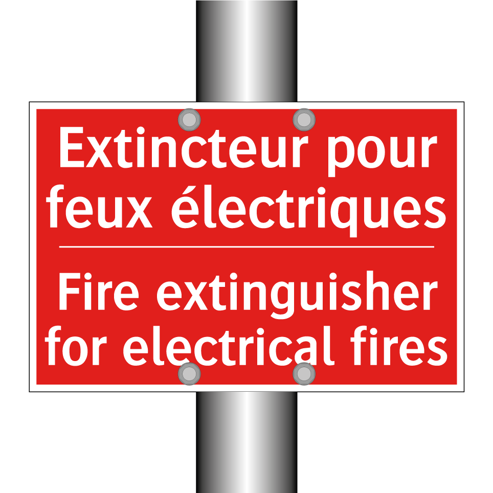 Panneau de signalisation incendie bilingue avec texte en français : "Extincteur pour feux électriques", et en anglais : "Fire extinguisher for electrical fires"