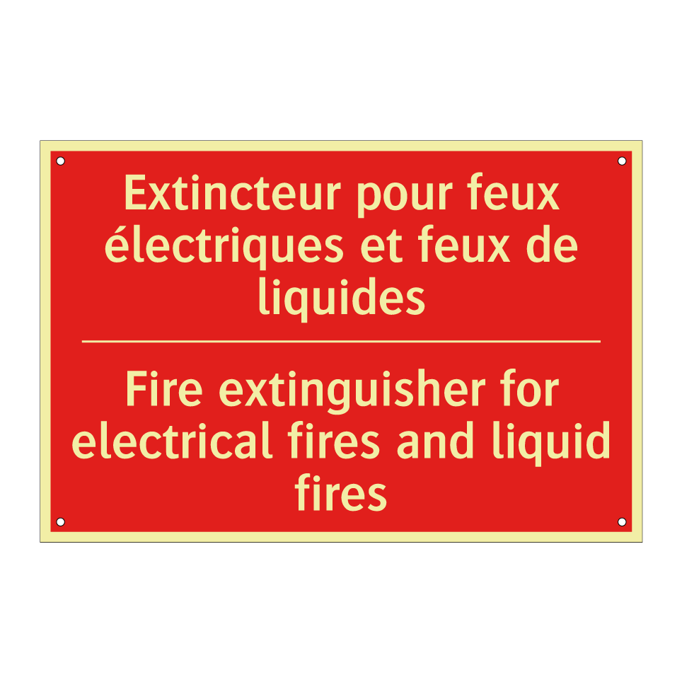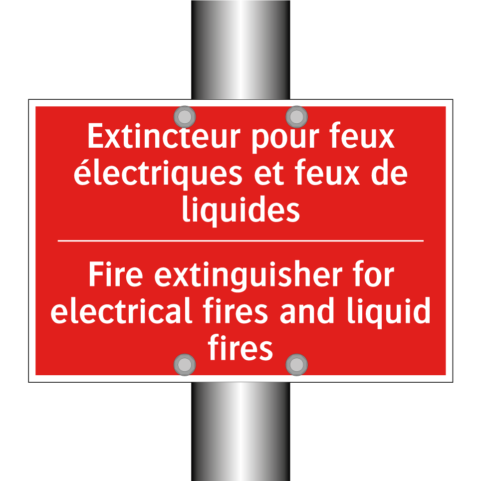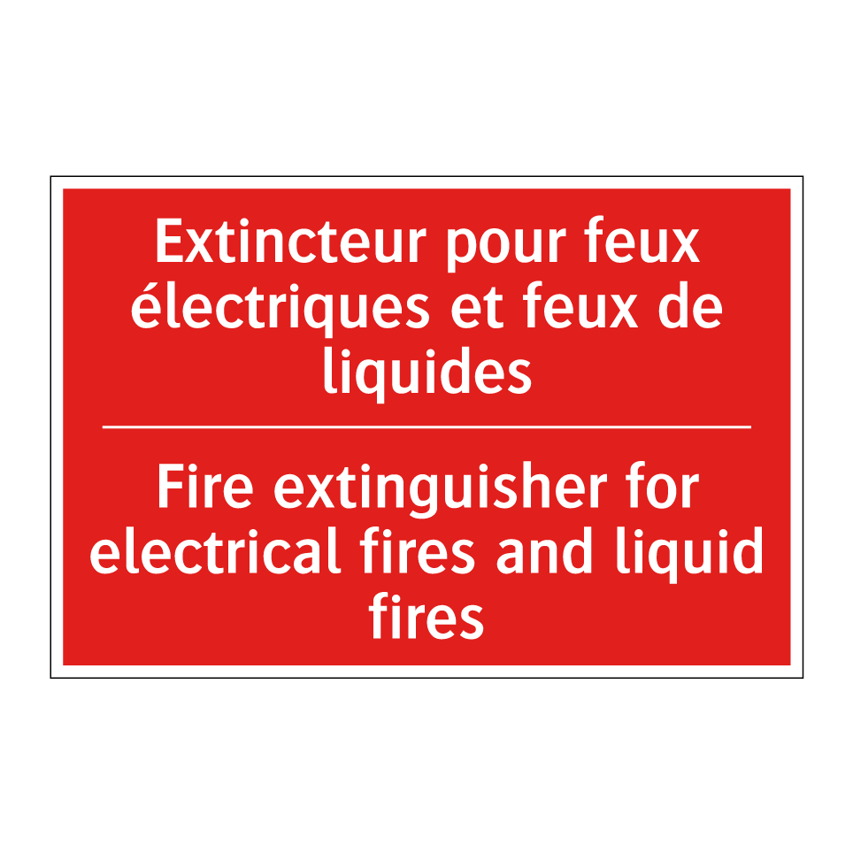 Panneau de signalisation incendie bilingue avec texte en français : "Extincteur pour feux électriques et feux de liquides", et en anglais : "Fire extinguisher for electrical fires and liquid fires"