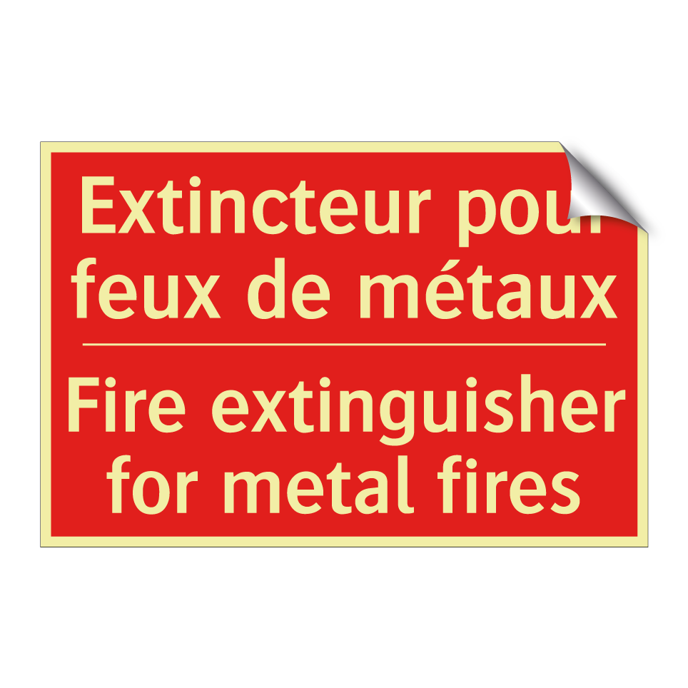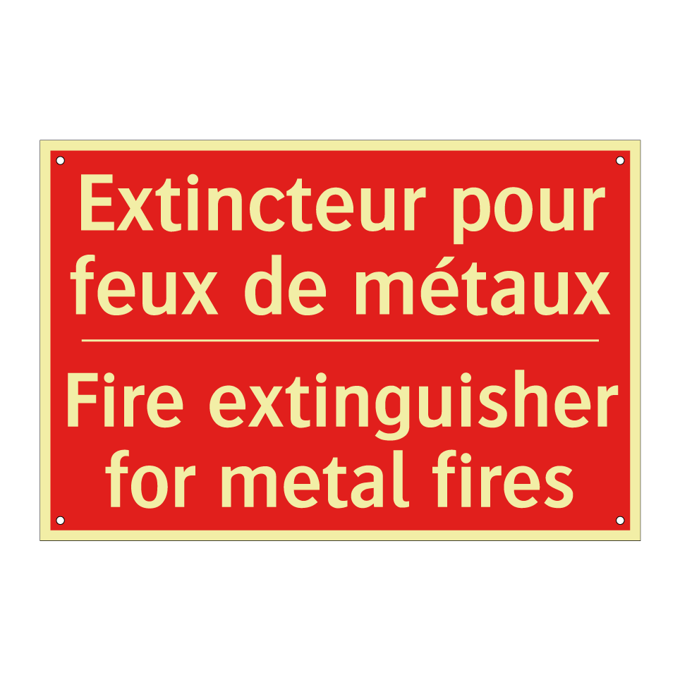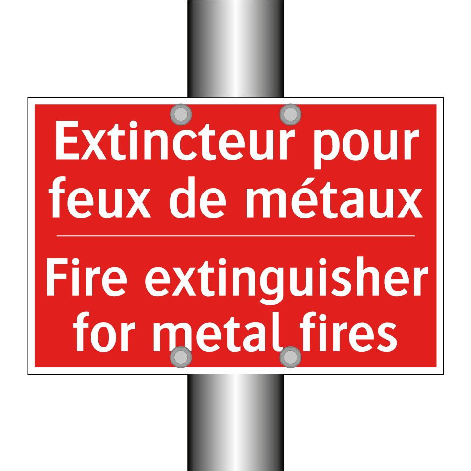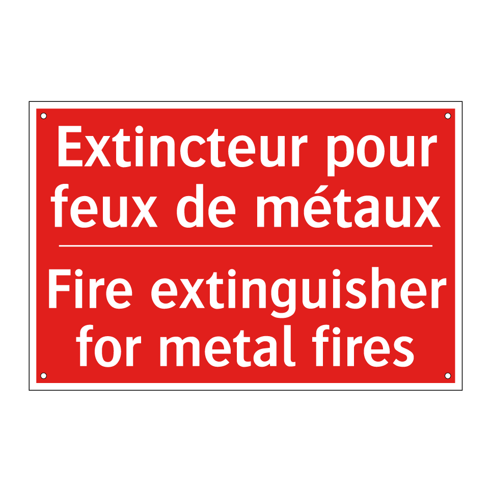 Panneau de signalisation incendie bilingue avec texte en français : "Extincteur pour feux de métaux", et en anglais : "Fire extinguisher for metal fires"