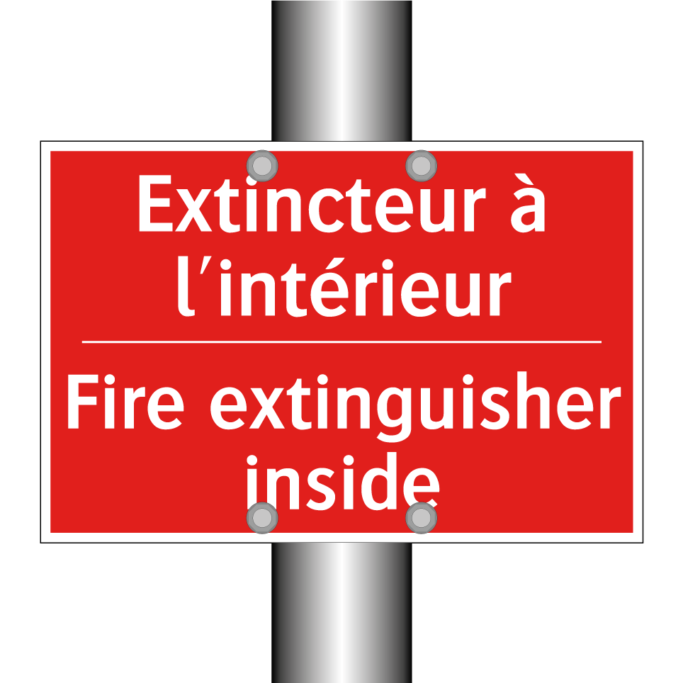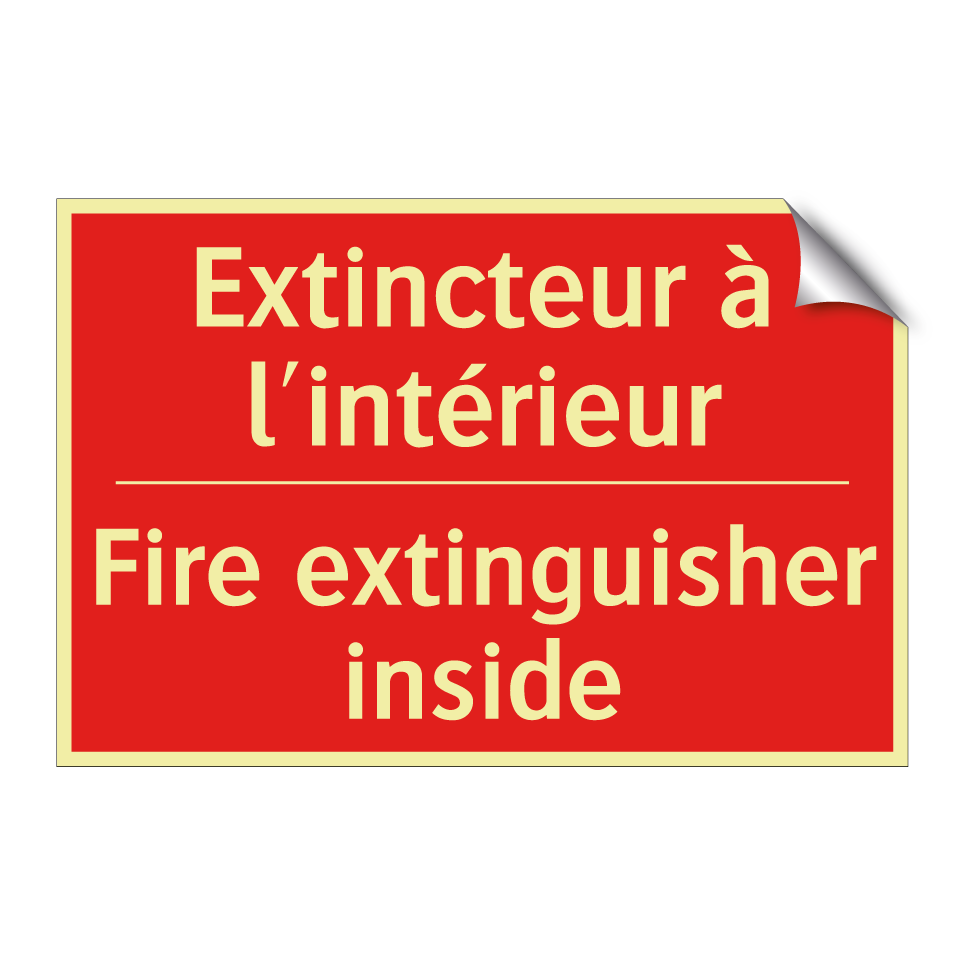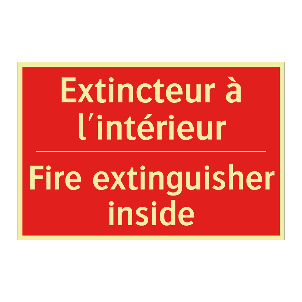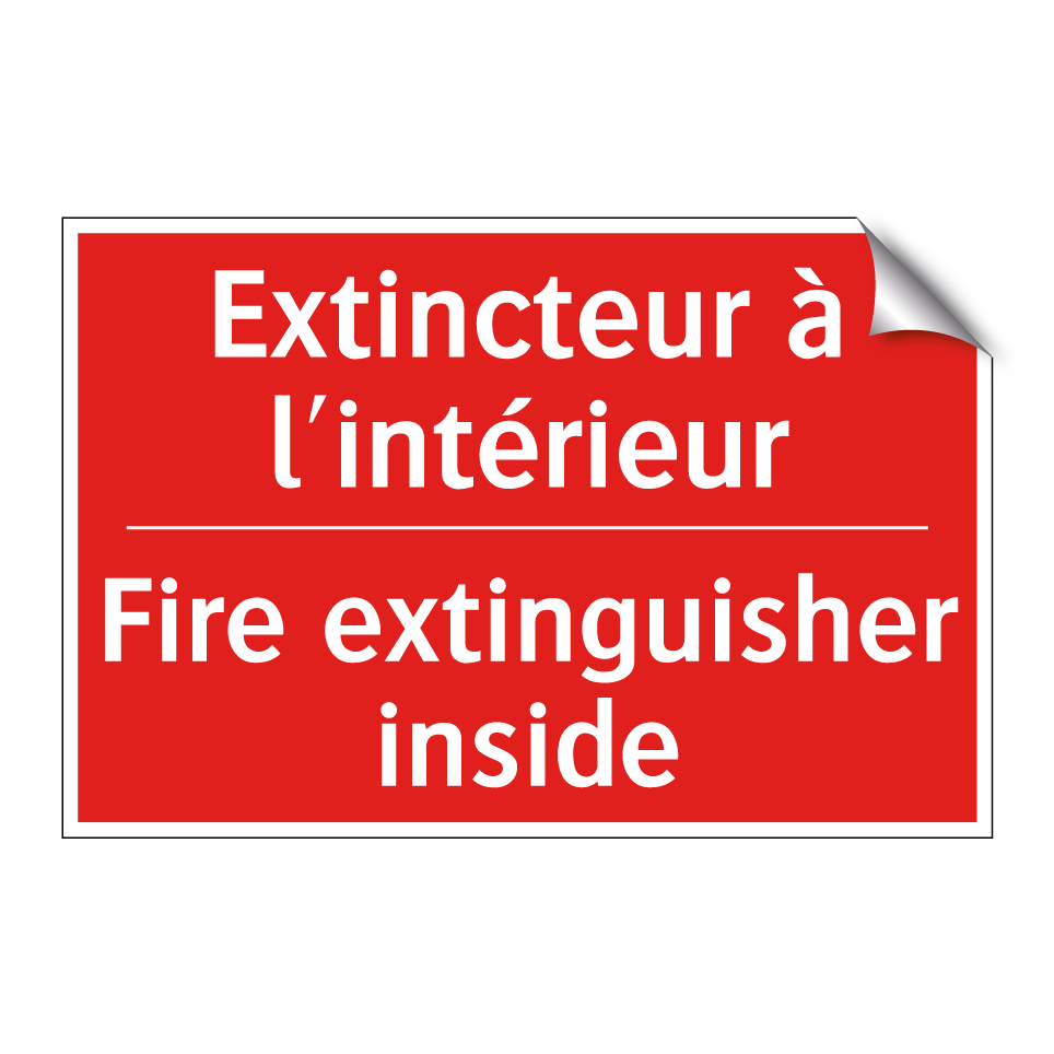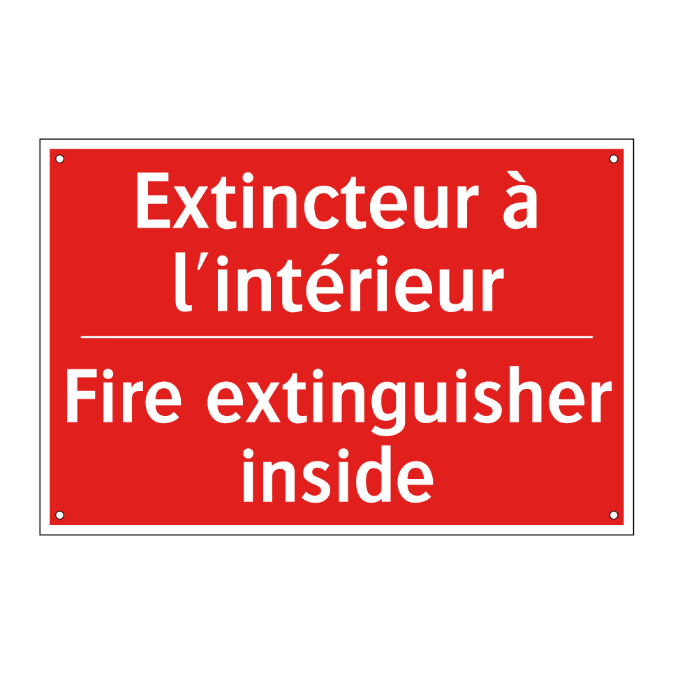 Panneau de signalisation incendie bilingue avec texte en français : "Extincteur à l'intérieur", et en anglais : "Fire extinguisher inside"