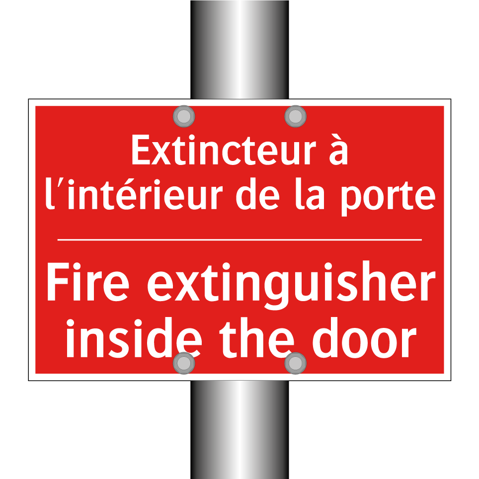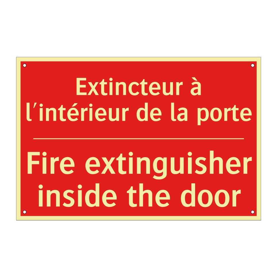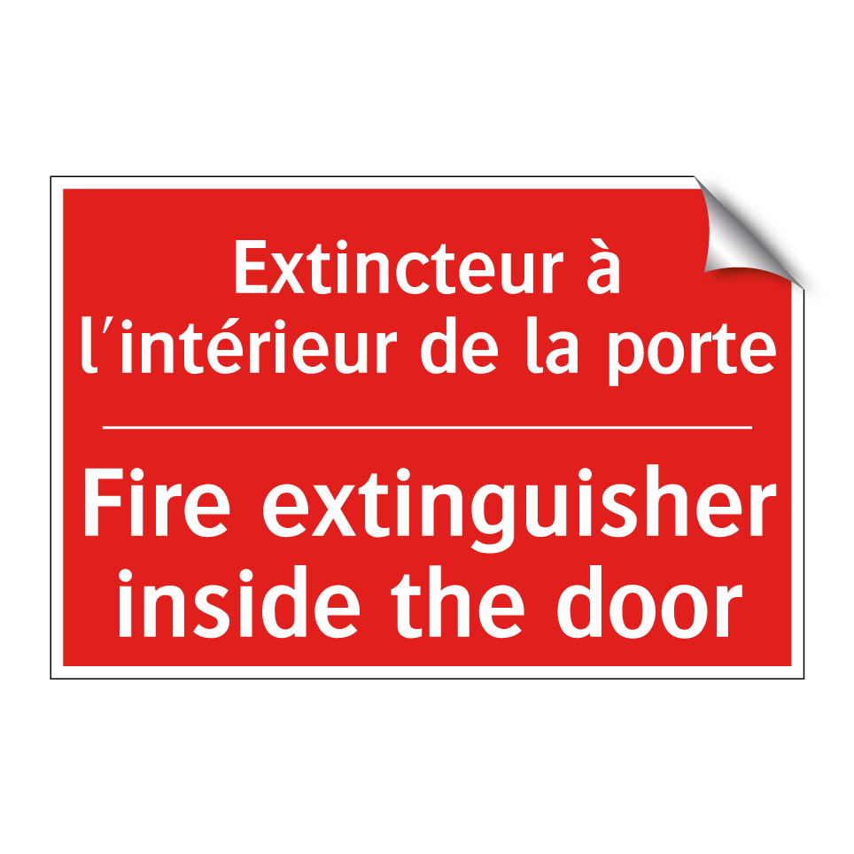 Panneau de signalisation incendie bilingue avec texte en français : "Extincteur à l'intérieur de la porte", et en anglais : "Fire extinguisher inside the door"