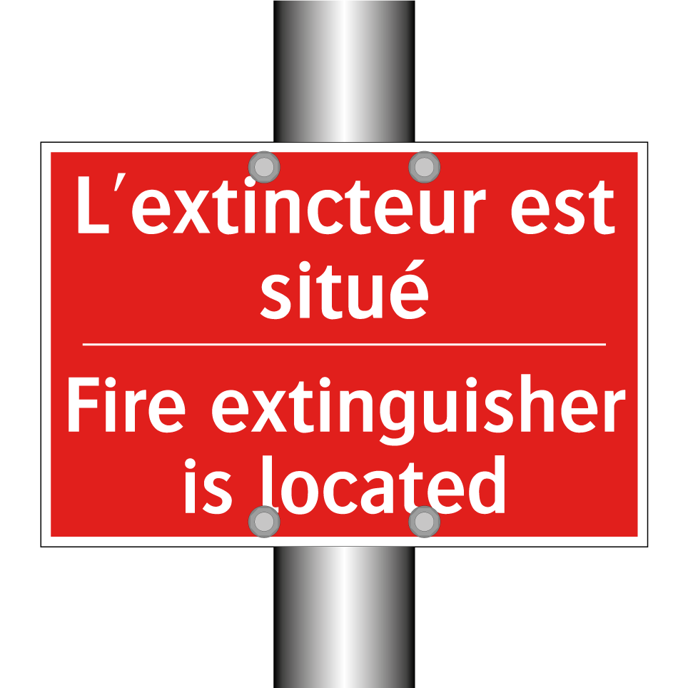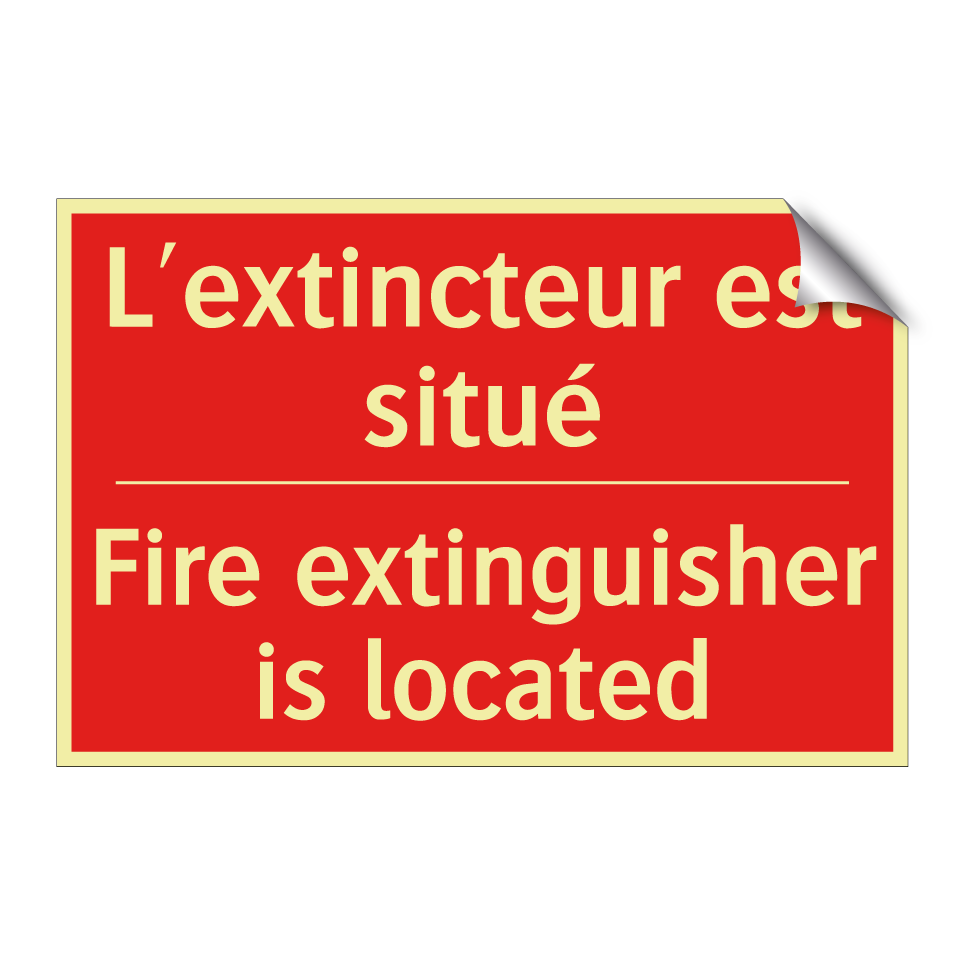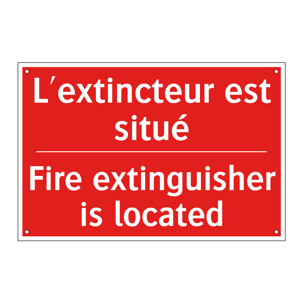 Panneau de signalisation incendie bilingue avec texte en français : "L'extincteur est situé", et en anglais : "Fire extinguisher is located"