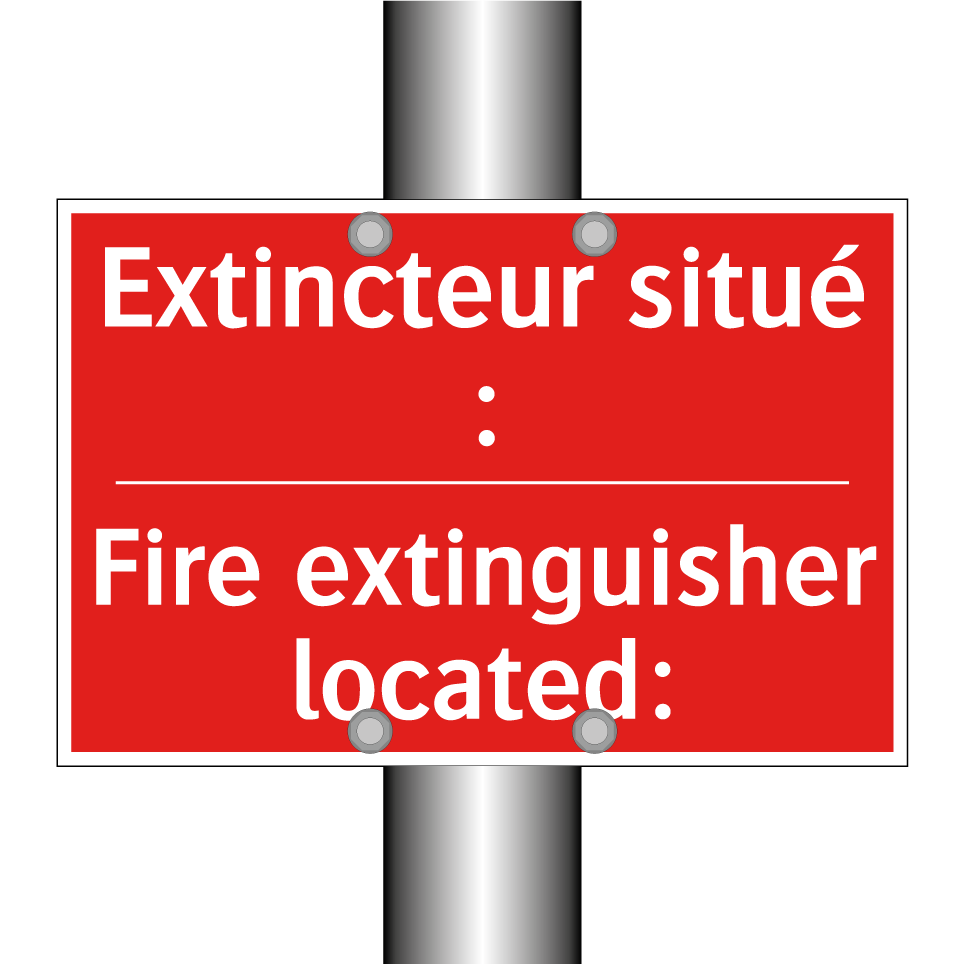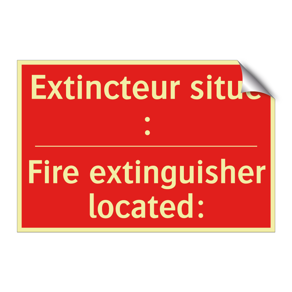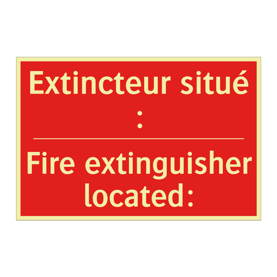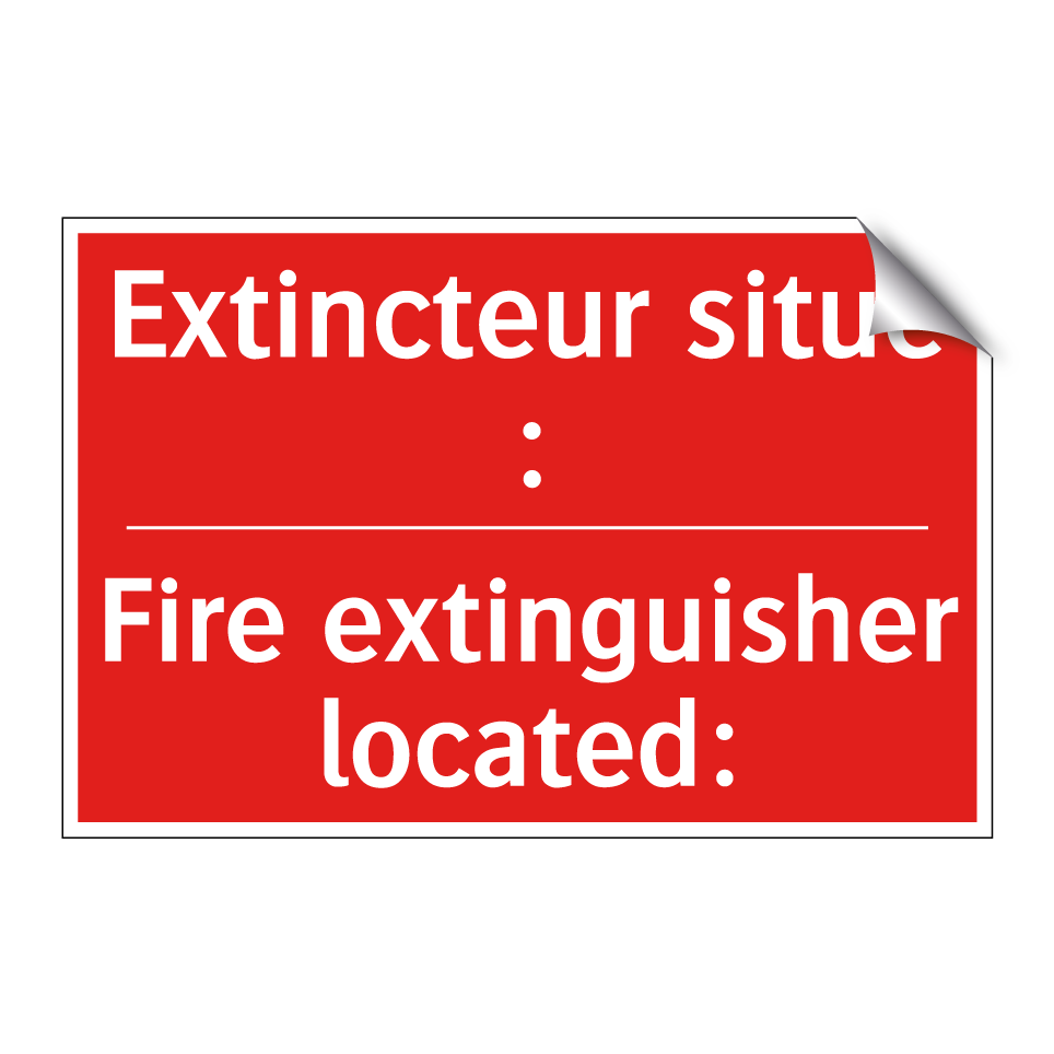 Panneau de signalisation incendie bilingue avec texte en français : "Extincteur situé :", et en anglais : "Fire extinguisher located:"